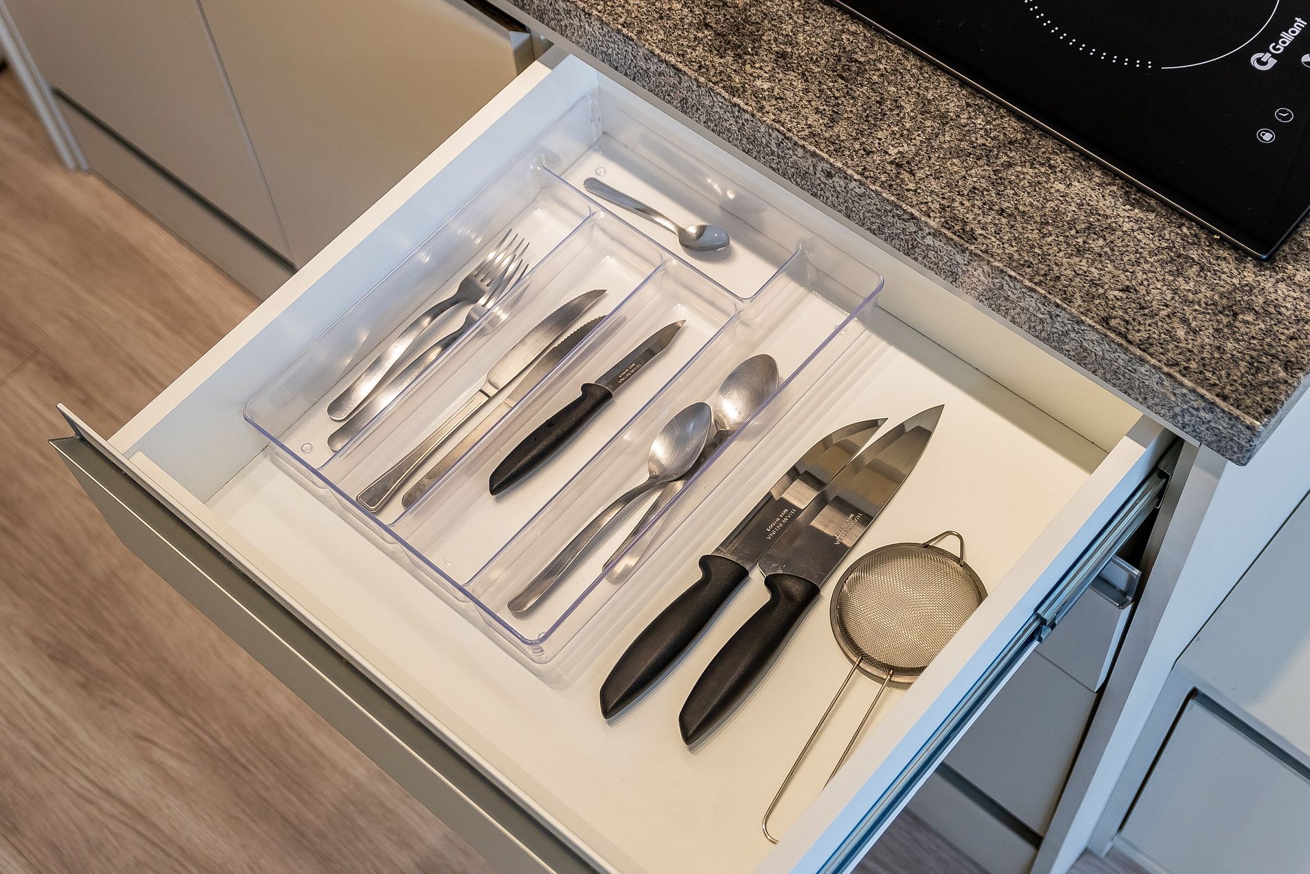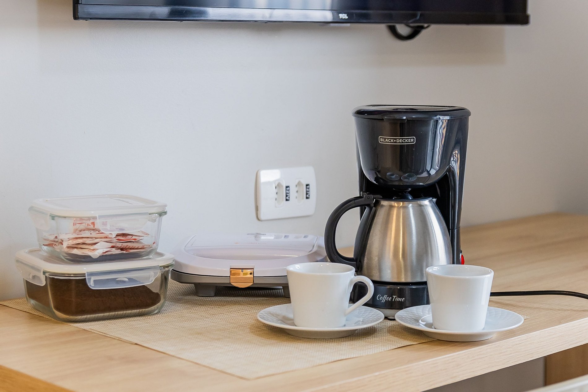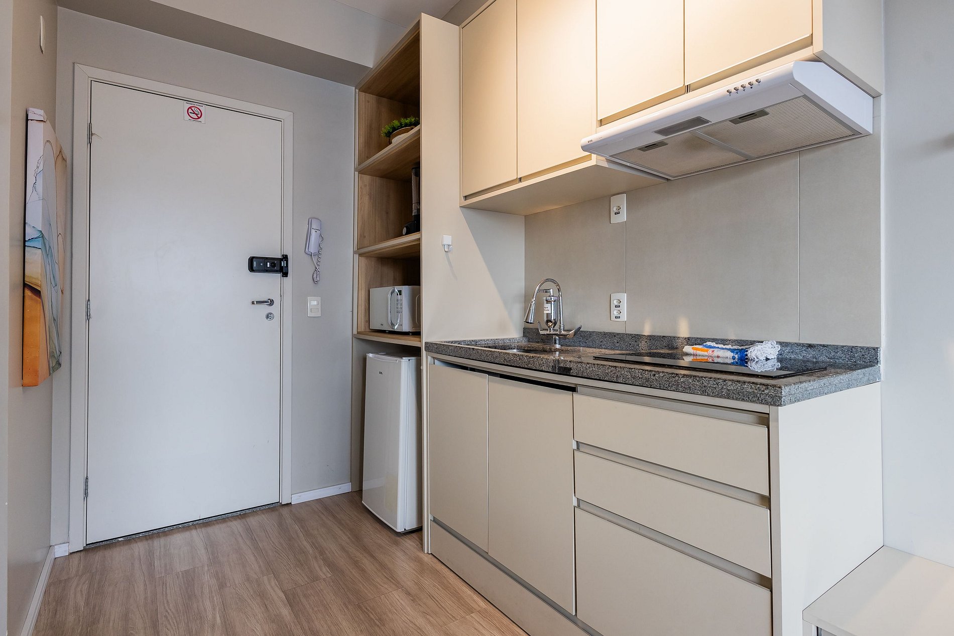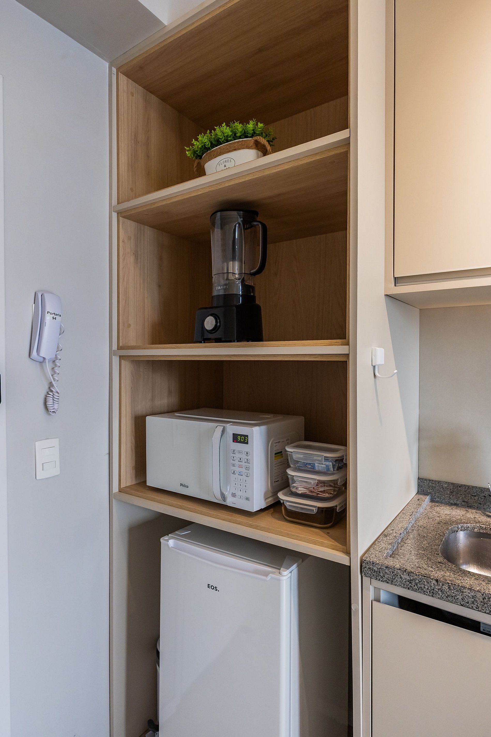 - Cozinha completa, equipada com frigobar grande, microondas e cooktop de indução de duas bocas.