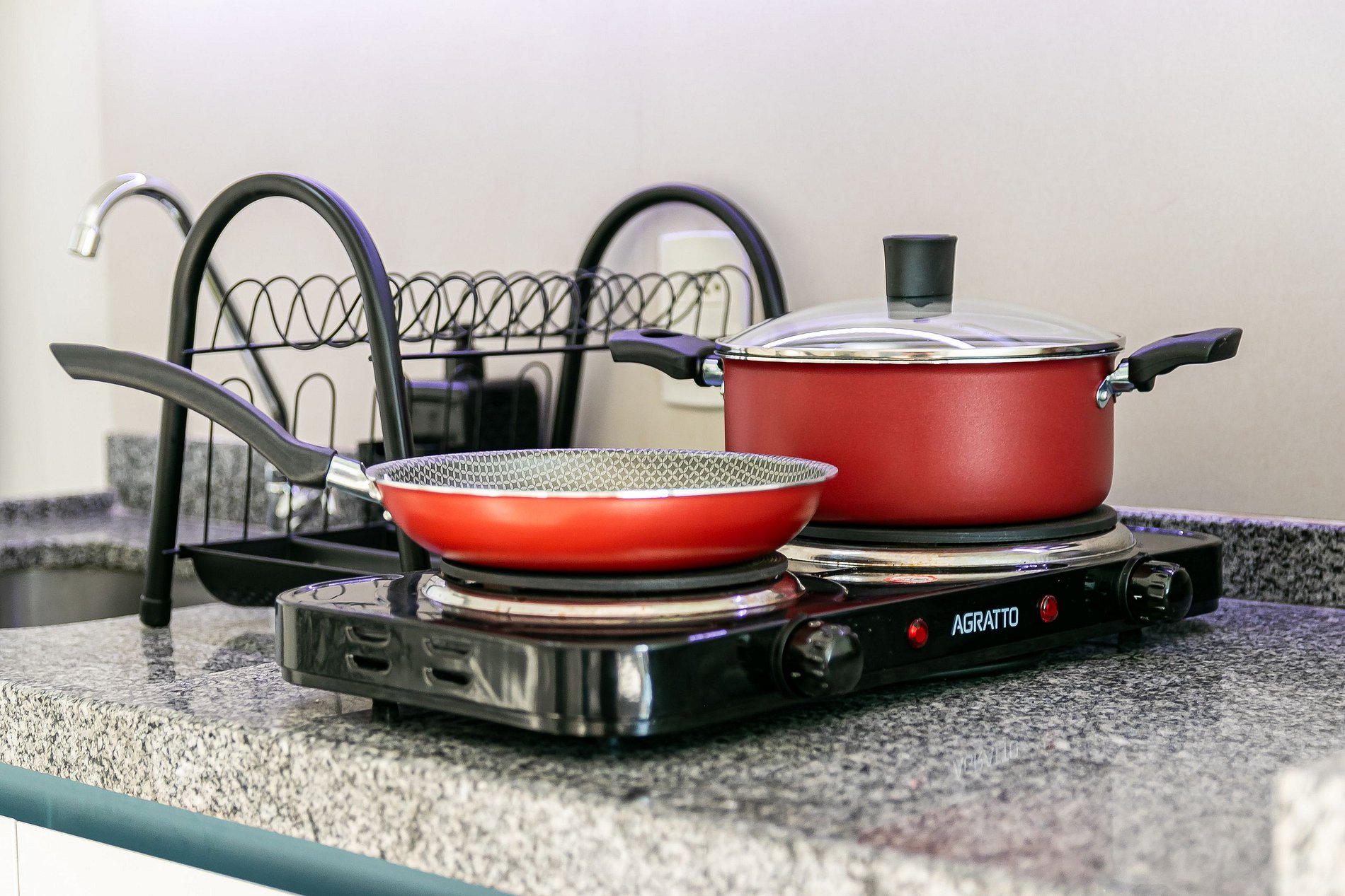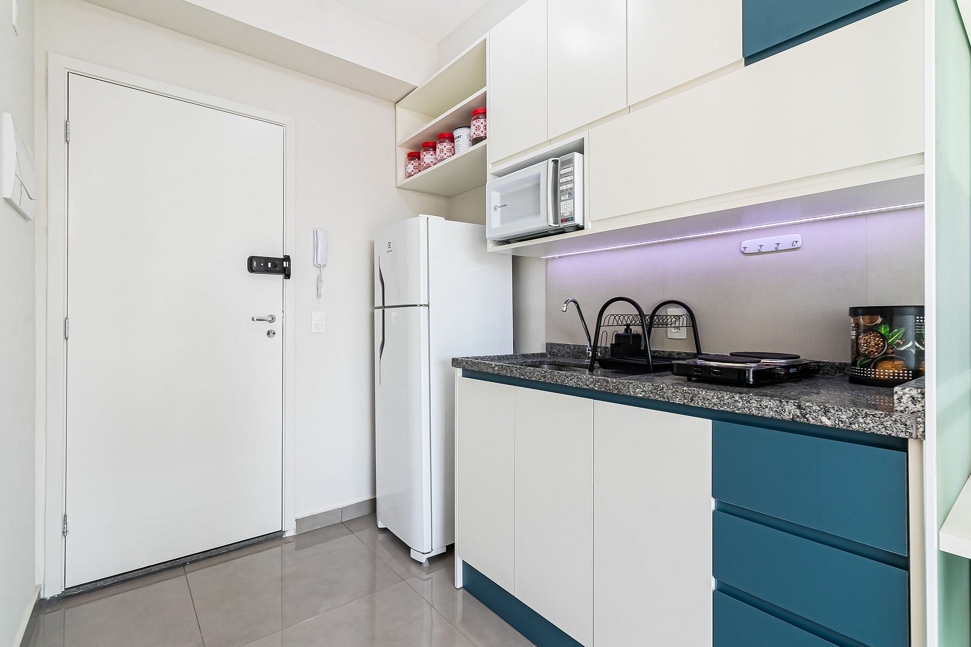 - Cozinha completa, equipada com geladeira, microondas, cooktop de duas bocas e diversos utensílios.