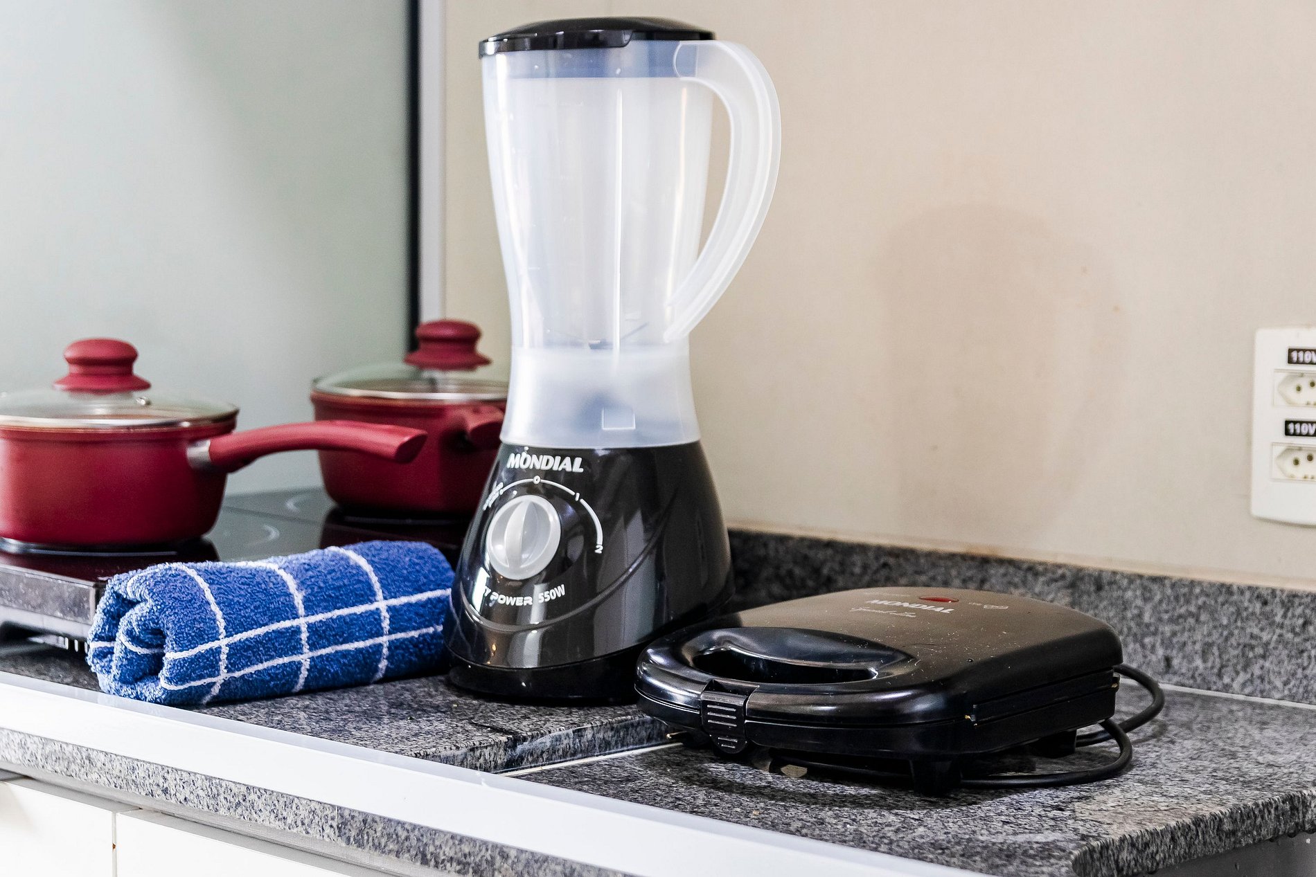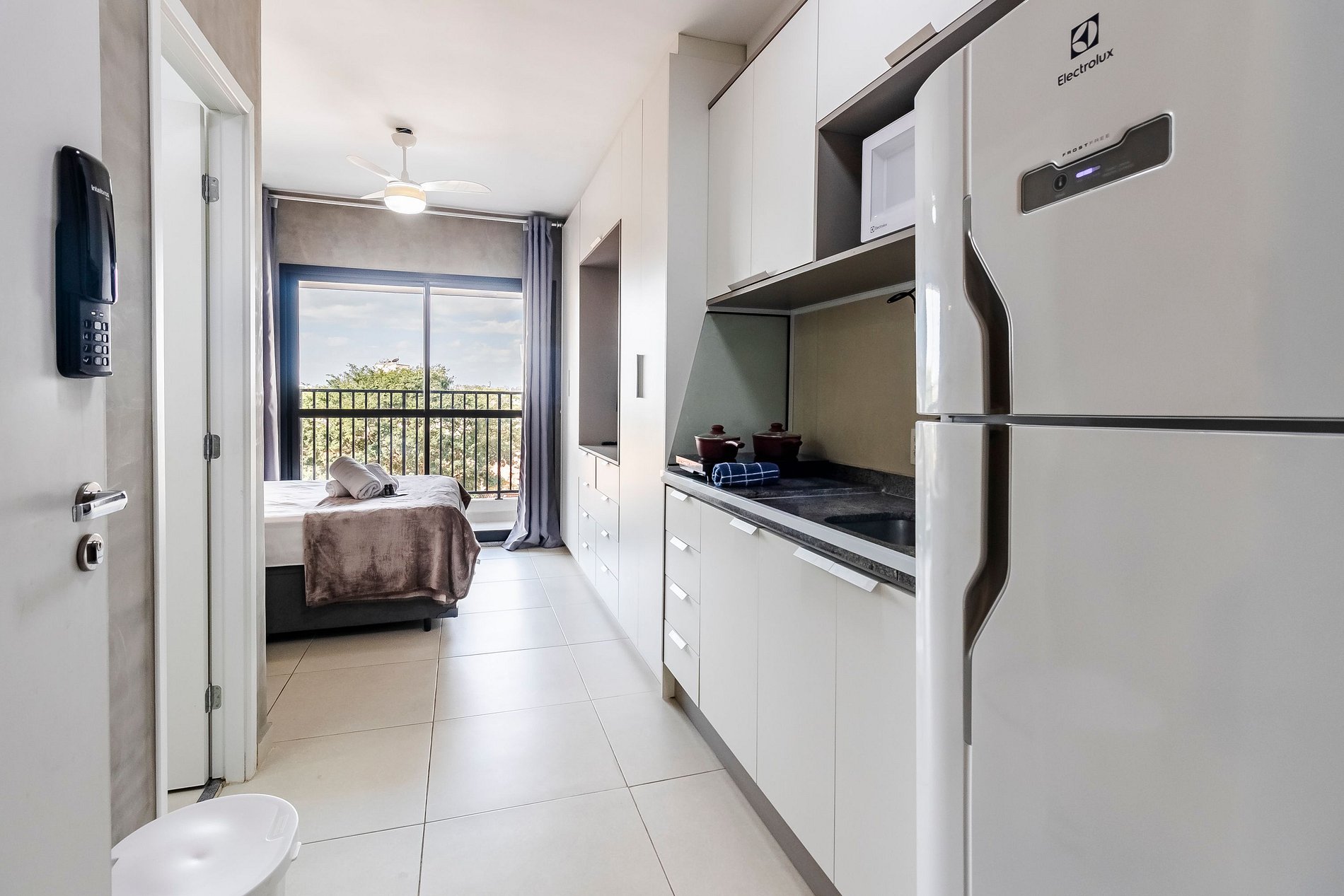 - Cozinha completa, equipada com geladeira, microondas, cooktop de indução de duas bocas.
