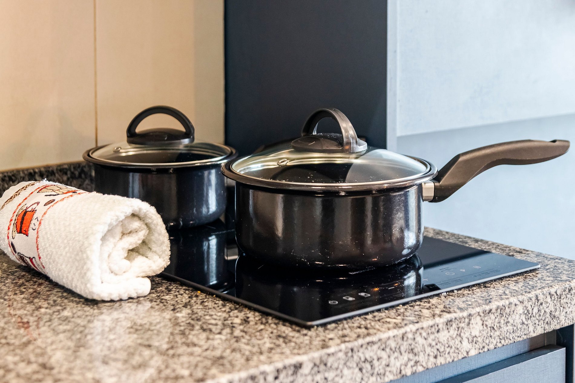 - Cozinha completa, equipada com geladeira, microondas, cafeteira, liquidificador, panelas, cooktop de indução de duas bocas e demais itens