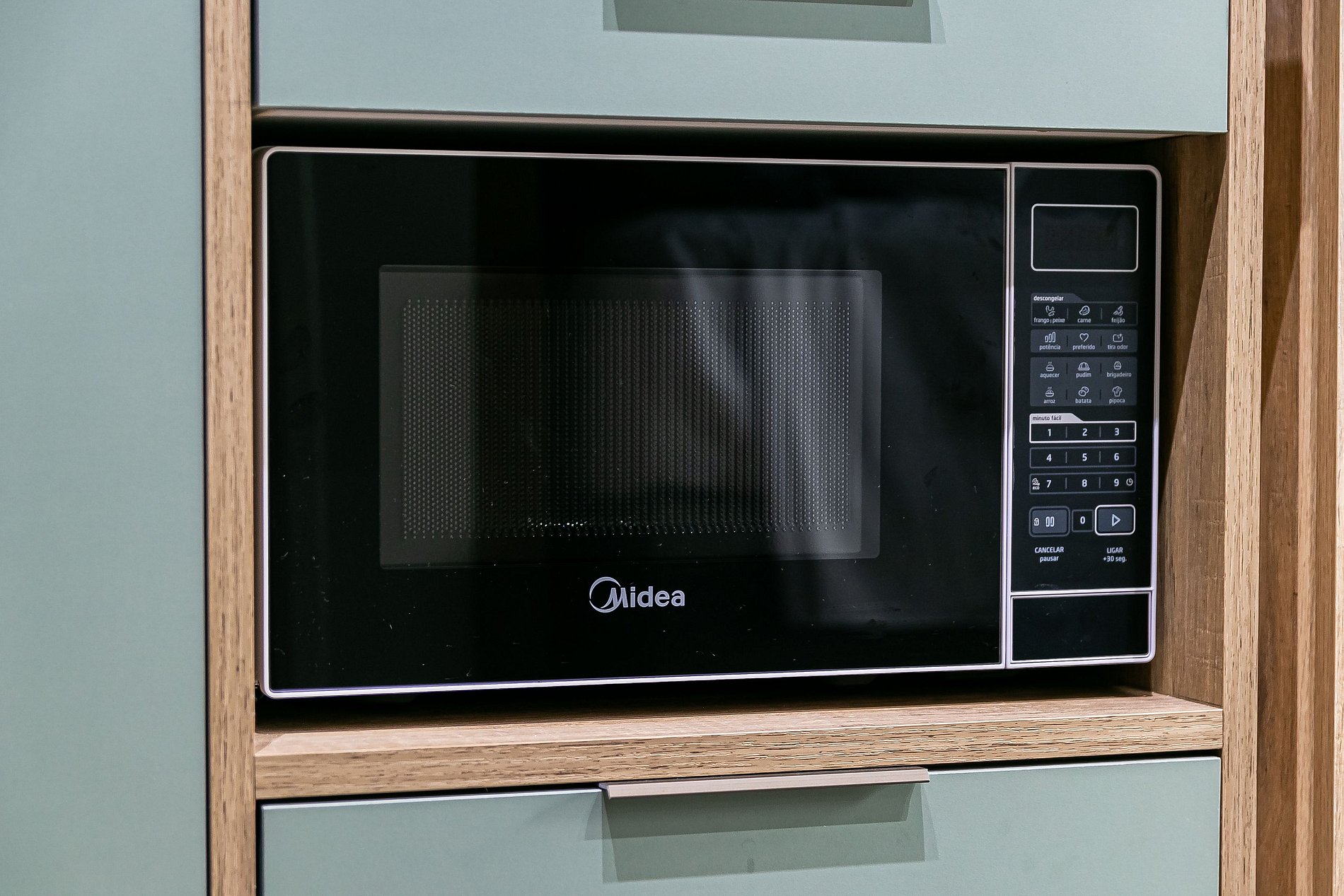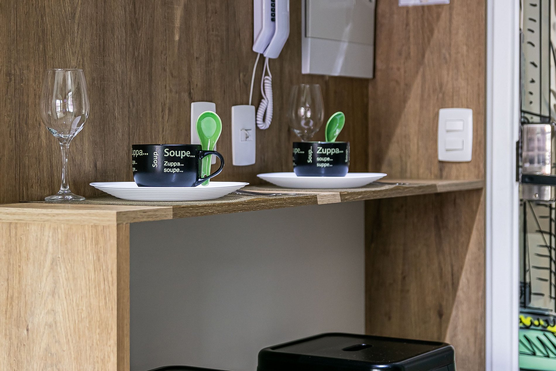 - Cozinha completa, equipada com geladeira, microondas, cooktop de indução de duas bocas, depurador e demais utensílios.