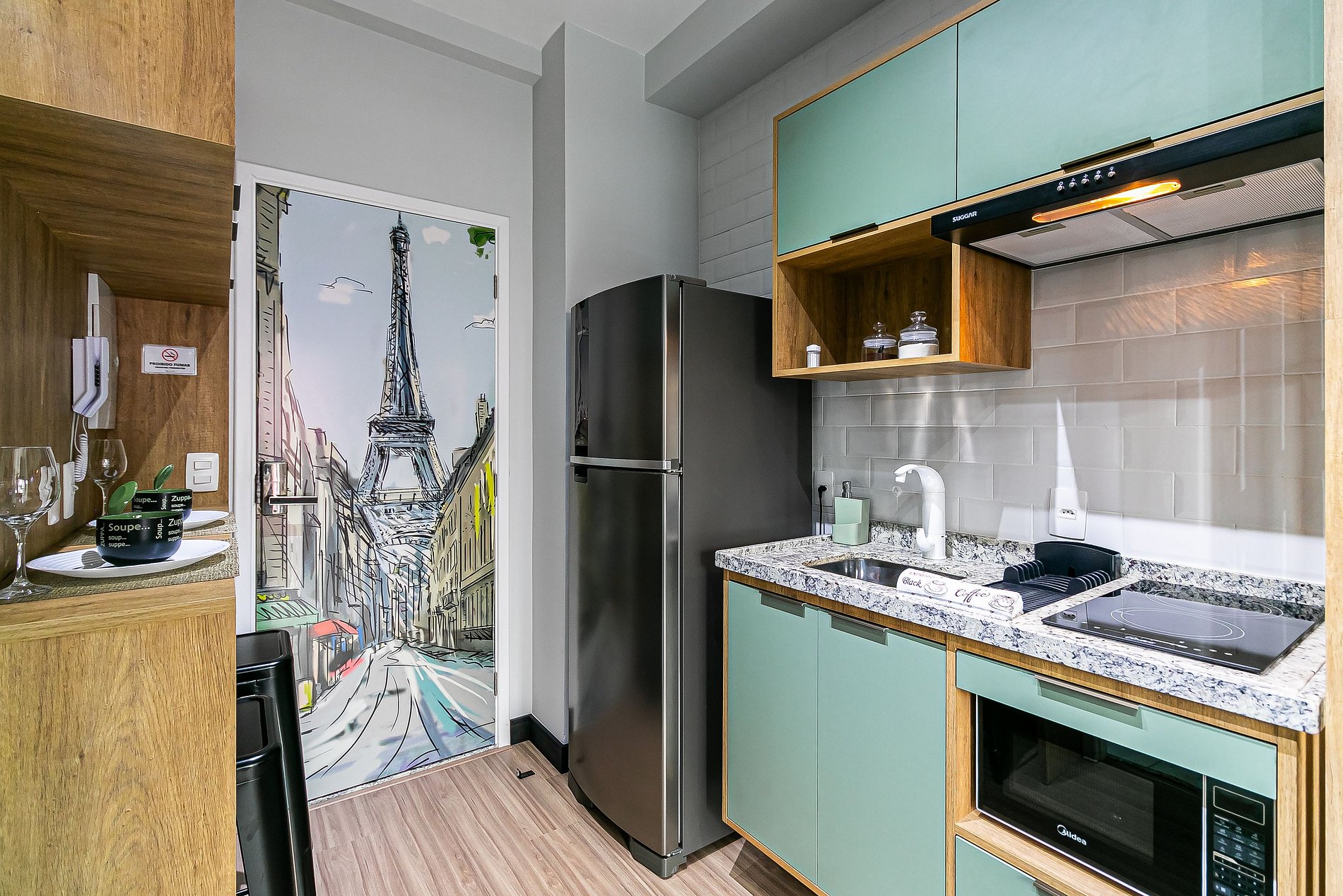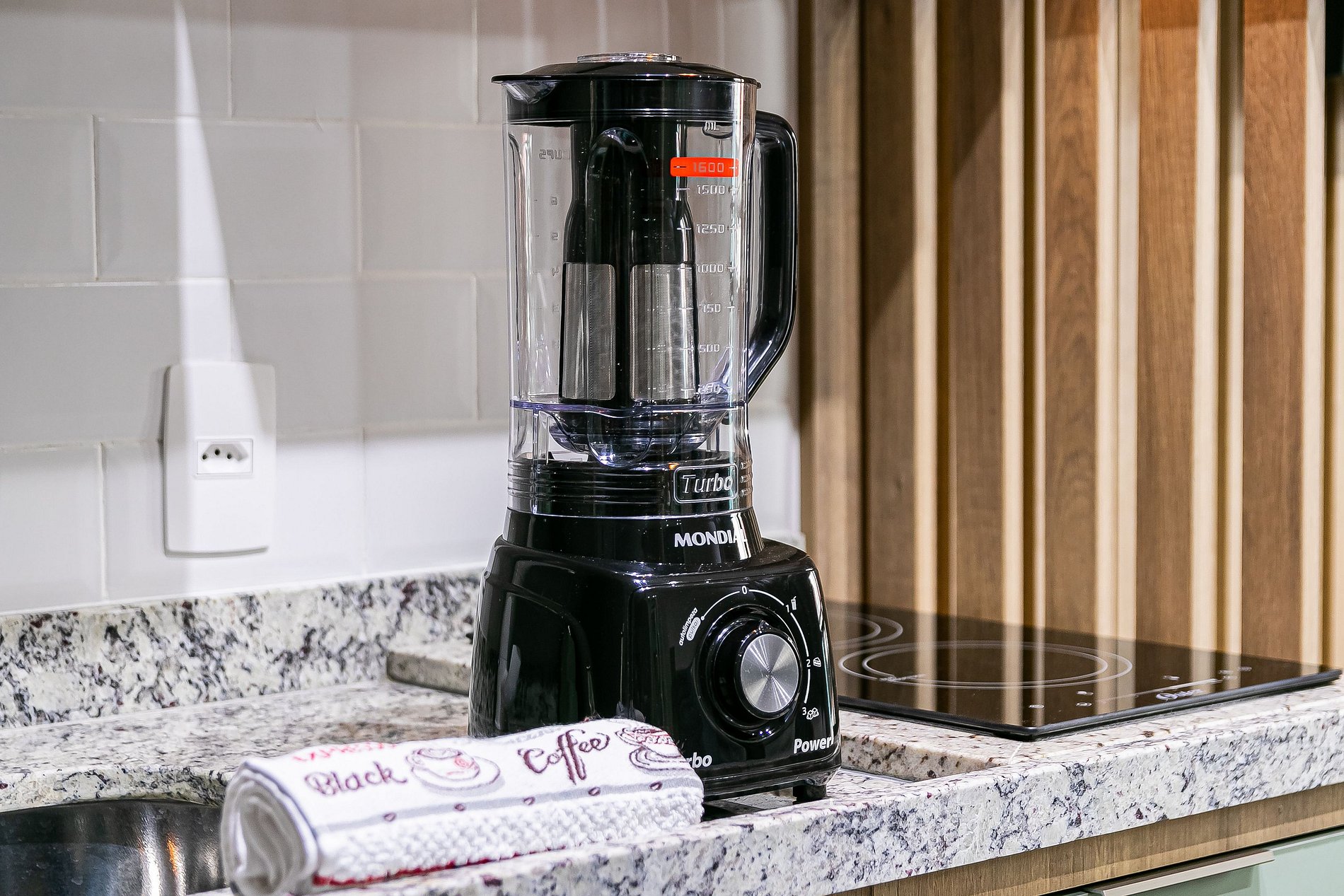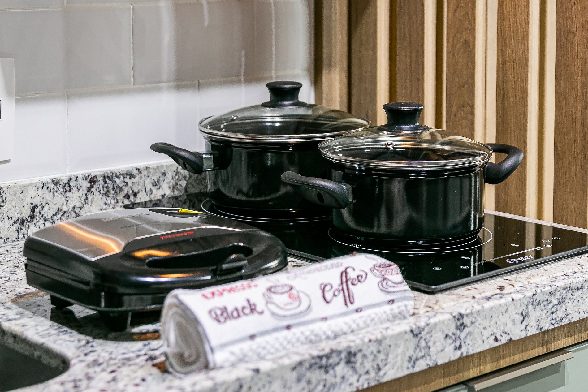 - Cozinha completa, equipada com geladeira, microondas, cooktop de indução de duas bocas, depurador e demais utensílios.