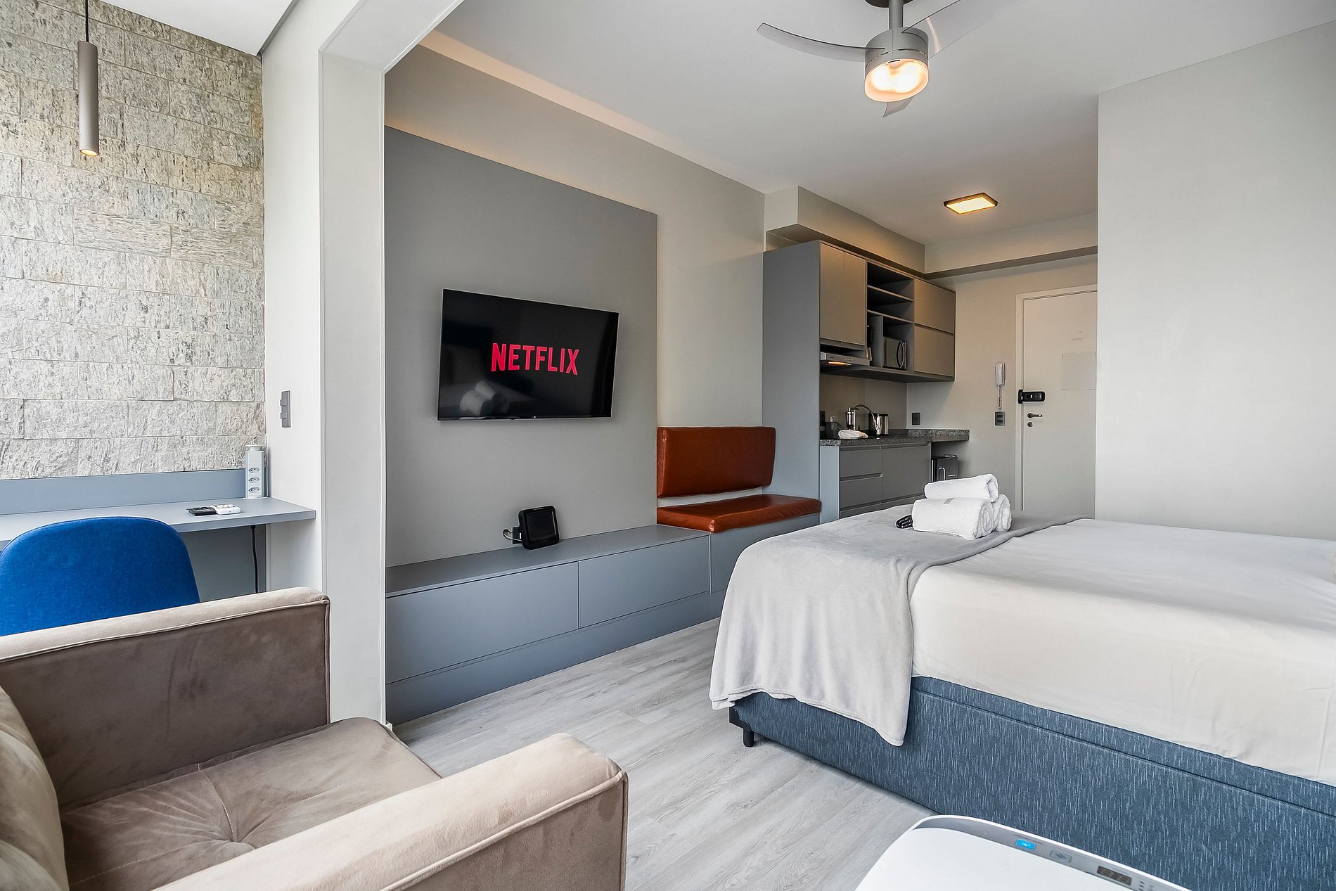 Os hóspedes podem acessar áreas comuns como Piscina, Mini Mercado, Rooftop, Coworking e Lavanderia.