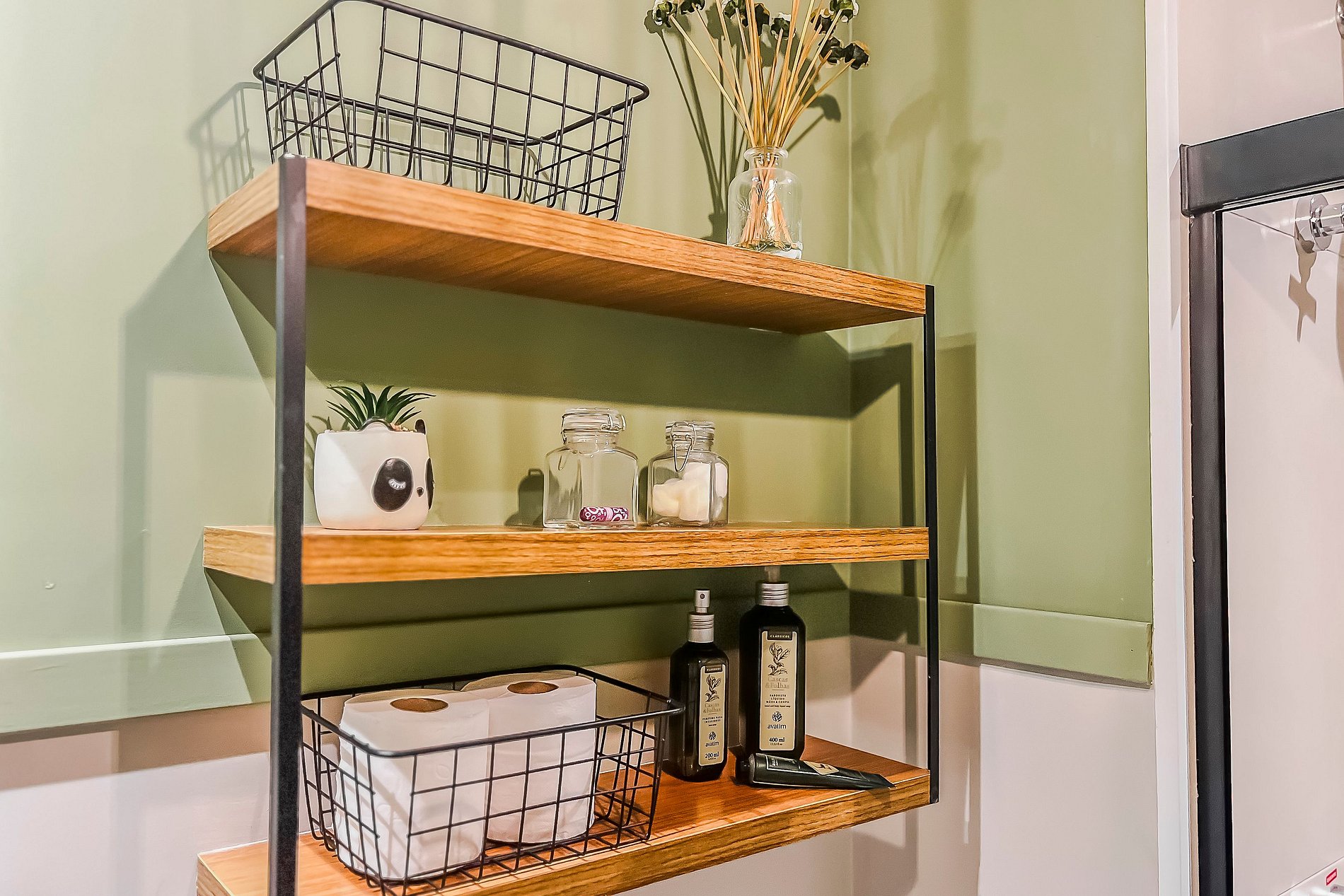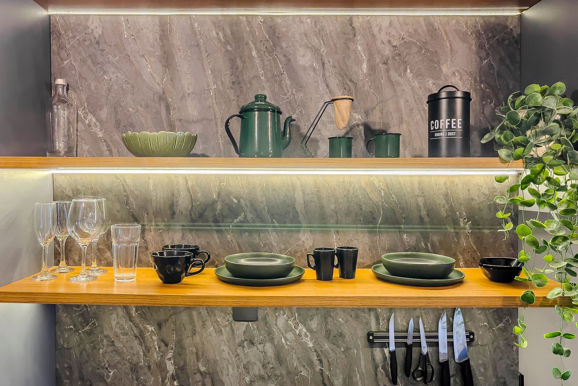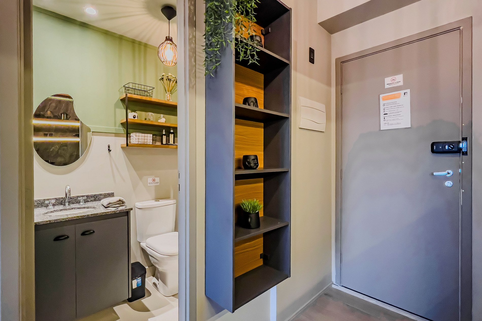 Os hóspedes podem acessar áreas comuns como Piscina, Mini Mercado, Rooftop, Coworking e Lavanderia.