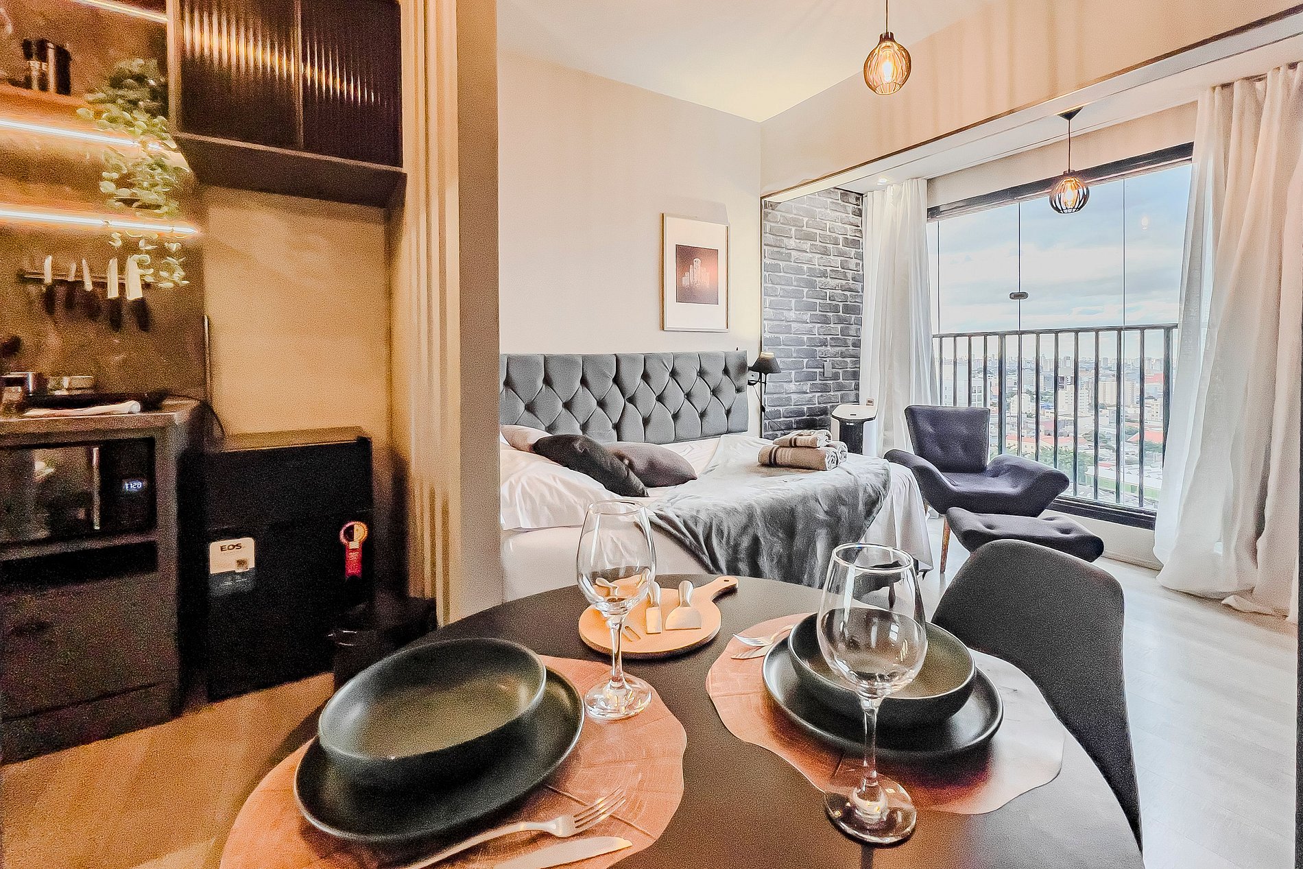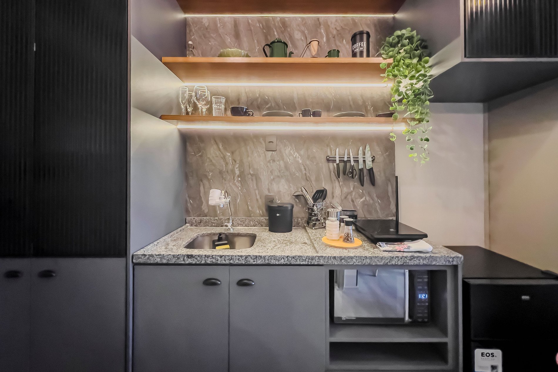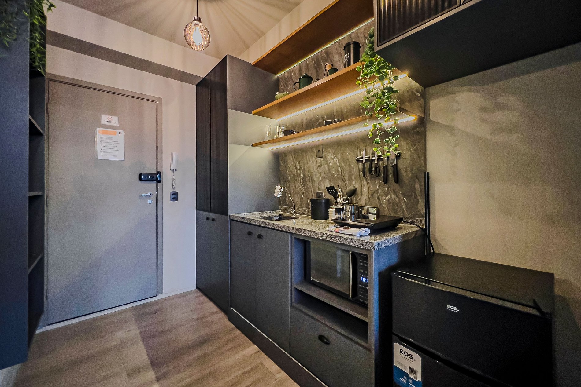 - Cozinha completa, equipada com frigobar, microondas, cafeteira, panelas, cooktop de indução de uma boca e demais itens - Sacada com vista do 16º andar.