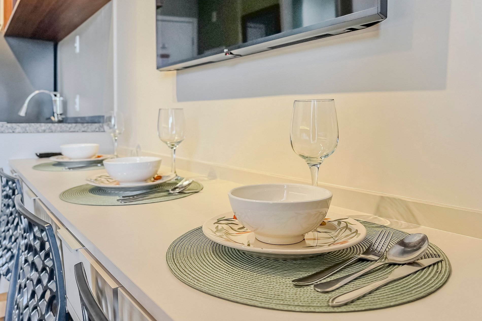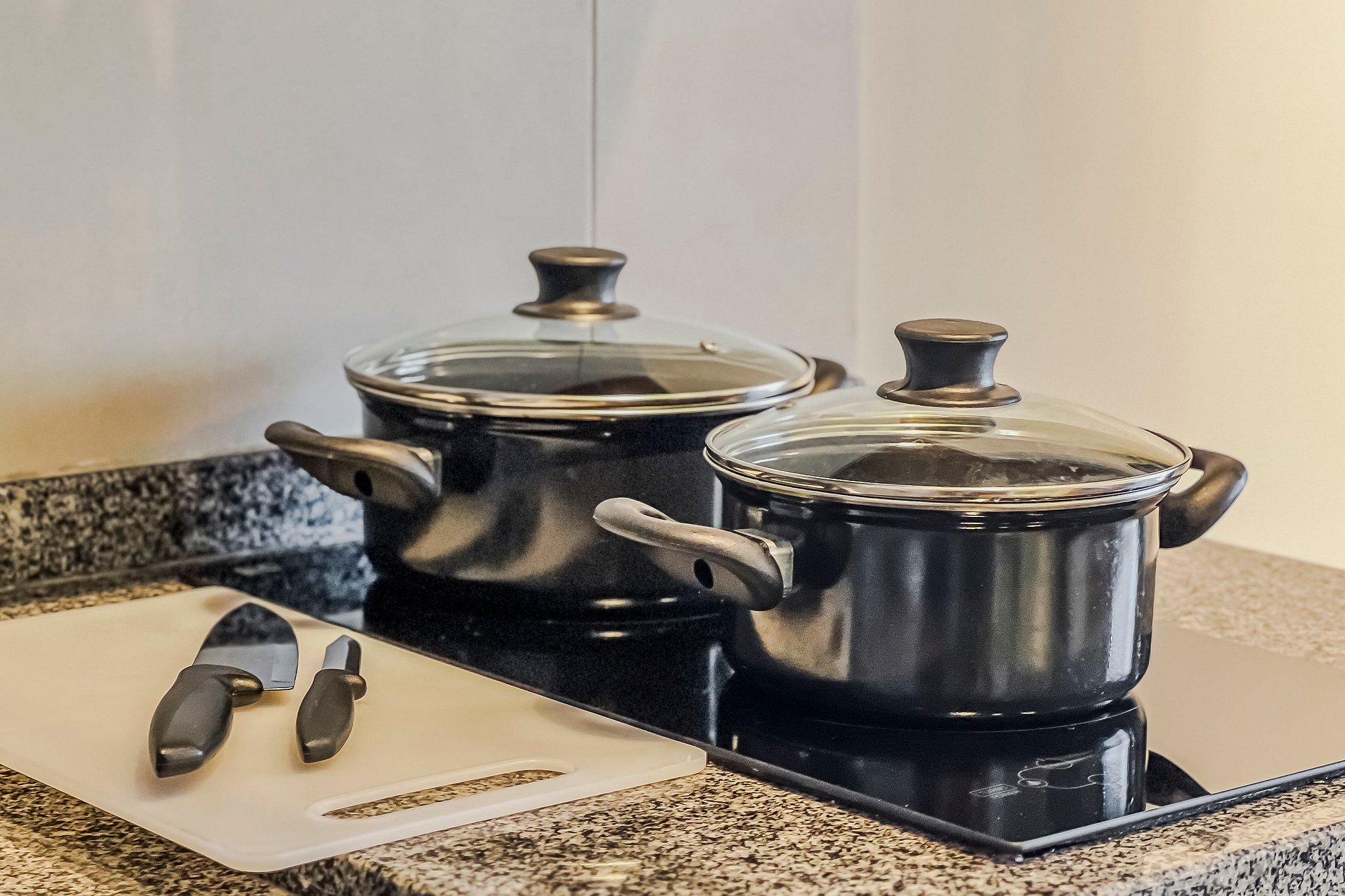 - Cozinha completa, equipada com geladeira, microondas, cafeteira, panelas, cooktop de indução de duas bocas e demais itens