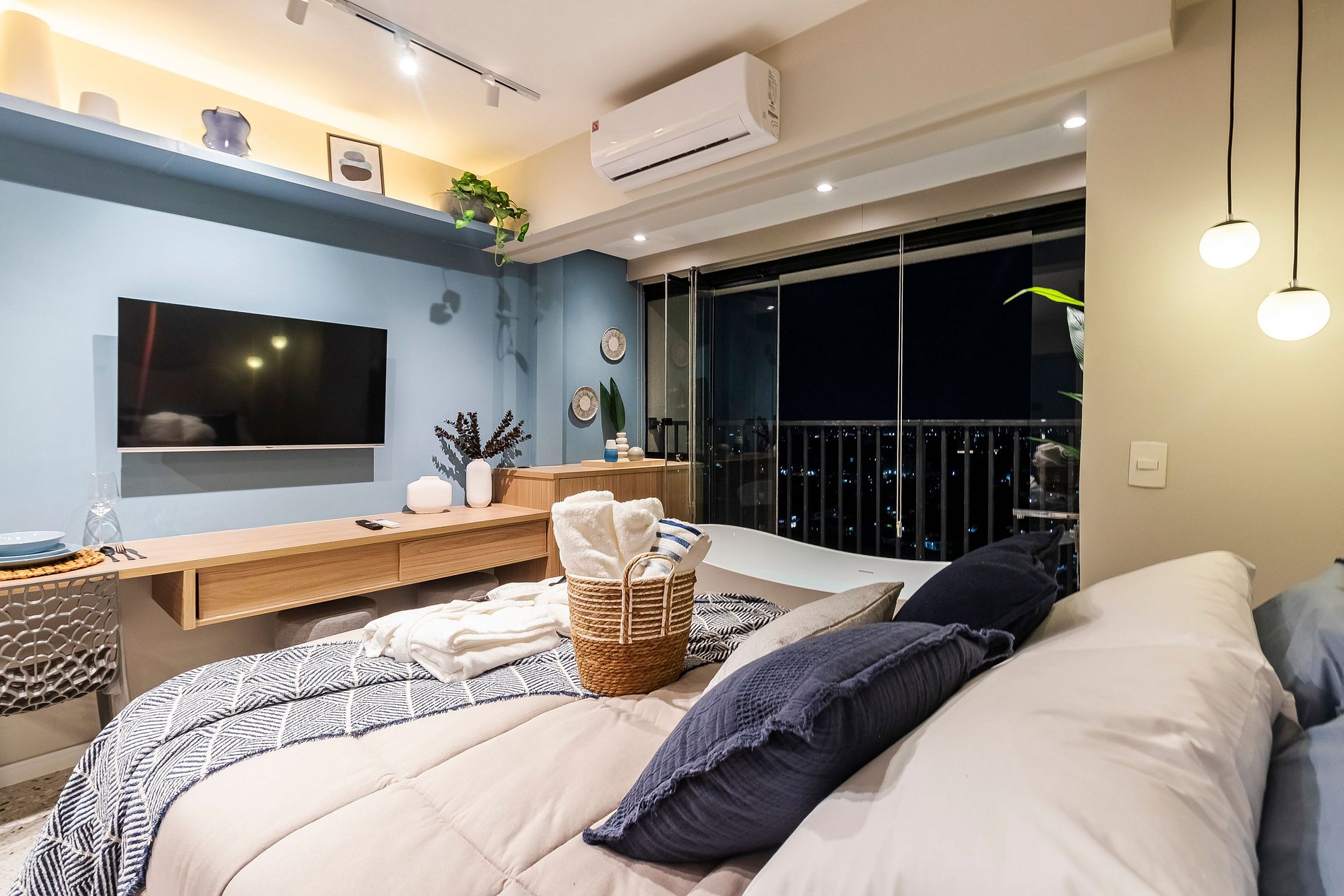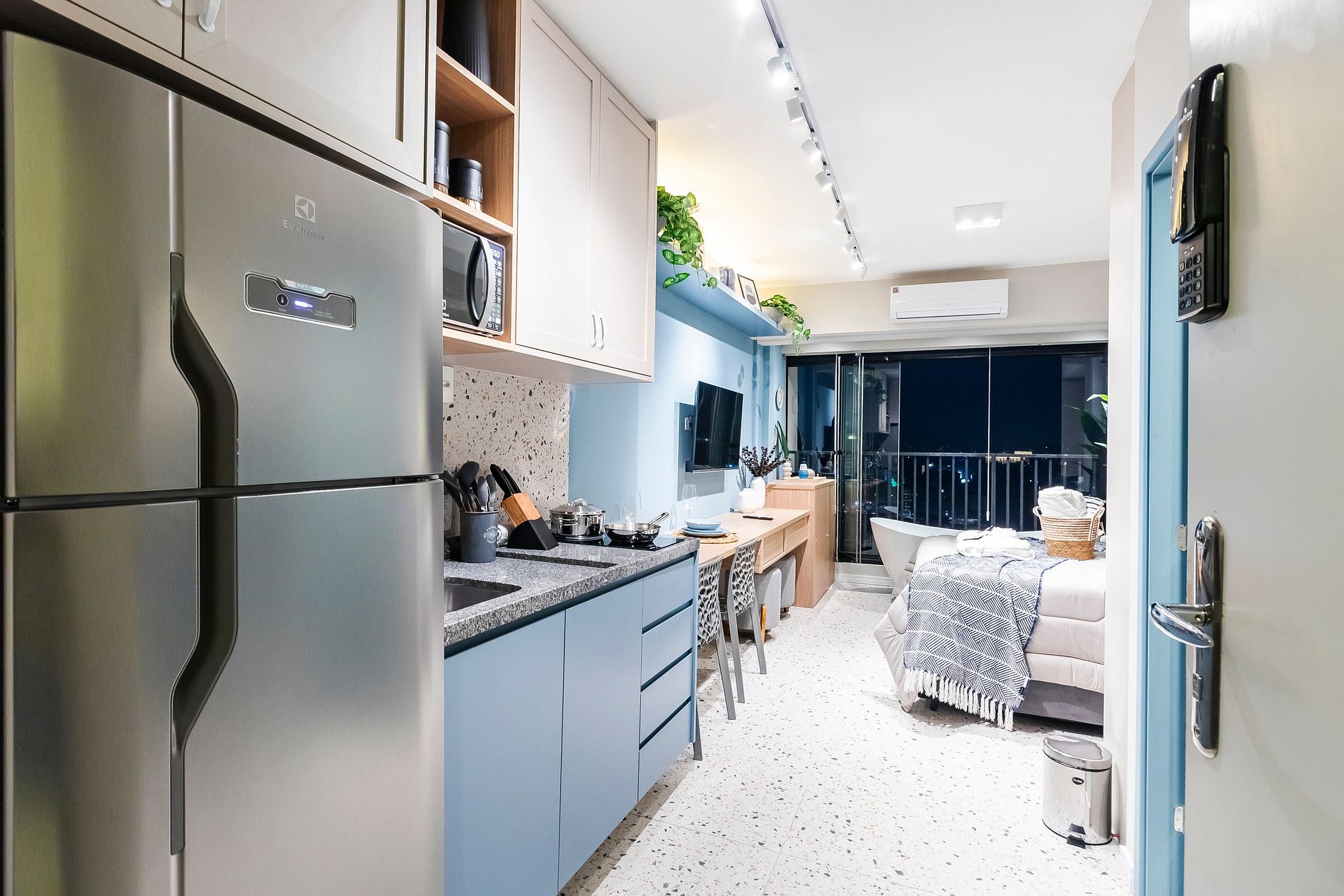 Os hóspedes podem acessar áreas comuns como Piscina, Mini Mercado, Rooftop, Coworking e Lavanderia.