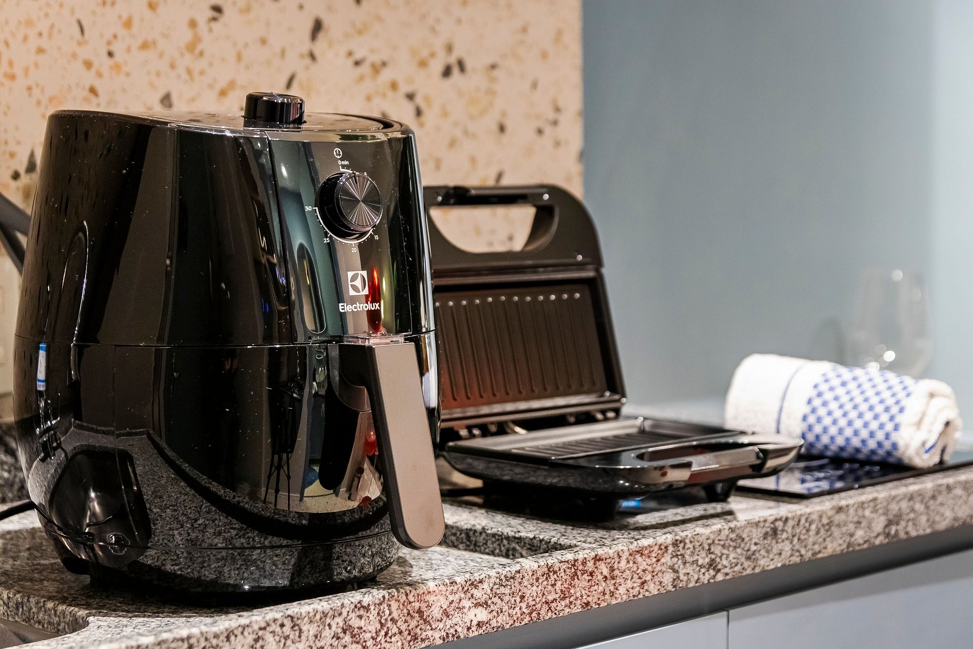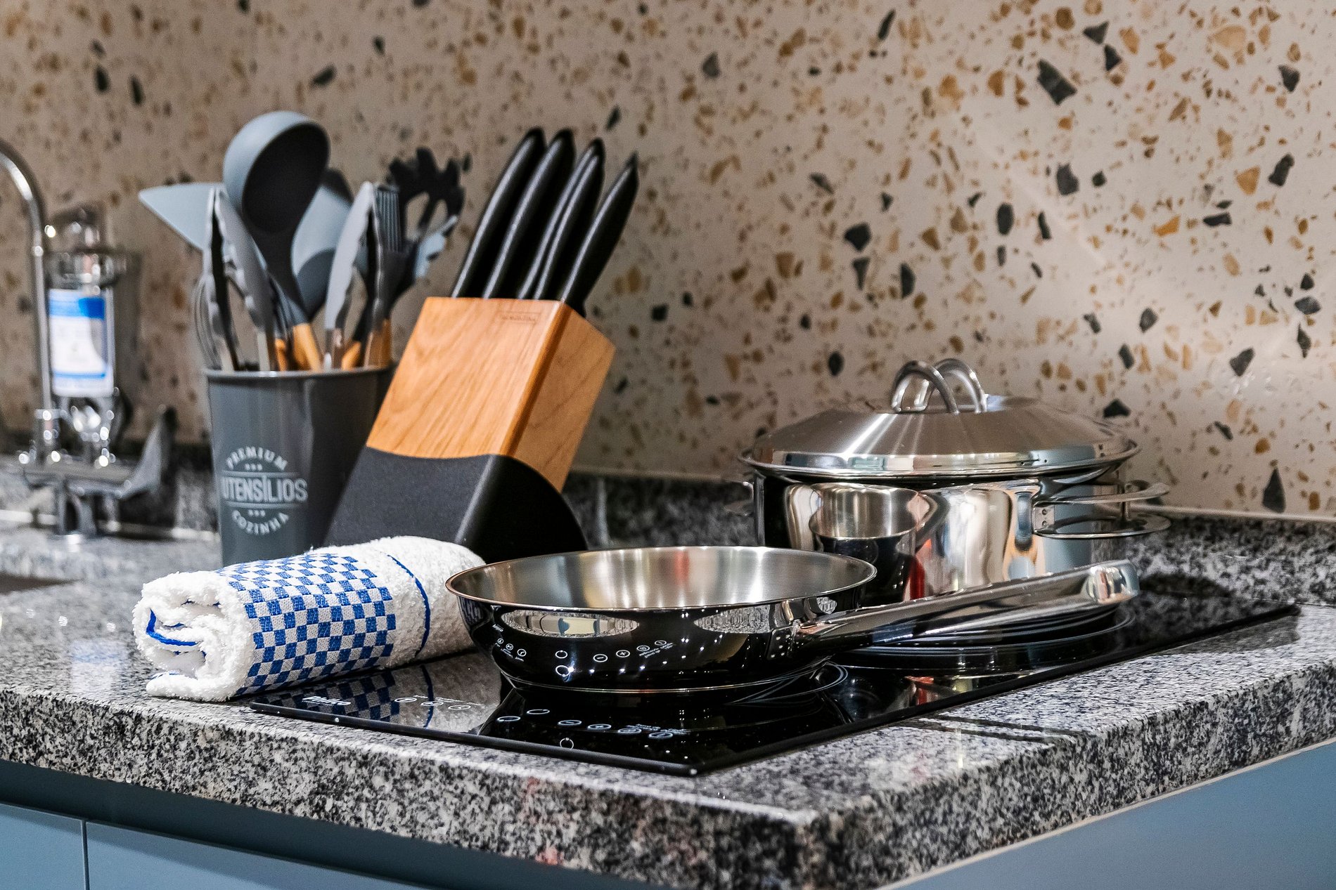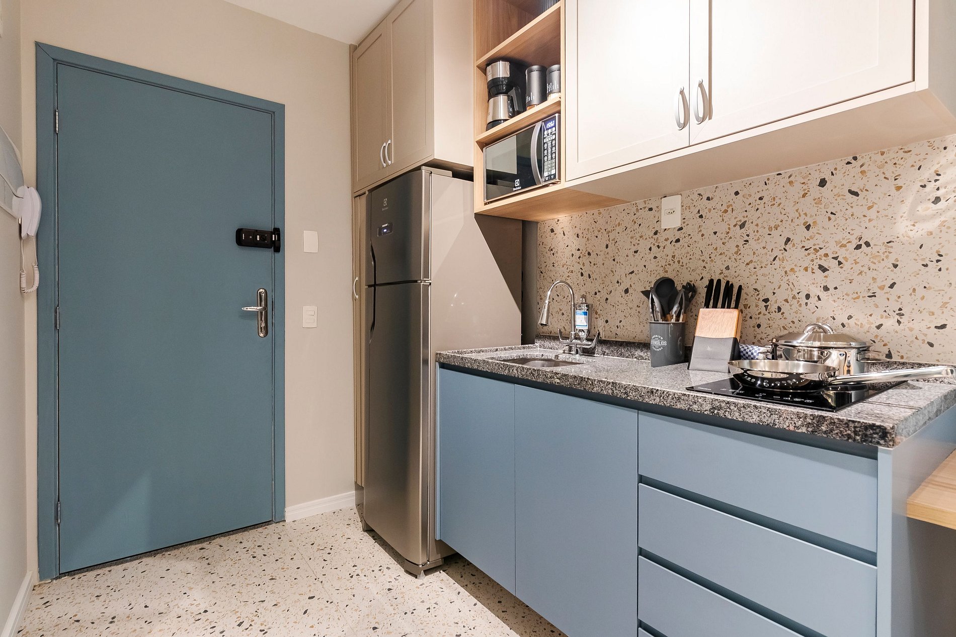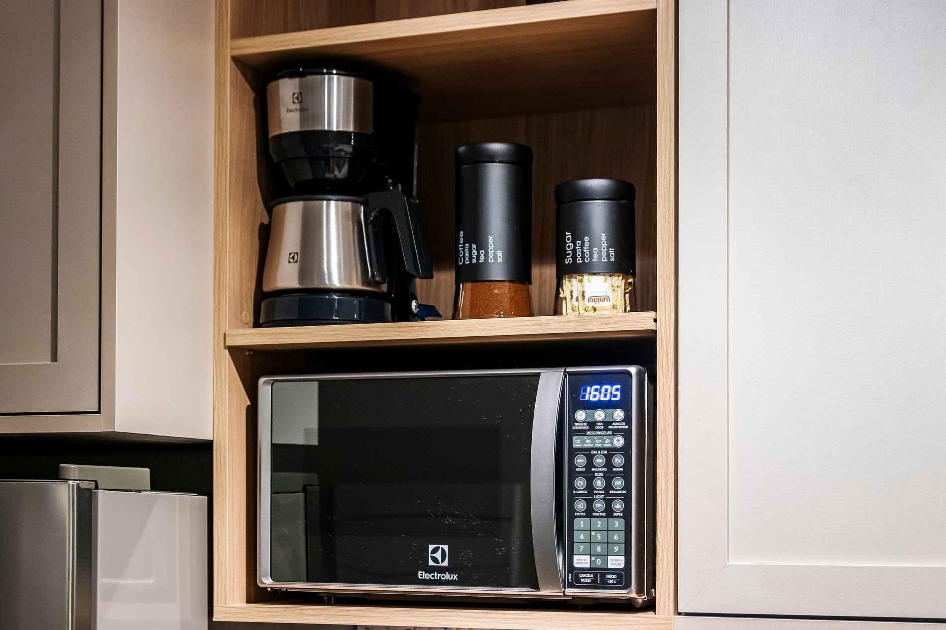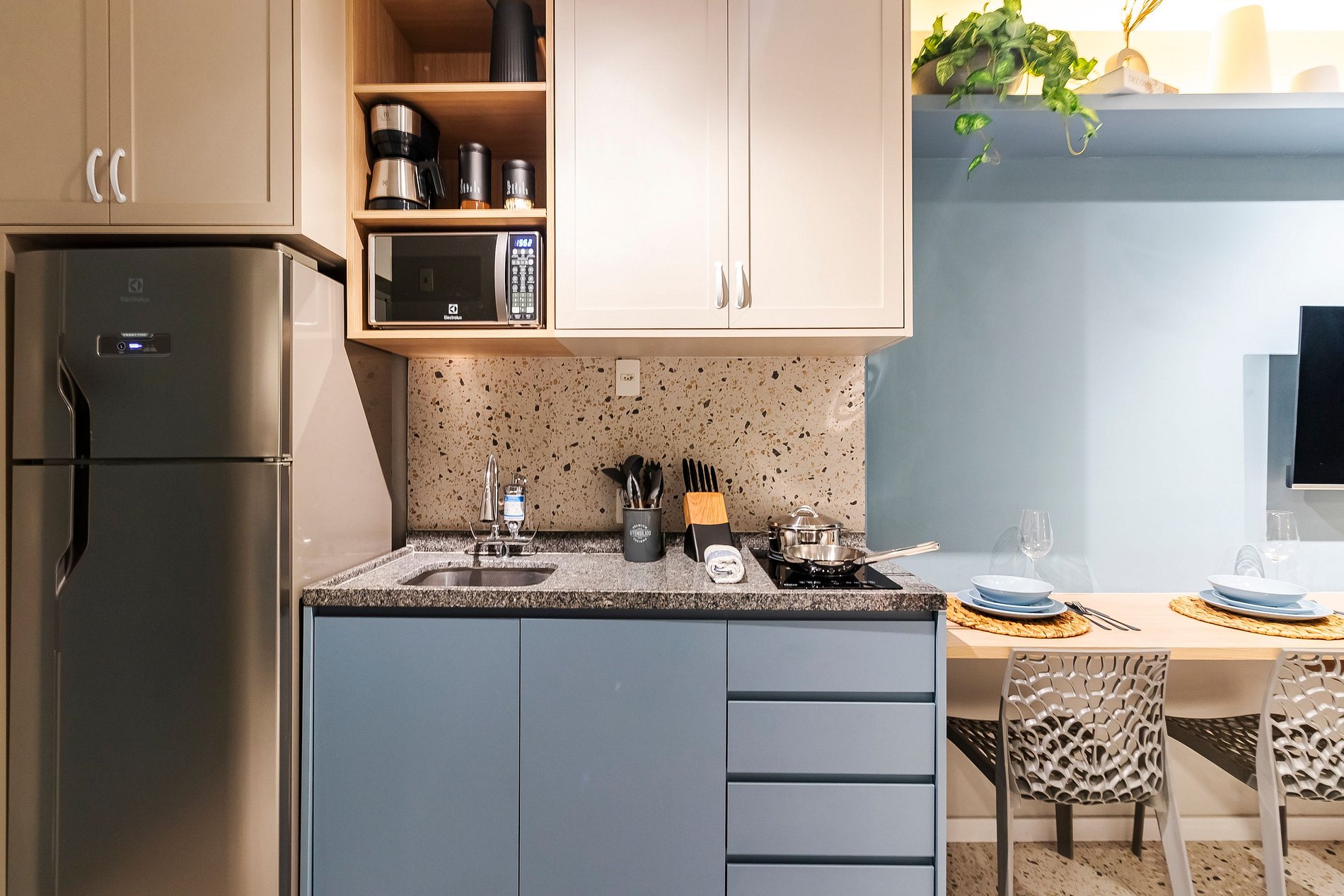 - Cozinha completa, equipada com geladeira, microondas, cafeteira elétrica, panelas, cooktop de indução de duas bocas e demais itens