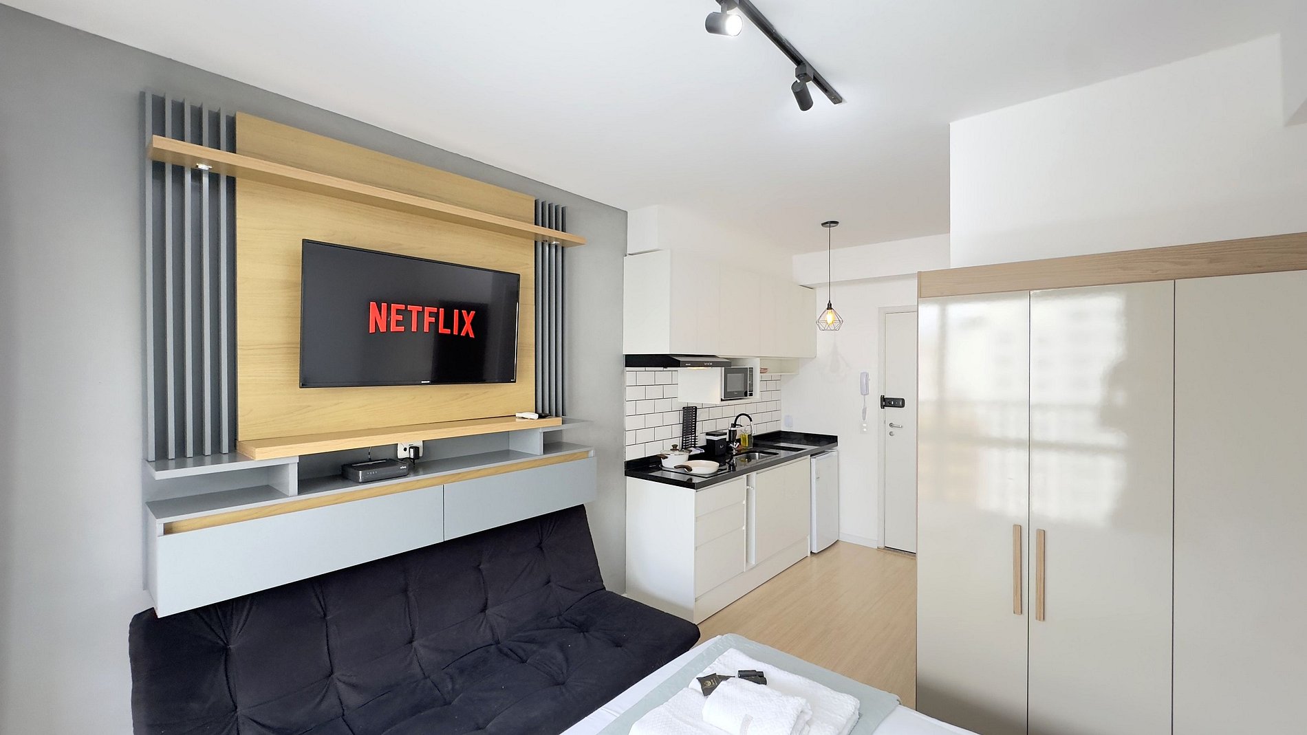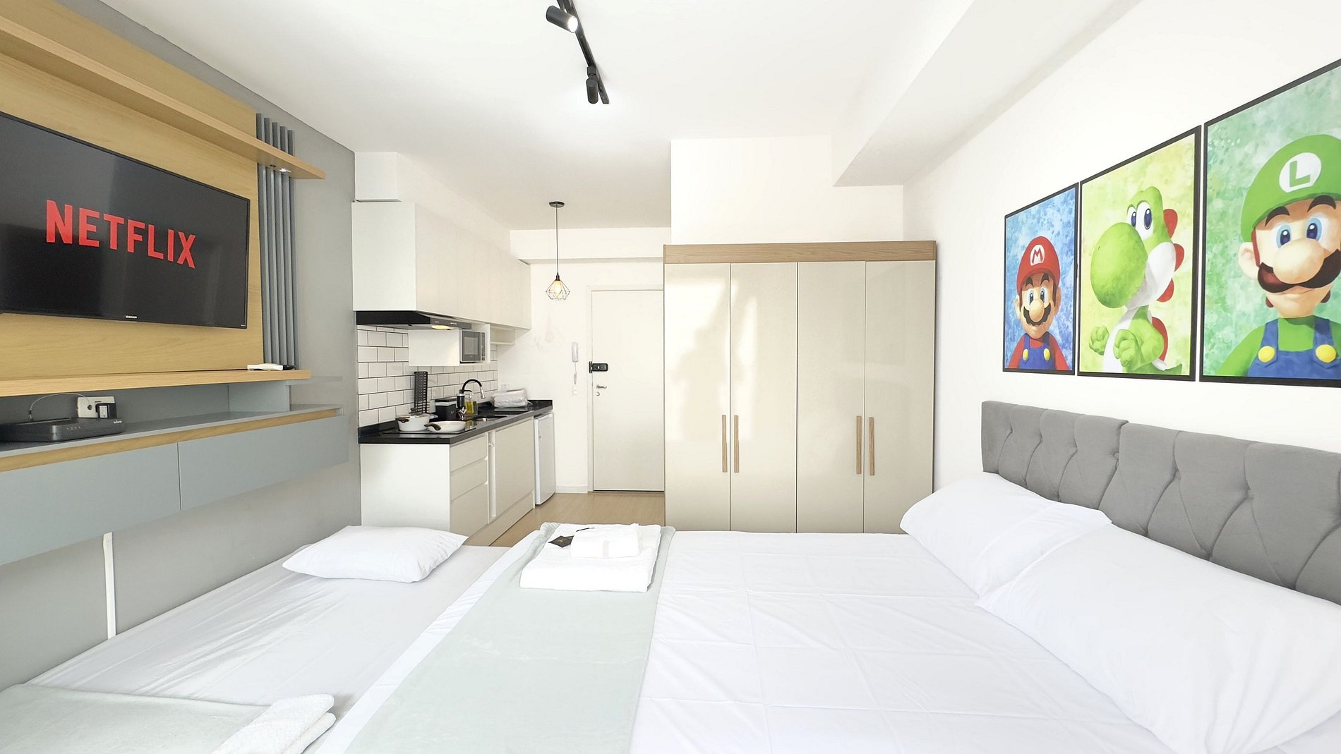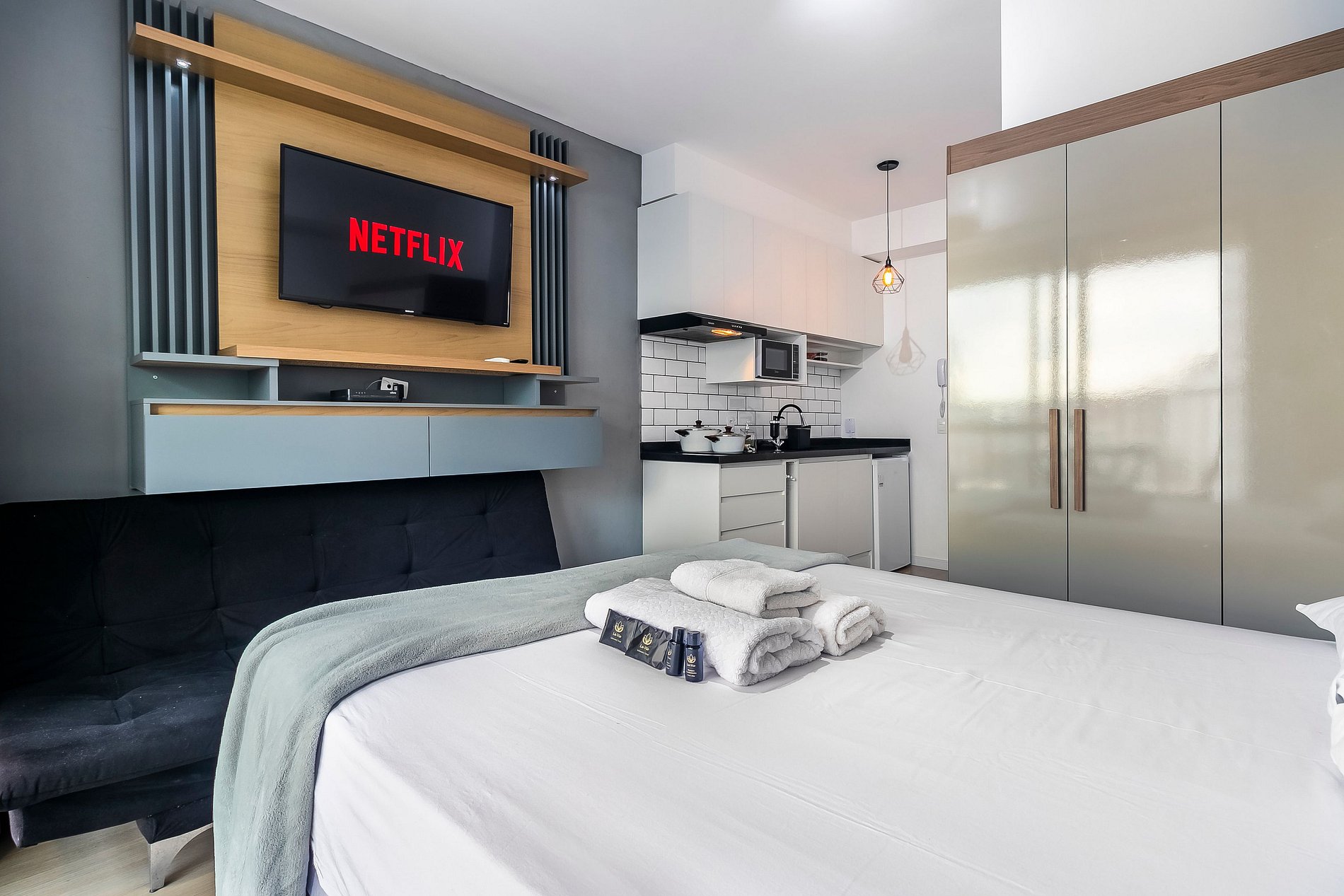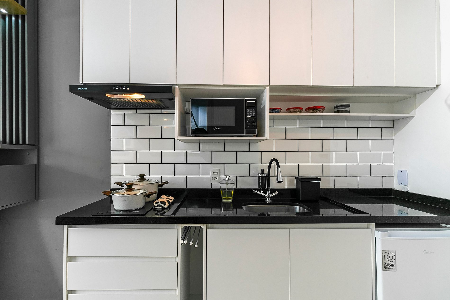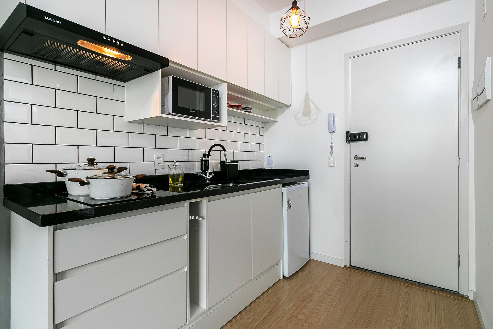 - Cozinha completa, equipada com frigobar espaçoso, microondas, cafeteira, panelas, cooktop de indução de duas bocas e demais itens