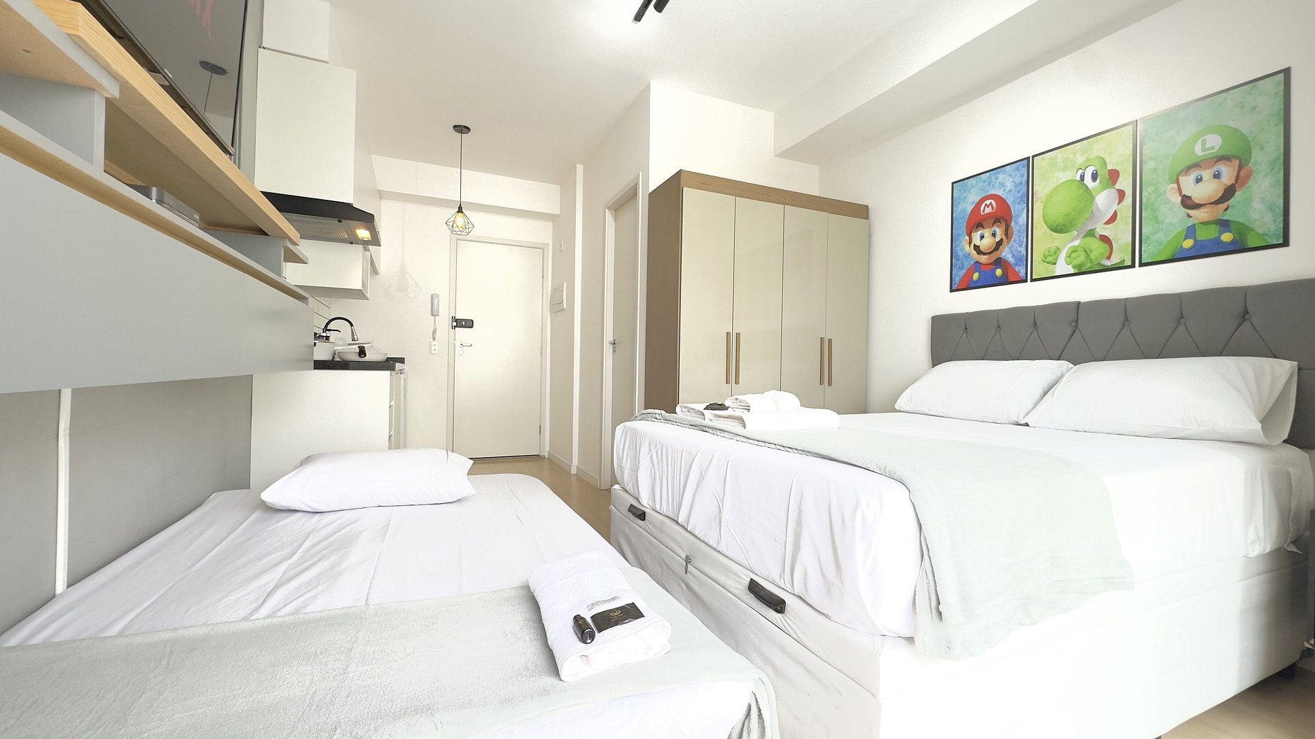 Os hóspedes podem acessar áreas comuns como Piscina, Mini Mercado, Rooftop, Coworking e Lavanderia.
