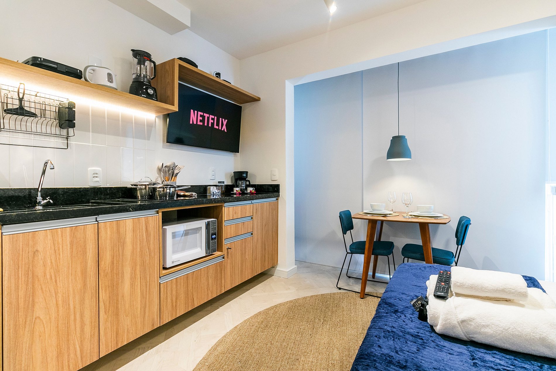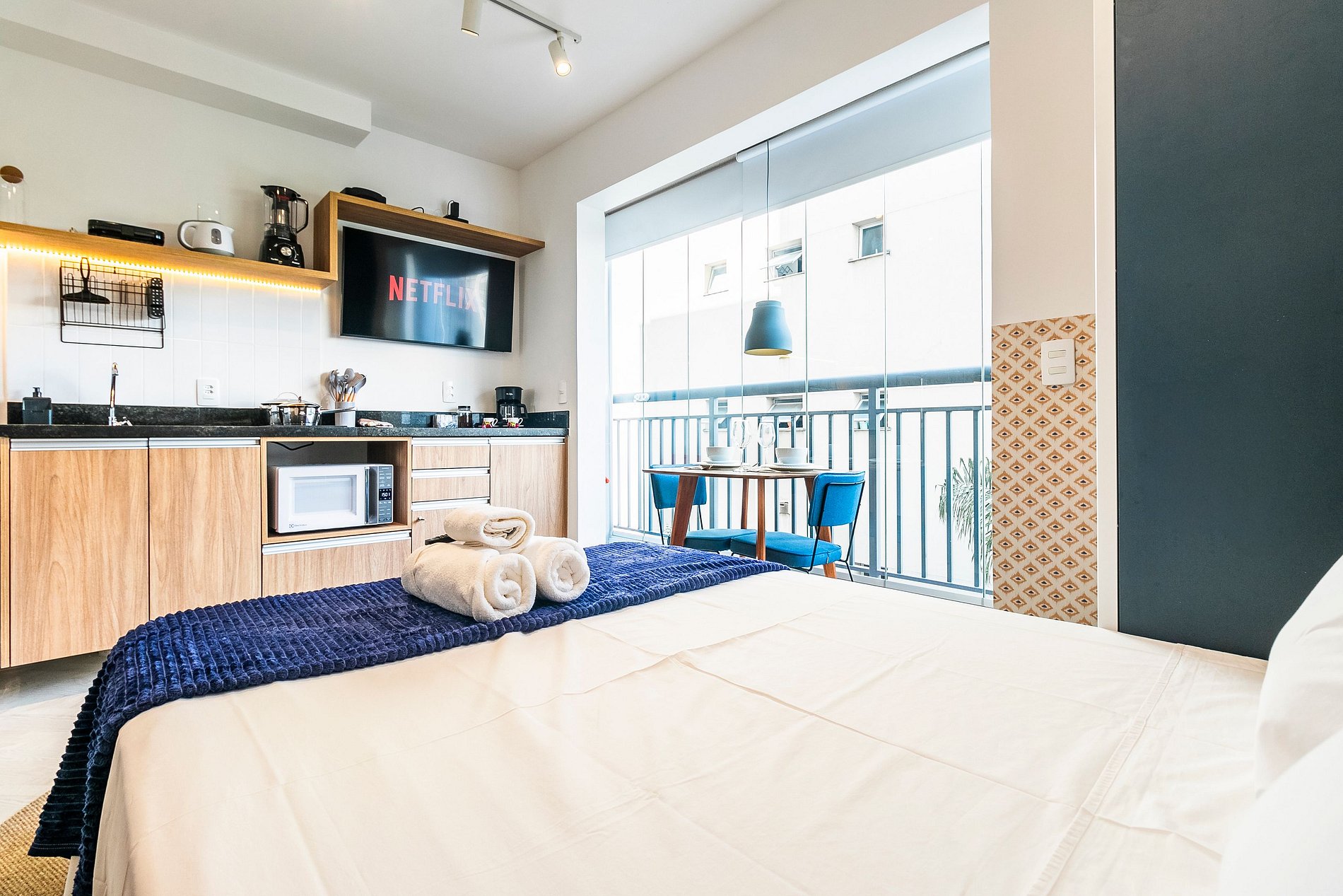 Apartamento confortável com cama de casal, sacada, cozinha completa, ar-condicionado, Smart TV 43 polegadas, e outras comodidades dentro do condomínio, como academia e lavanderia OMO.