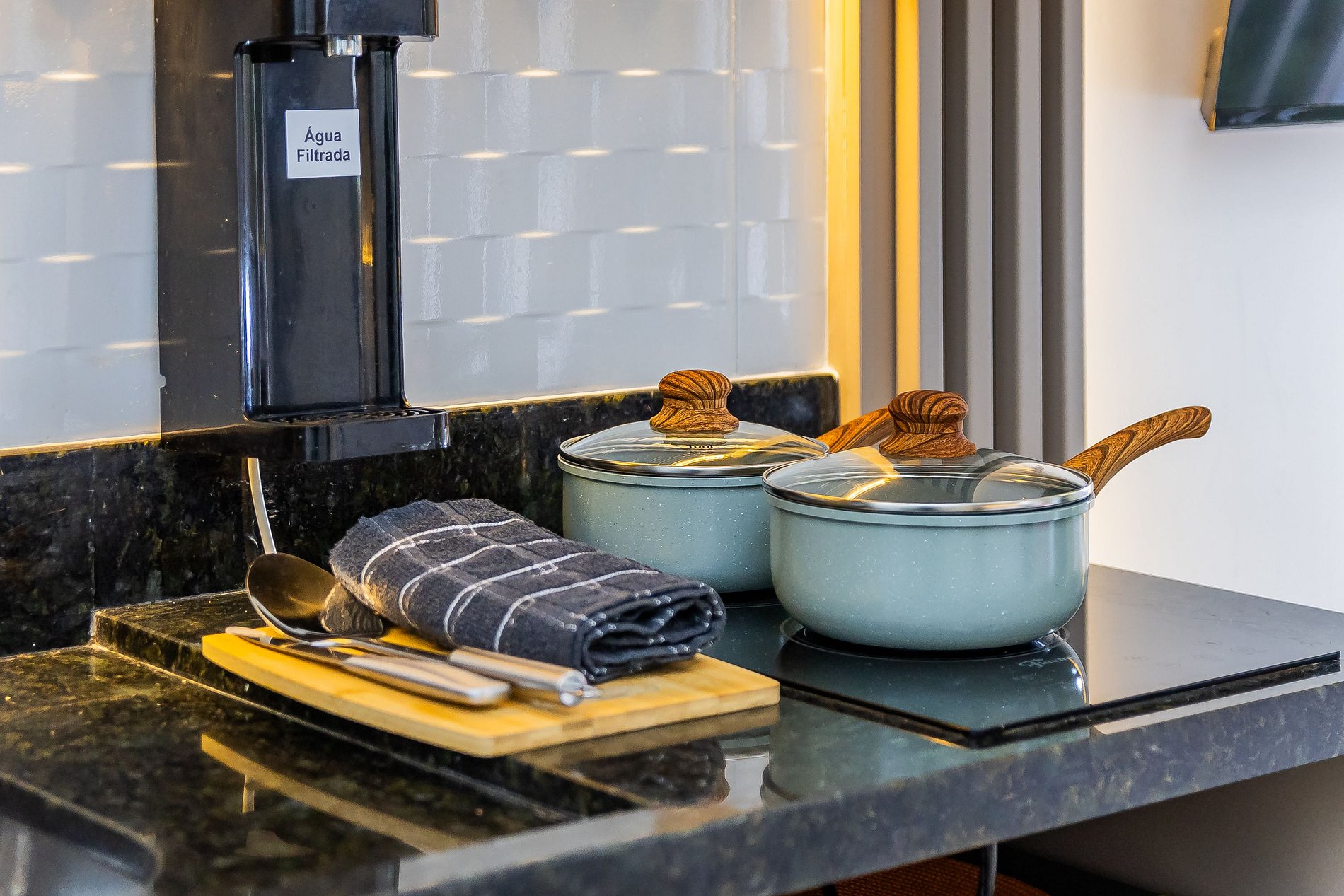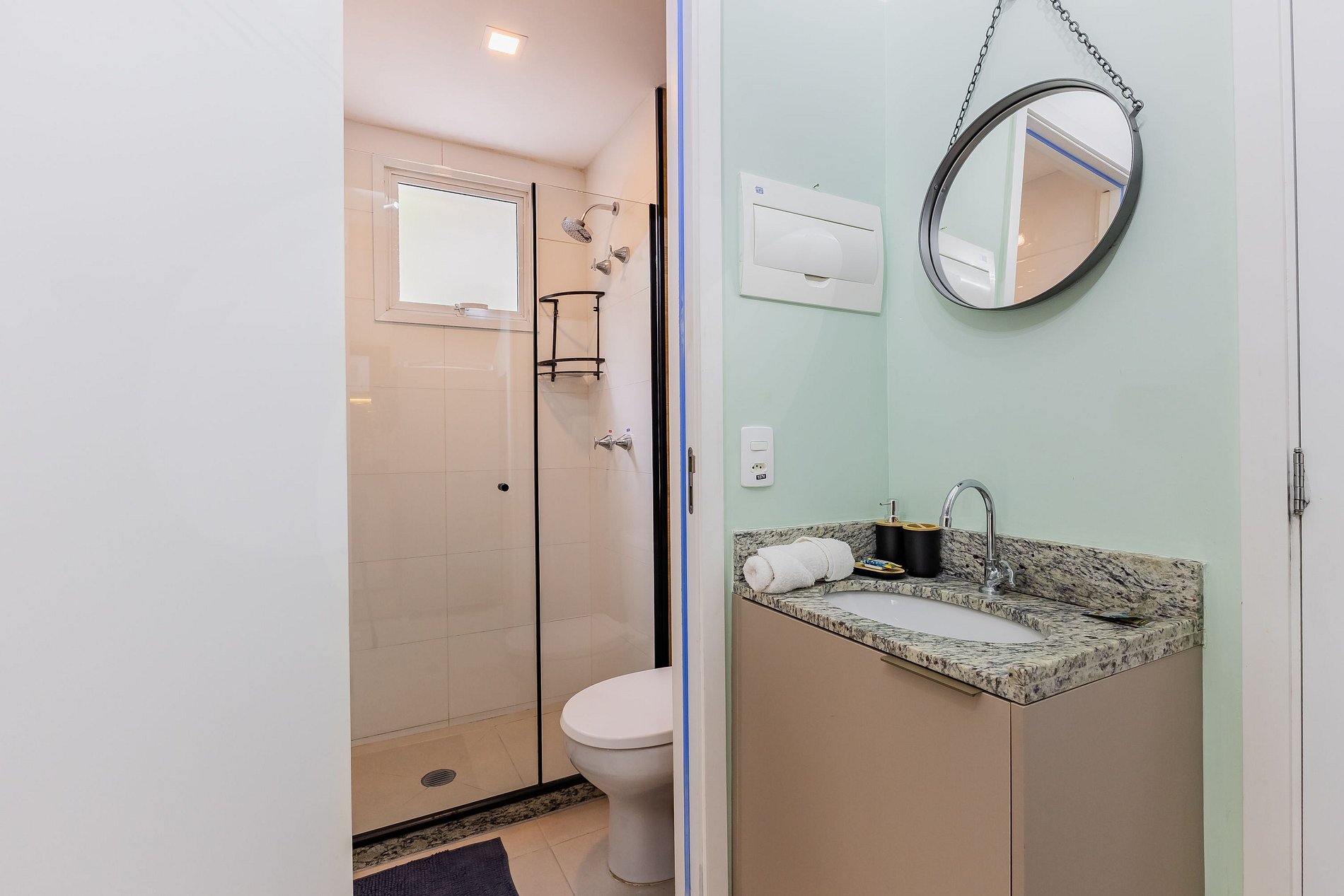 Apartamento confortável totalmente reformado, com cama de casal, sacada, cozinha completa, ar-condicionado, Smart TV 32 polegadas, e outras comodidades dentro do condomínio, como academia e lavanderia OMO.