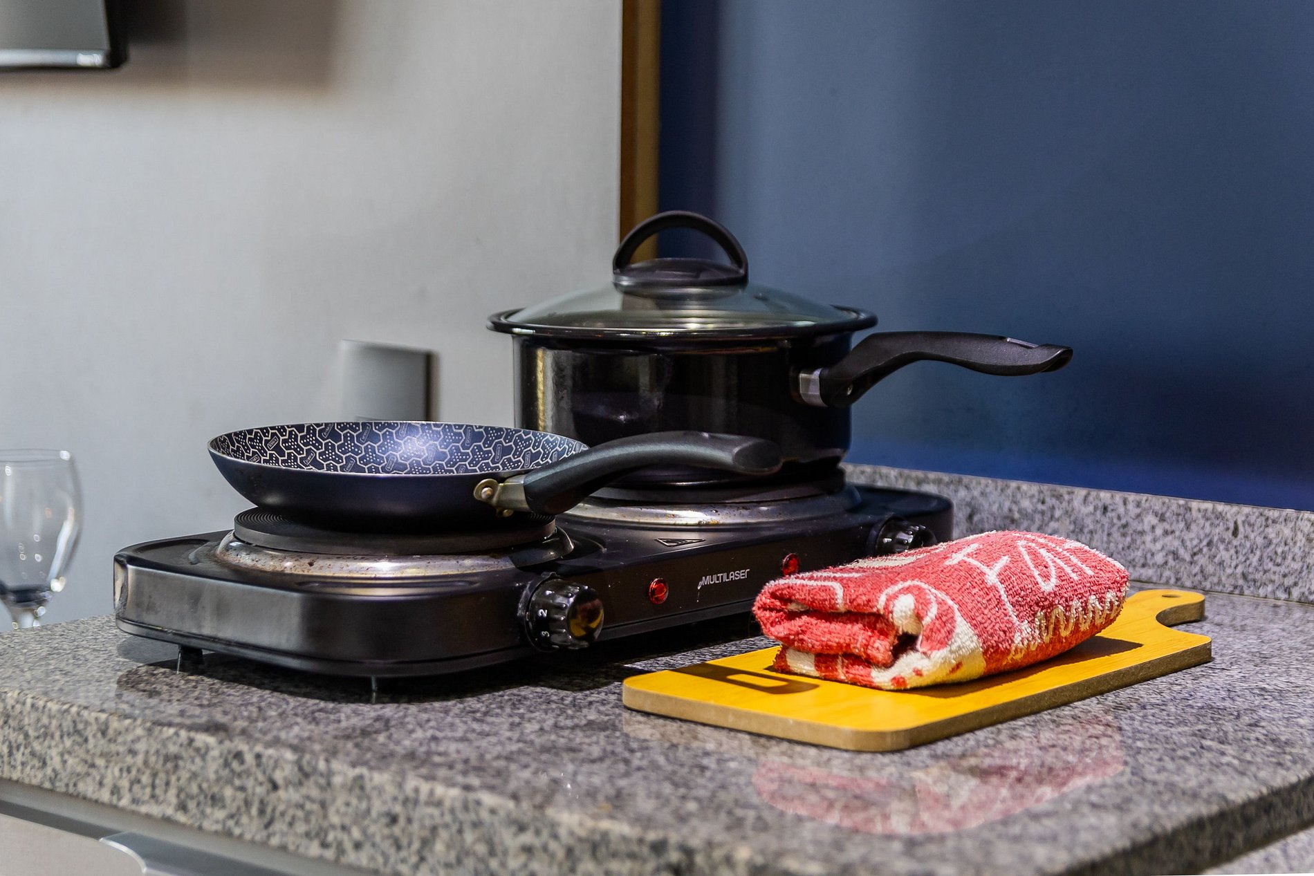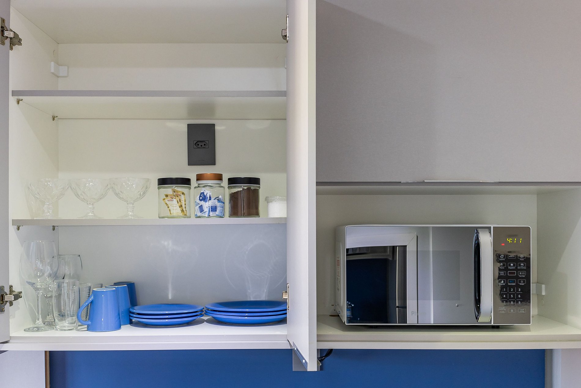 - Cozinha completa, equipada com geladeira, microondas, cooktop e diversos outros utensílios.