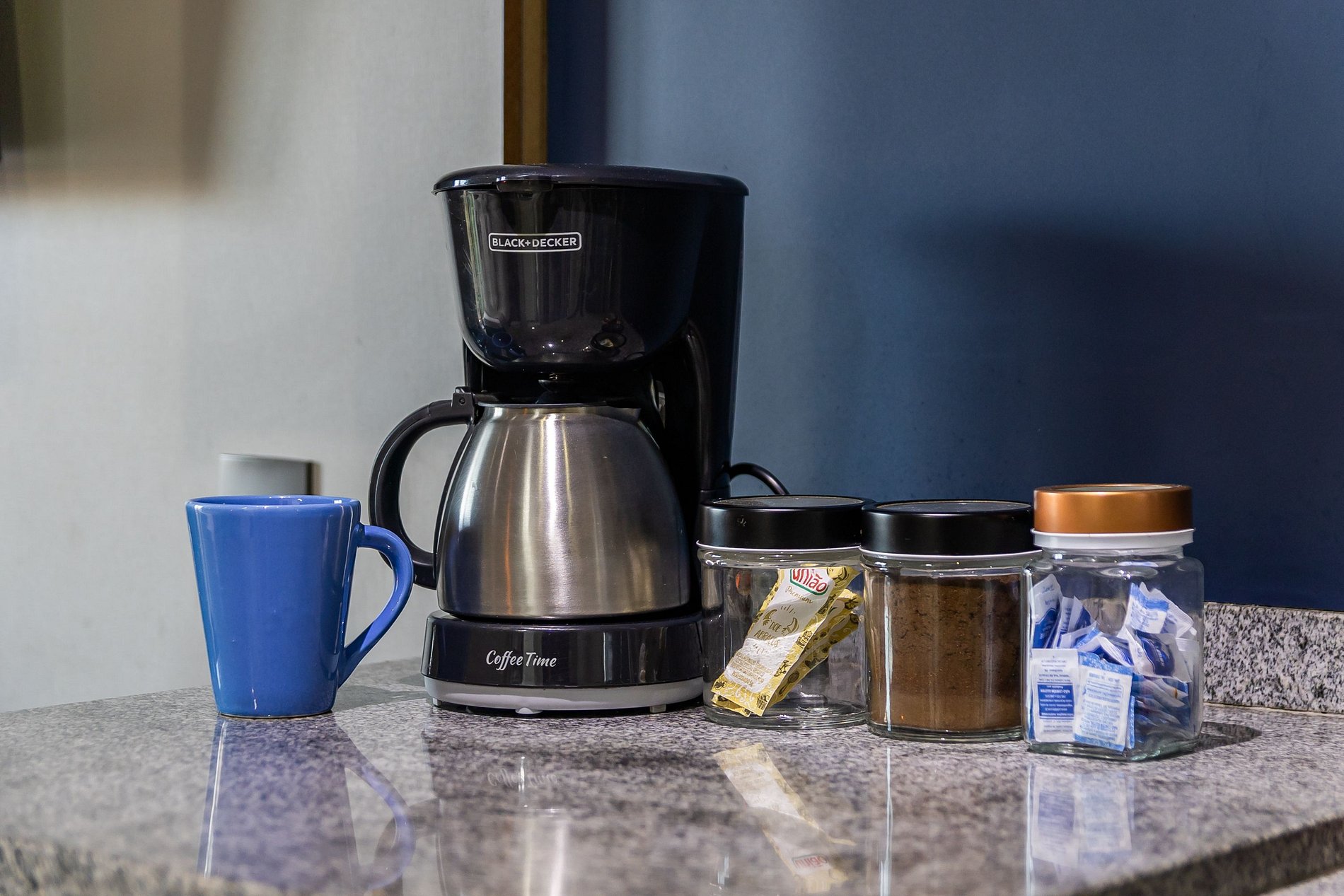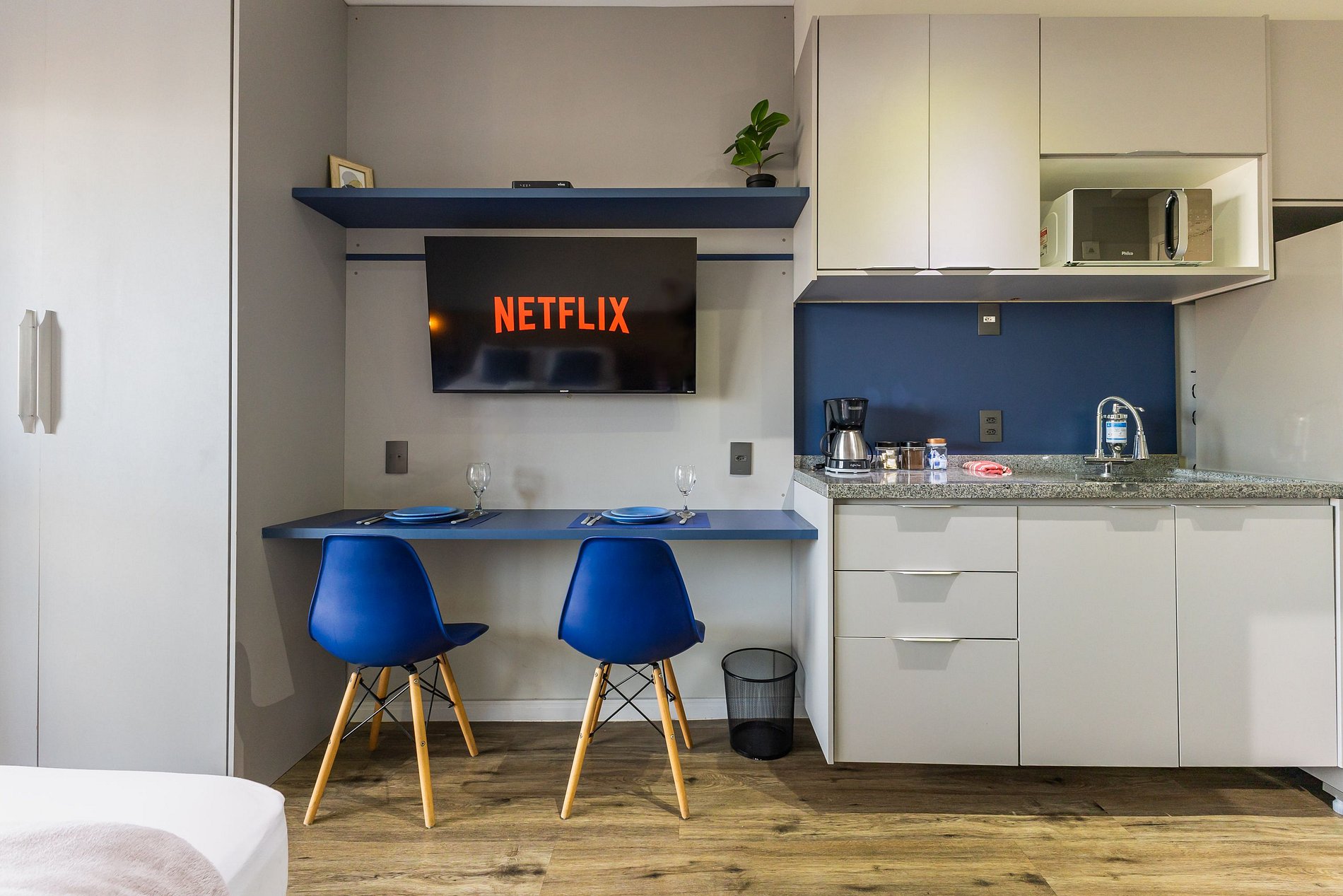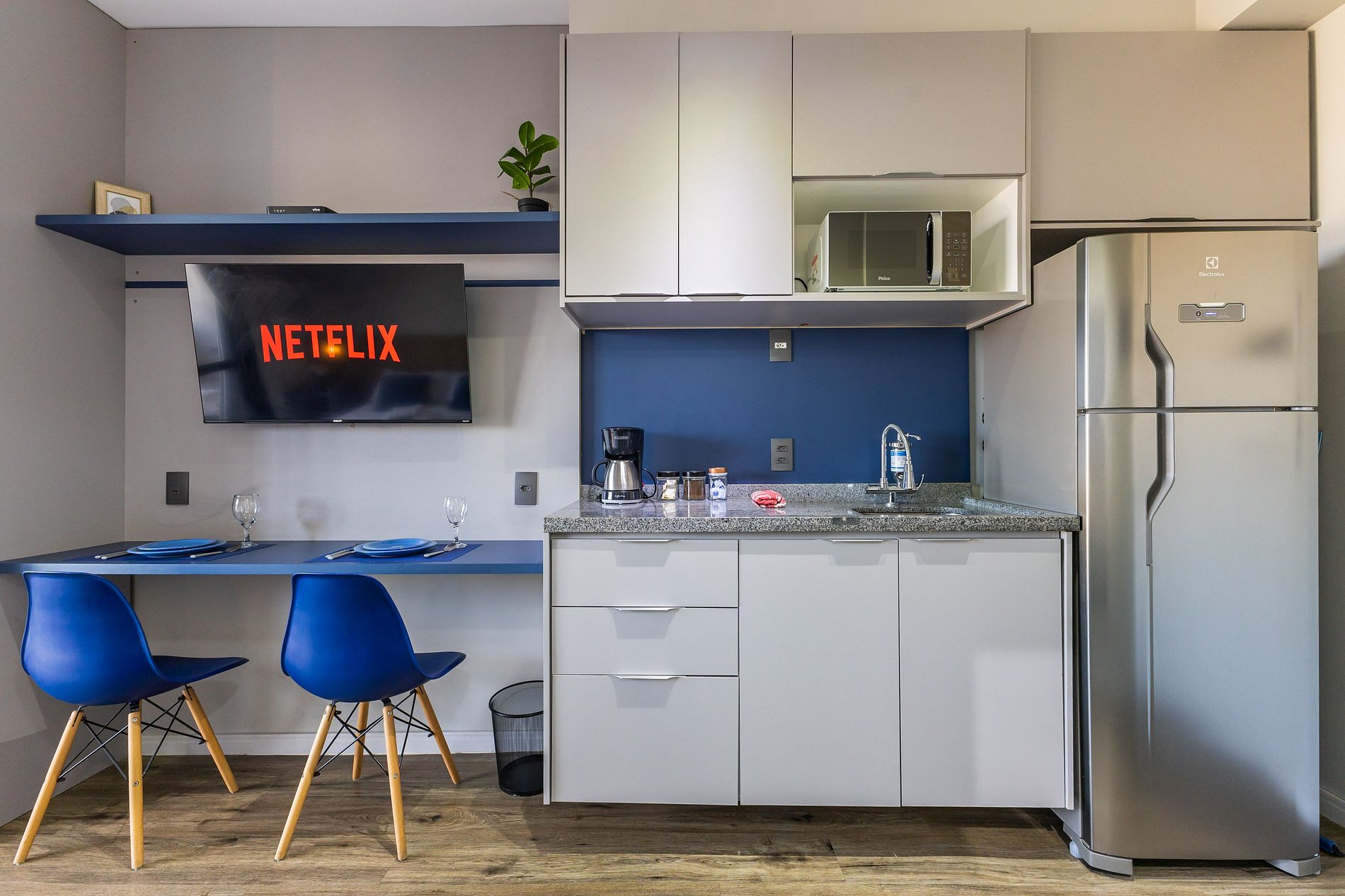 Os hóspedes podem acessar áreas comuns como Piscina, Mini Mercado, Rooftop, Coworking e Lavanderia.