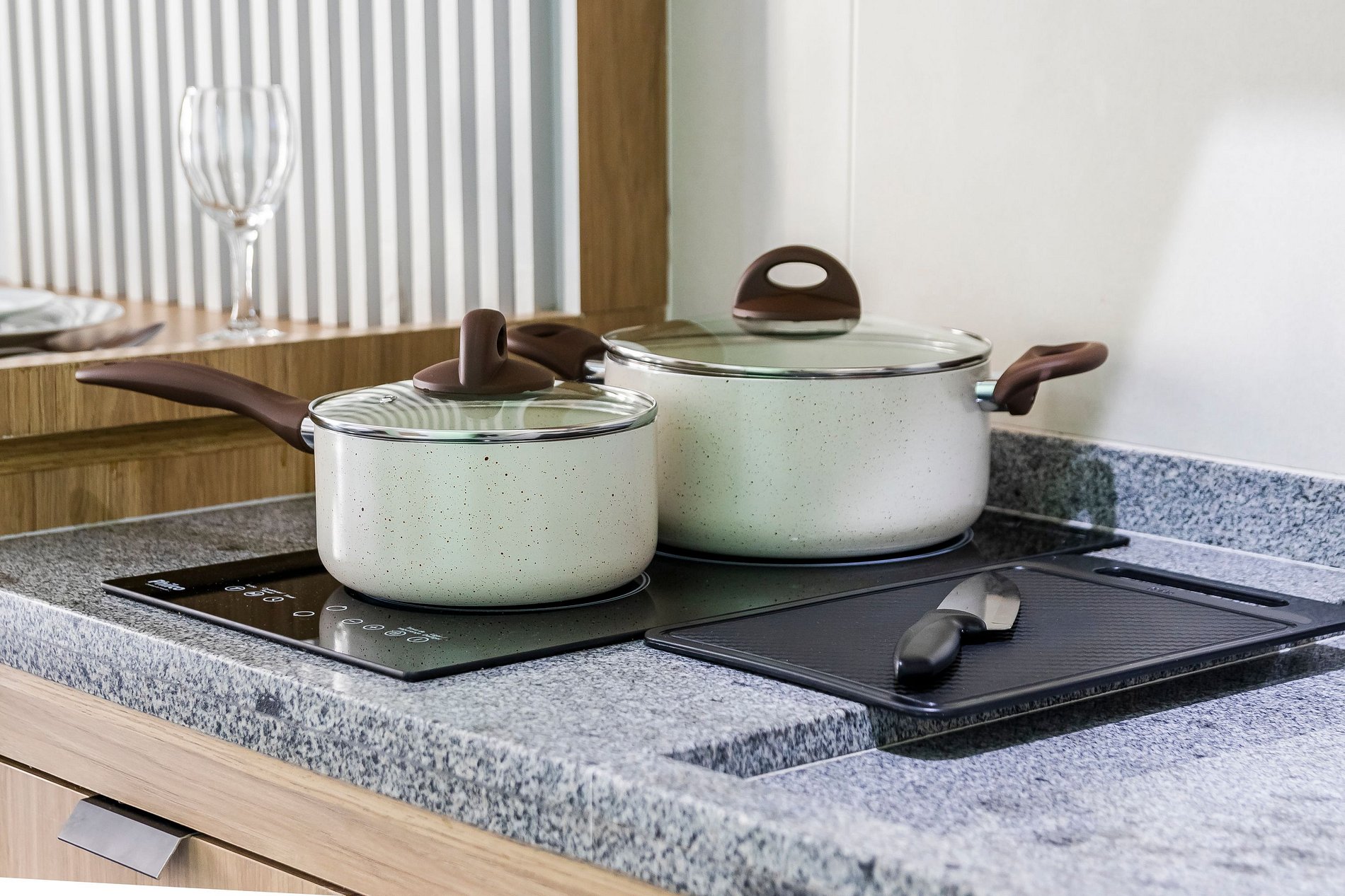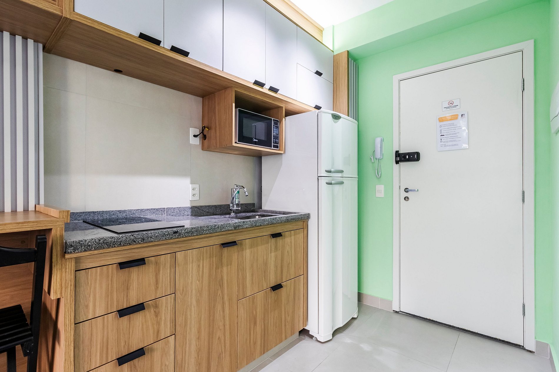 - Cozinha completa, equipada com geladeira, microondas, cooktop de indução de duas bocas e diversos utensílios.