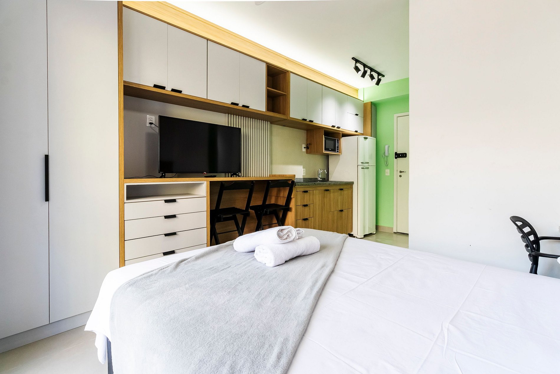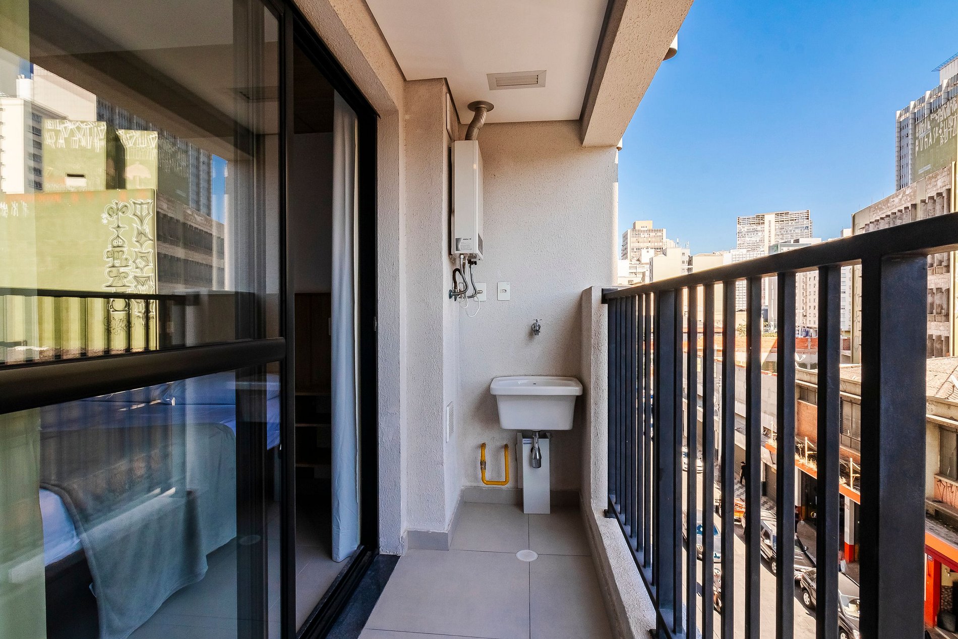 Os hóspedes podem acessar áreas comuns como Piscina, Mini Mercado, Rooftop, Coworking e Lavanderia.