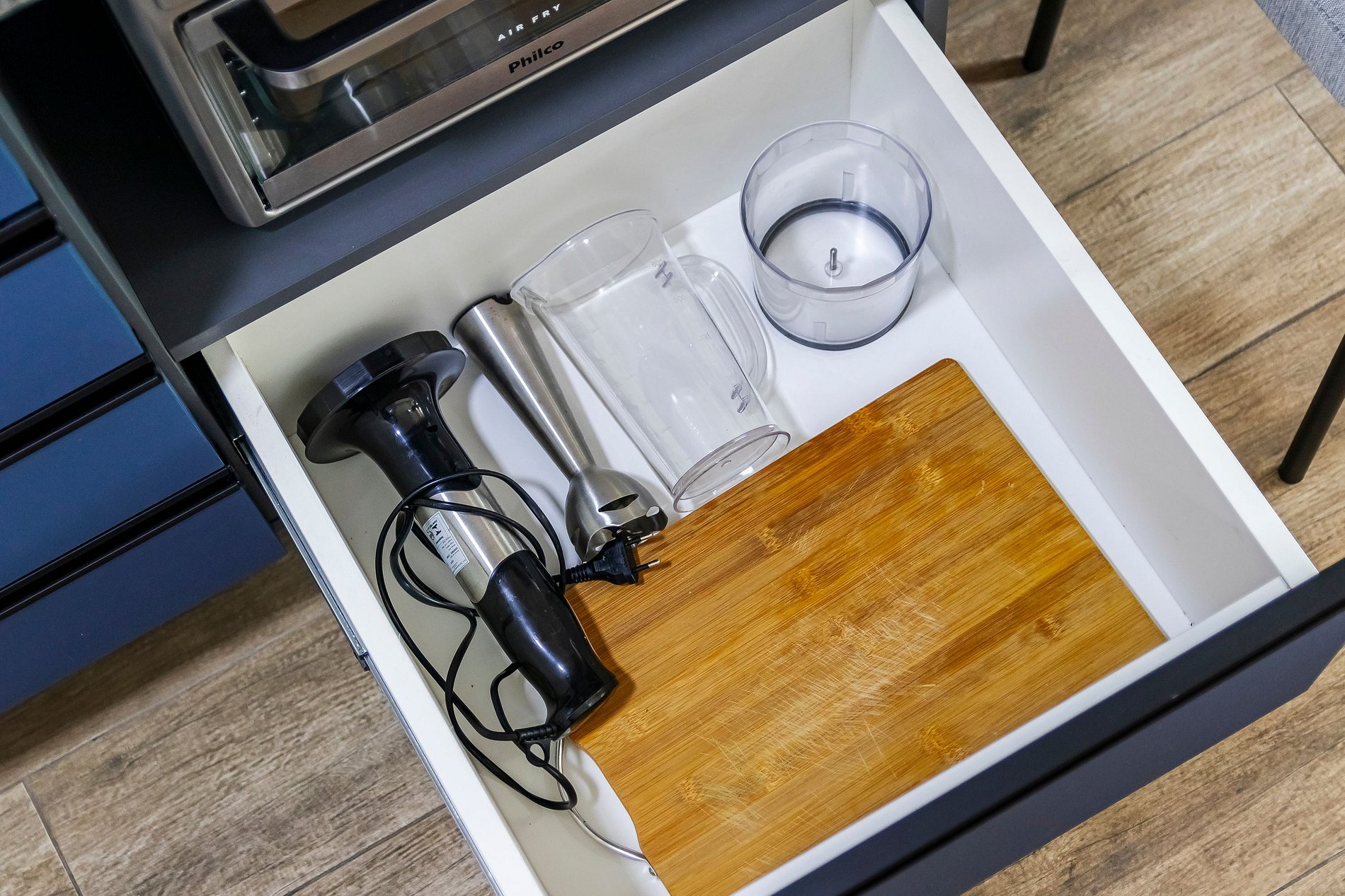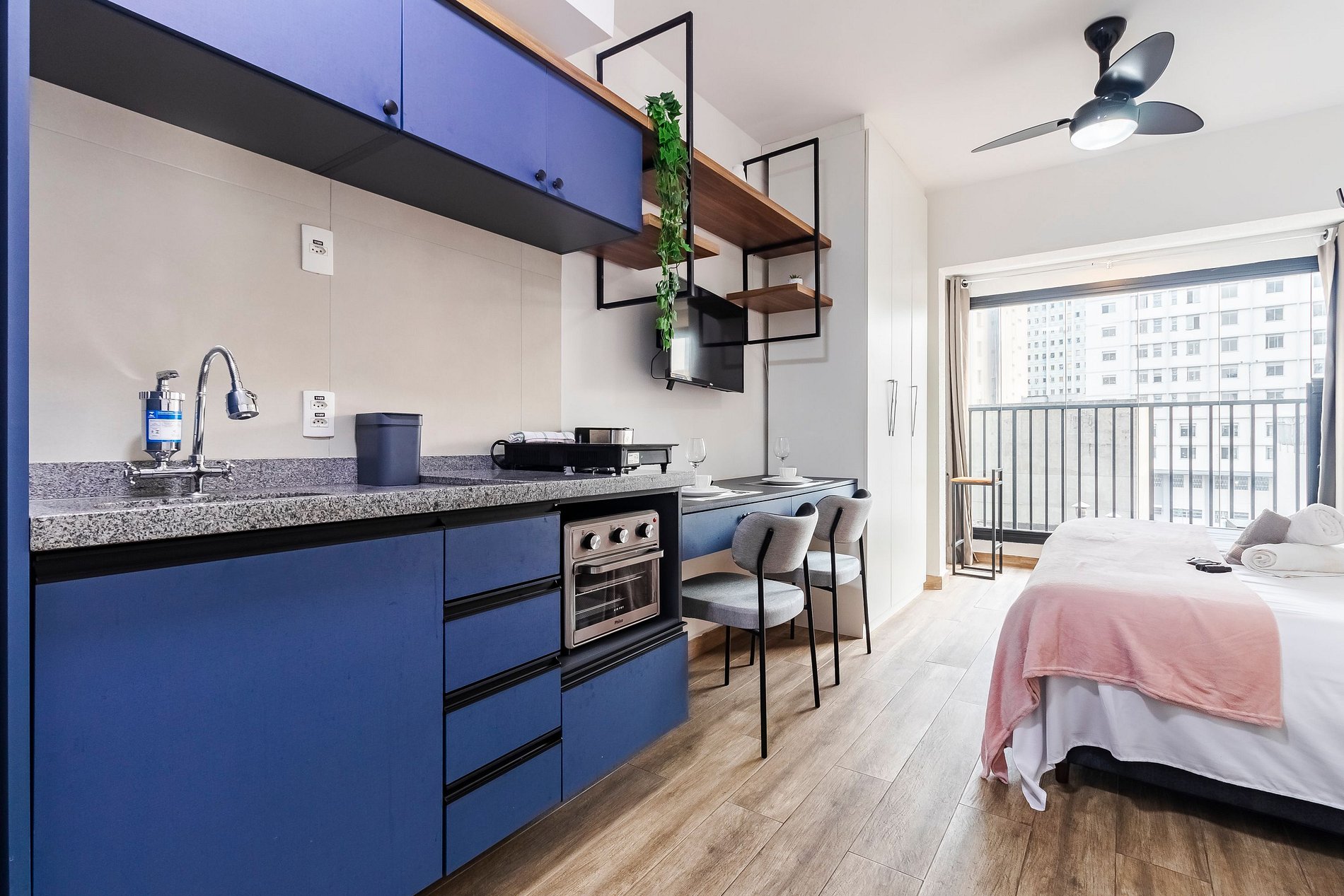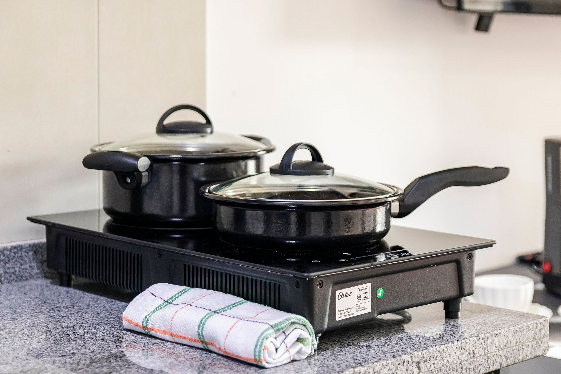 - Cozinha completa, equipada com, microondas/forno/airfryer, cooktop de indução de duas bocas e diversos utensílios