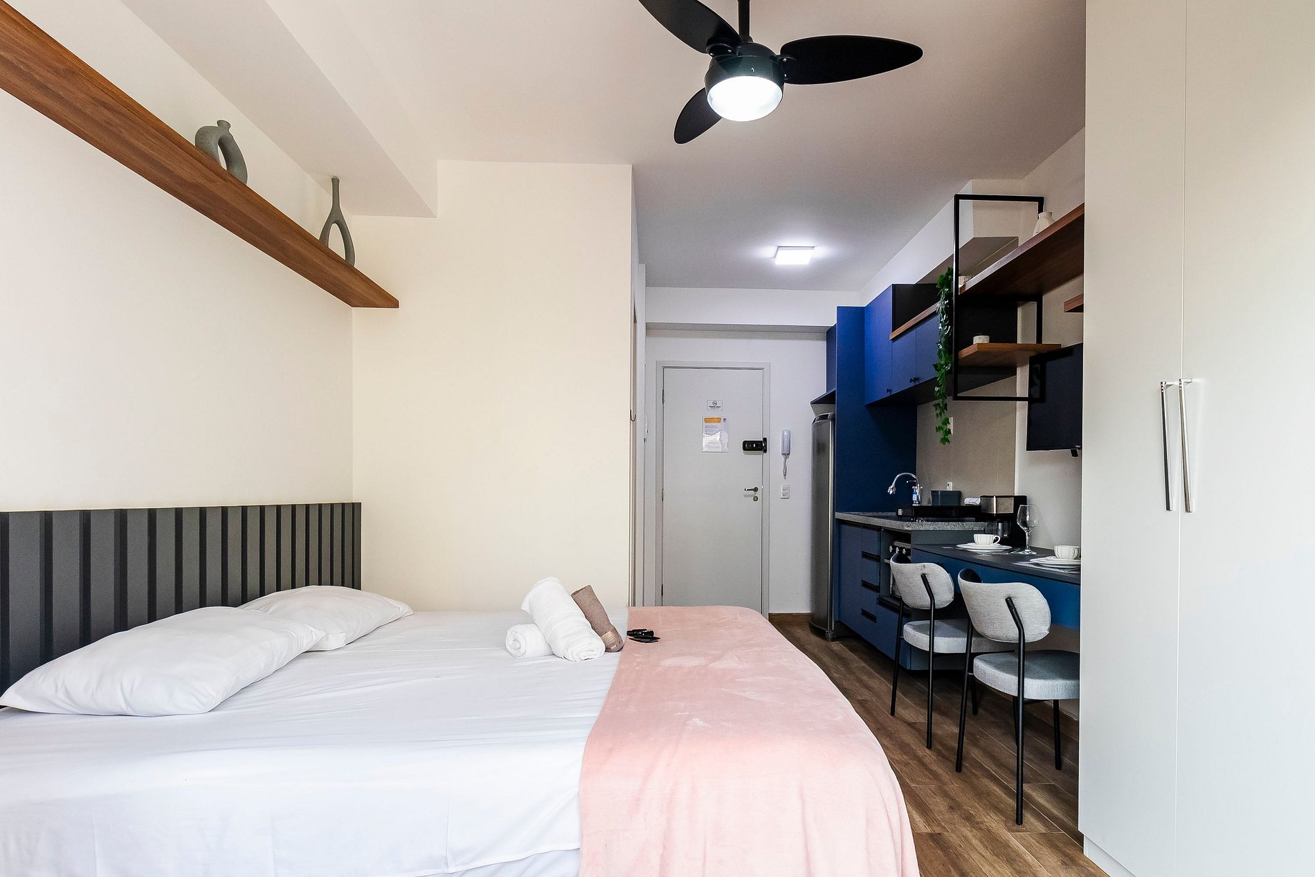 Os hóspedes podem acessar áreas comuns como Piscina, Mini Mercado, Rooftop, Coworking e Lavanderia.