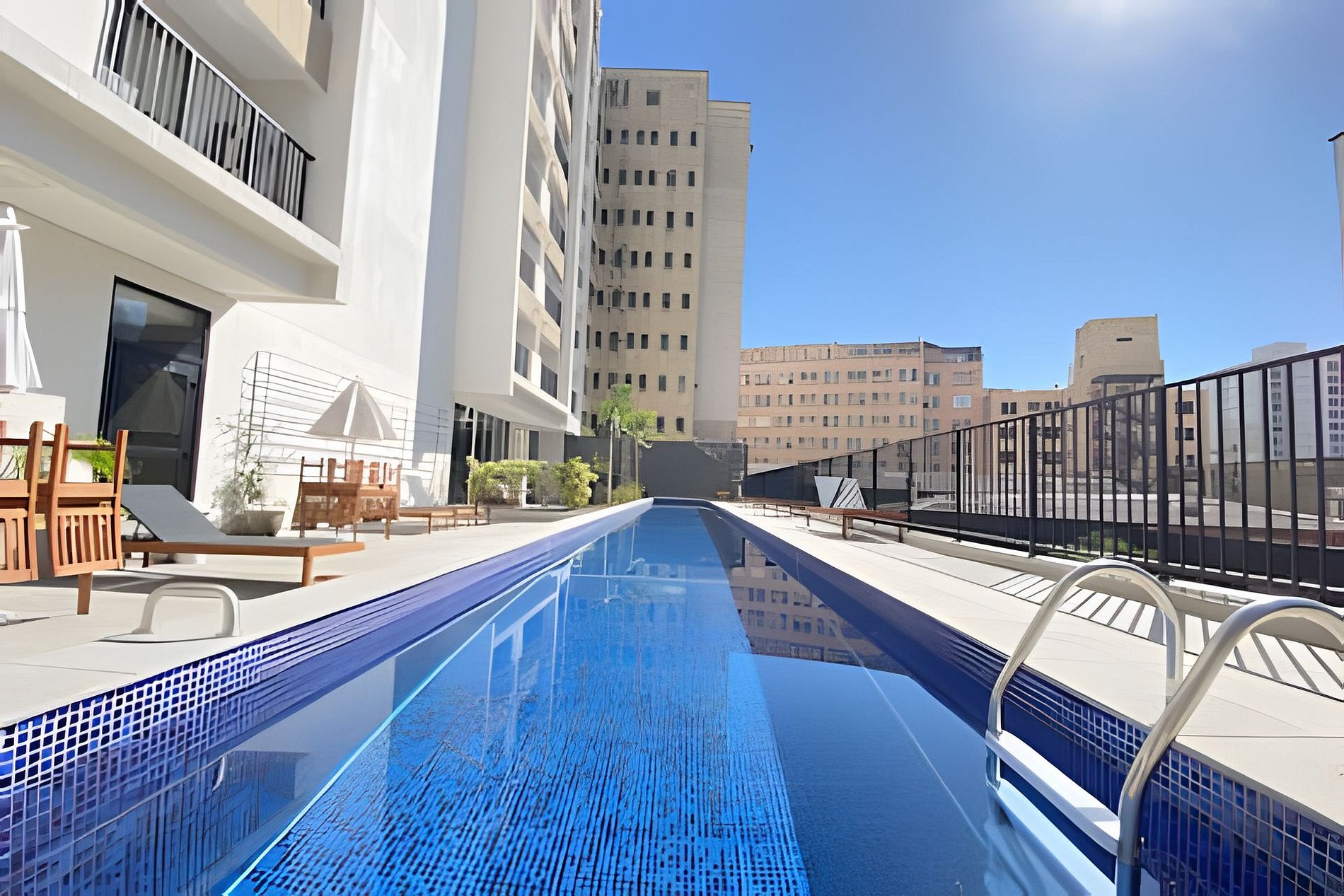 Os hóspedes podem acessar áreas comuns como Piscina, Mini Mercado, Rooftop, Coworking e Lavanderia.