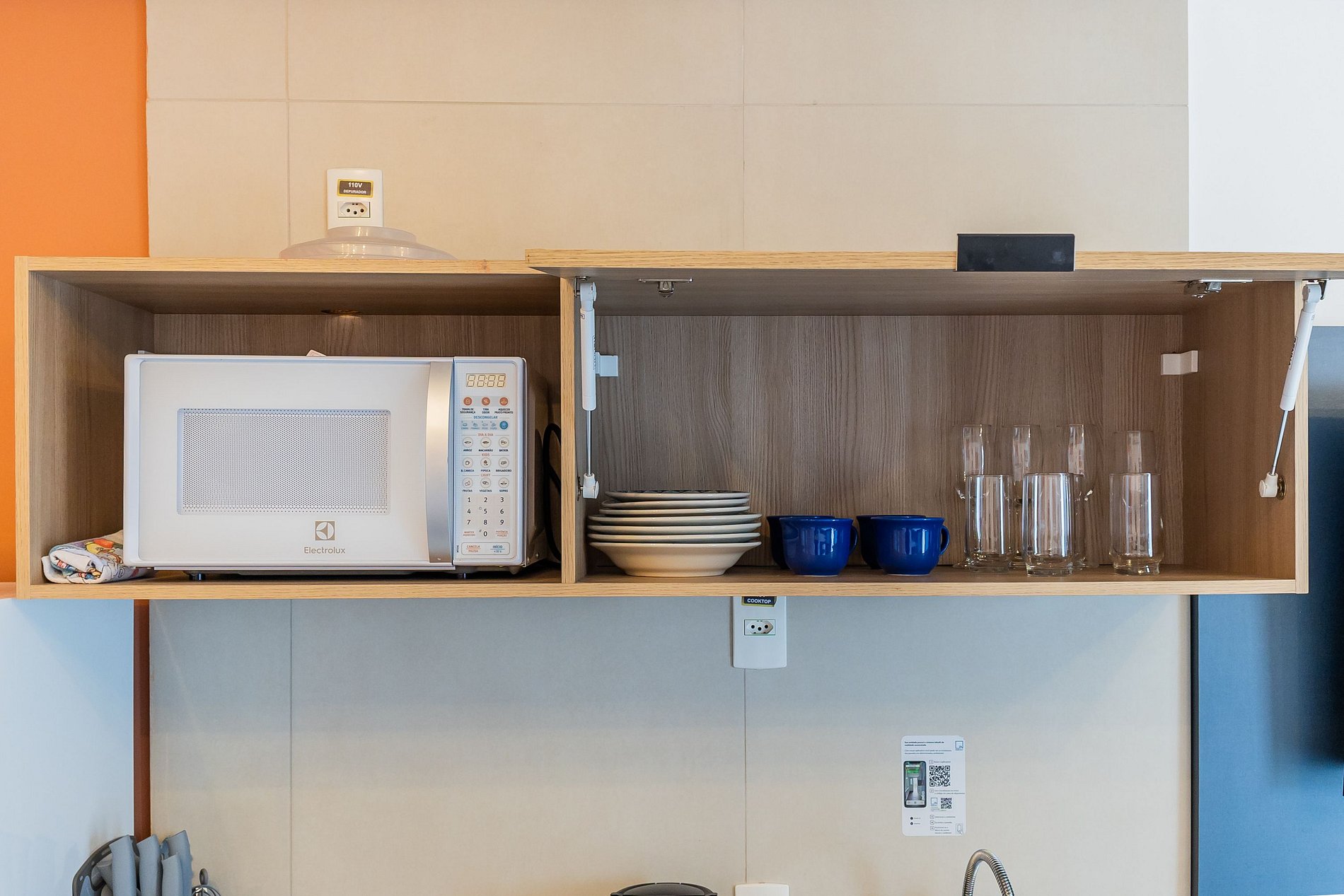 - Cozinha completa, equipada com geladeira, micro-ondas, cooktop de duas bocas e demais utensílios.