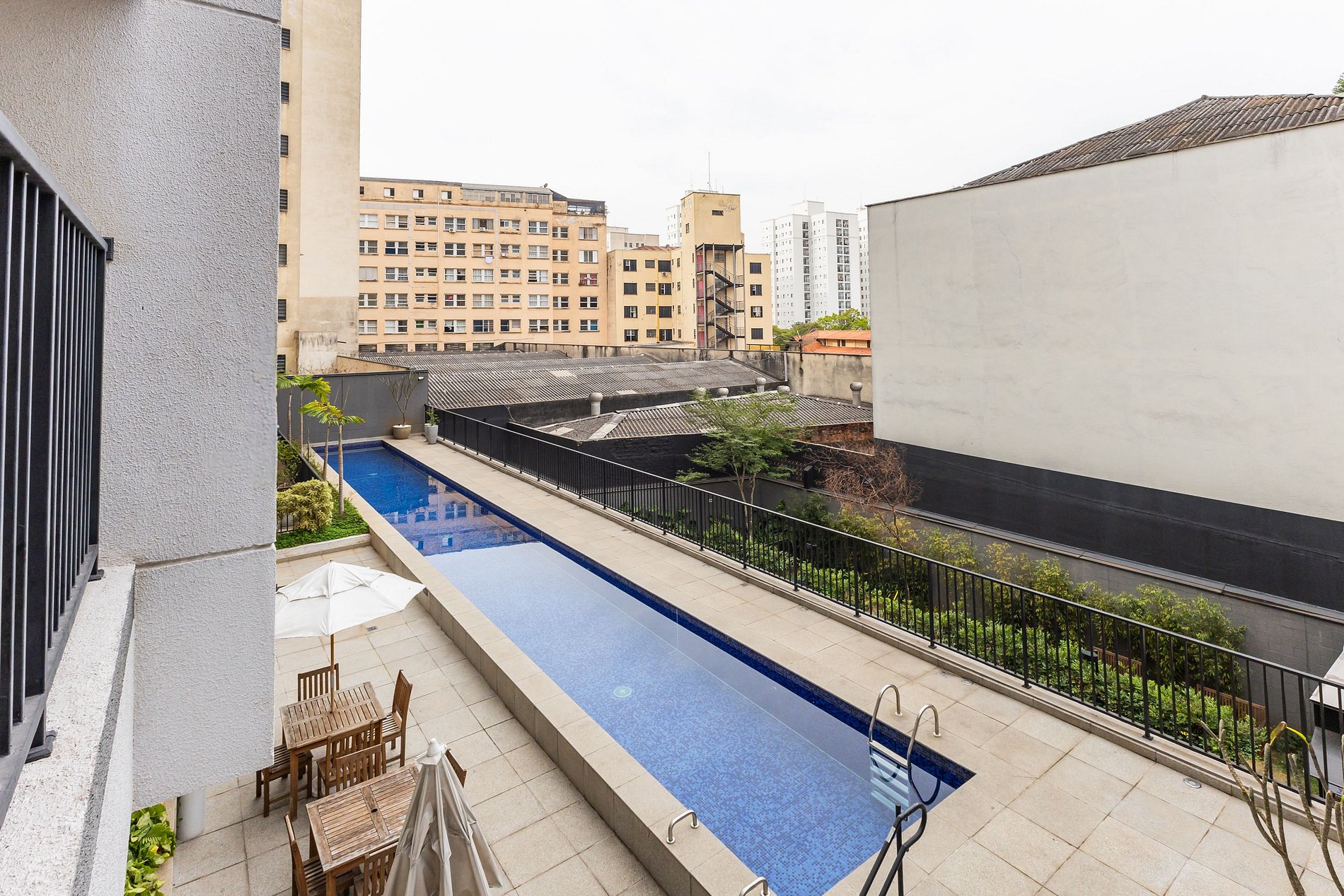 Os hóspedes podem acessar áreas comuns como Piscina, Mini Mercado, Rooftop, Coworking e Lavanderia.