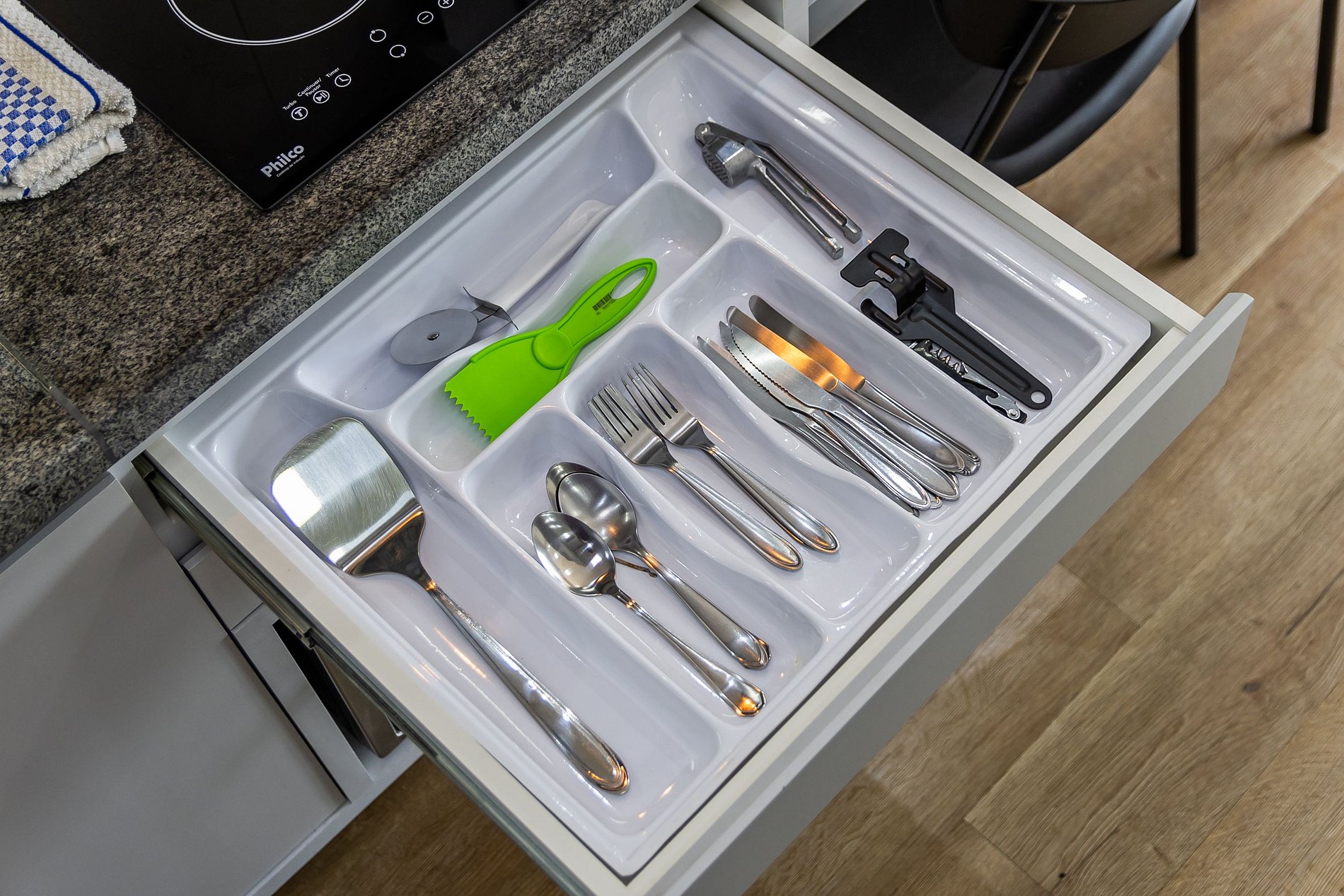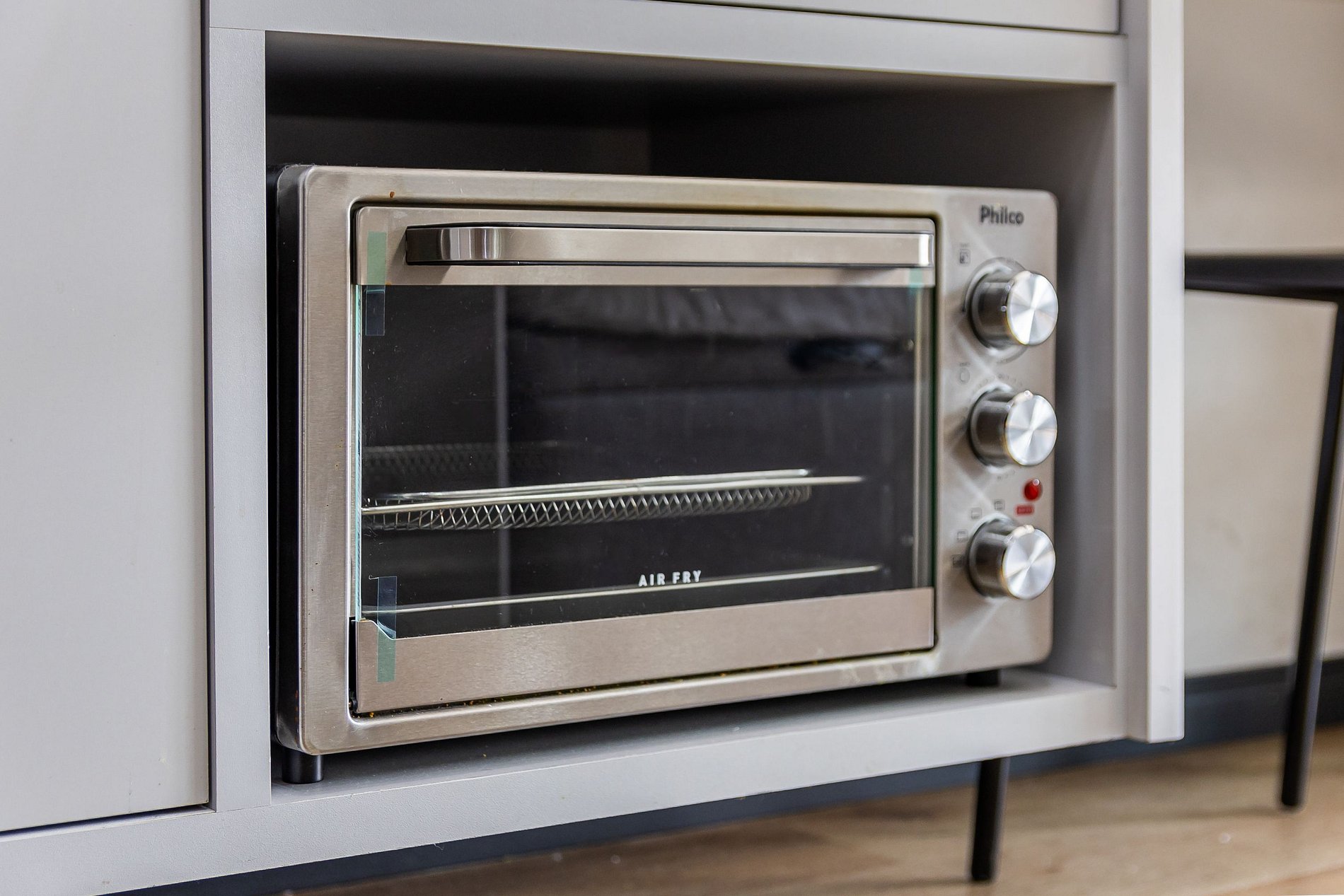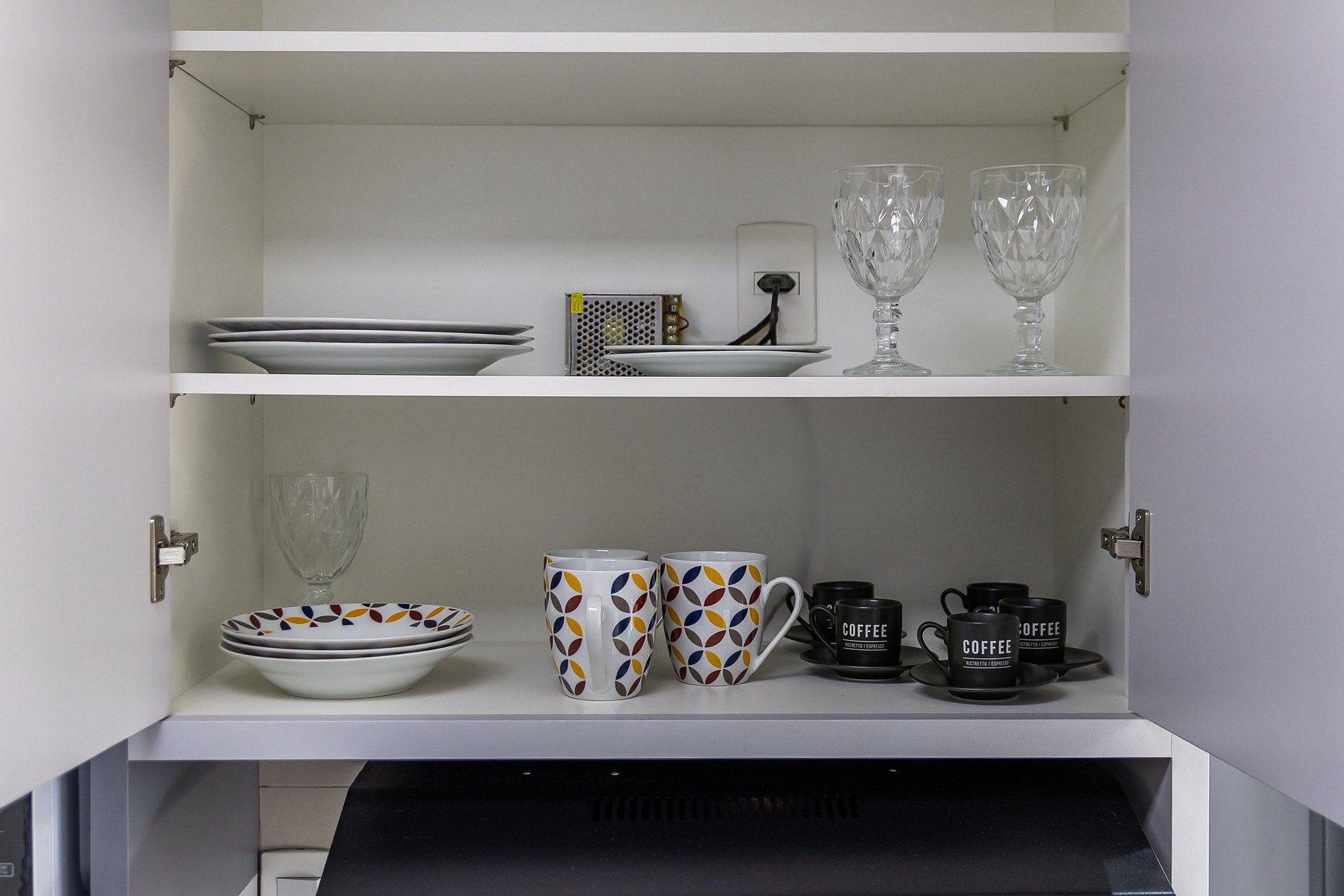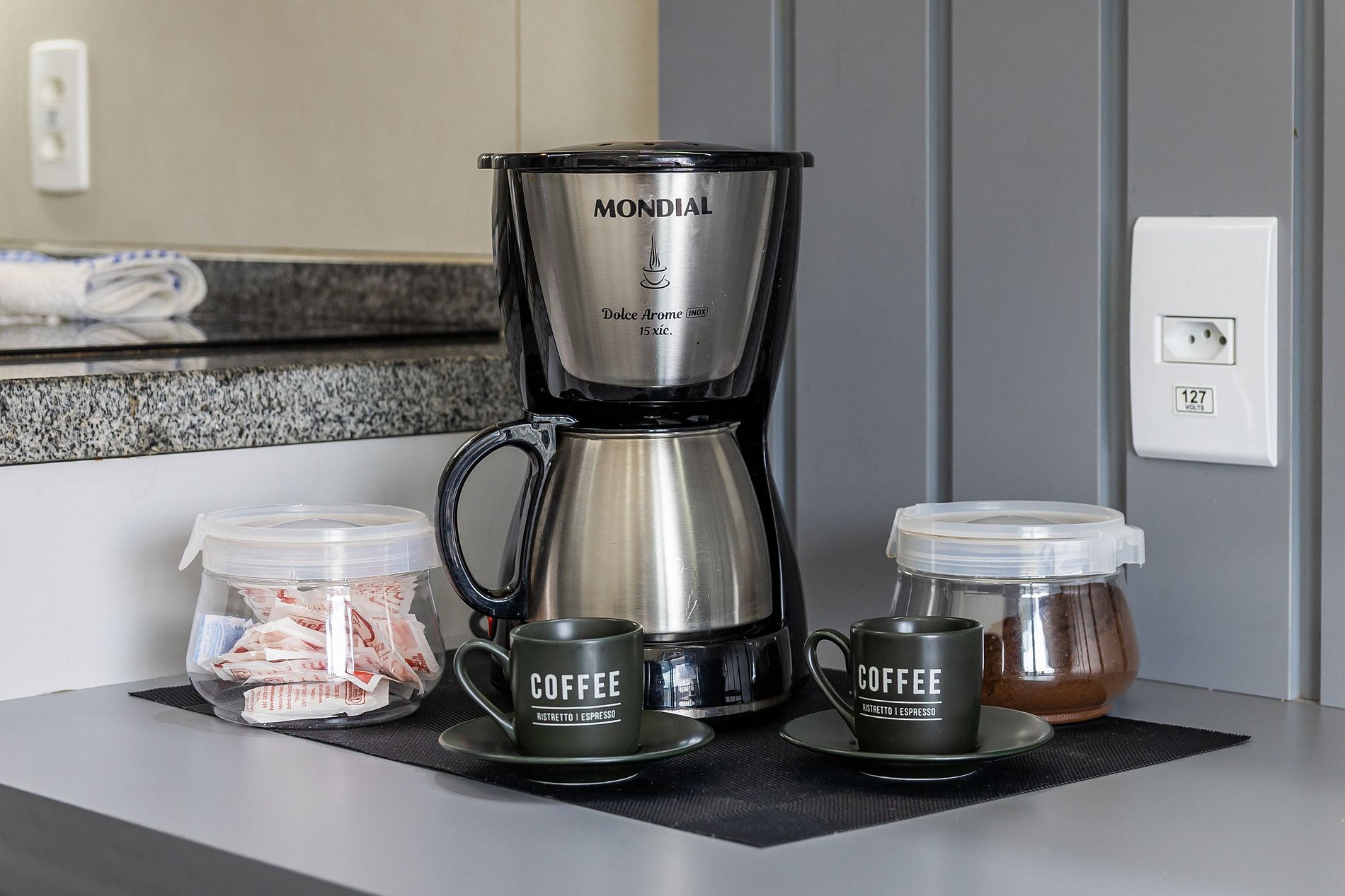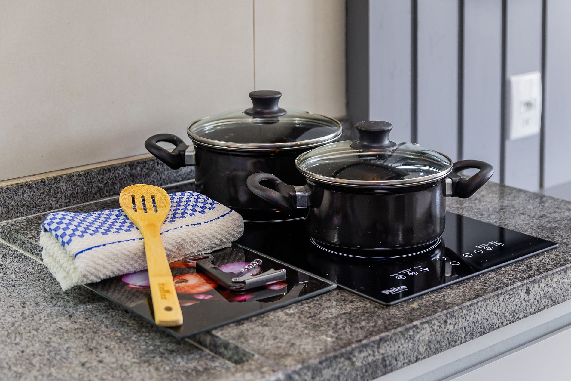 - Cozinha completa, equipada com geladeira, microondas, cafeteira elétrica, panelas, cooktop de indução de duas bocas e demais itens