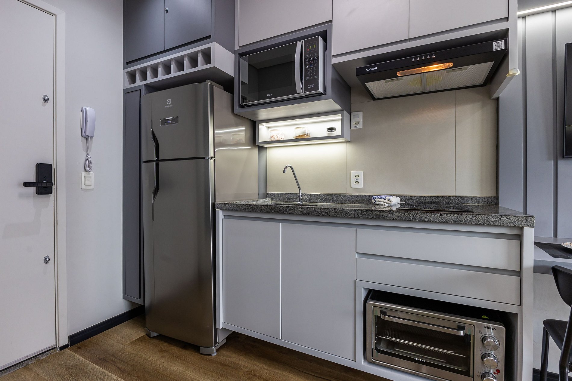 - Cozinha completa, equipada com geladeira, microondas, cafeteira elétrica, panelas, cooktop de indução de duas bocas e demais itens