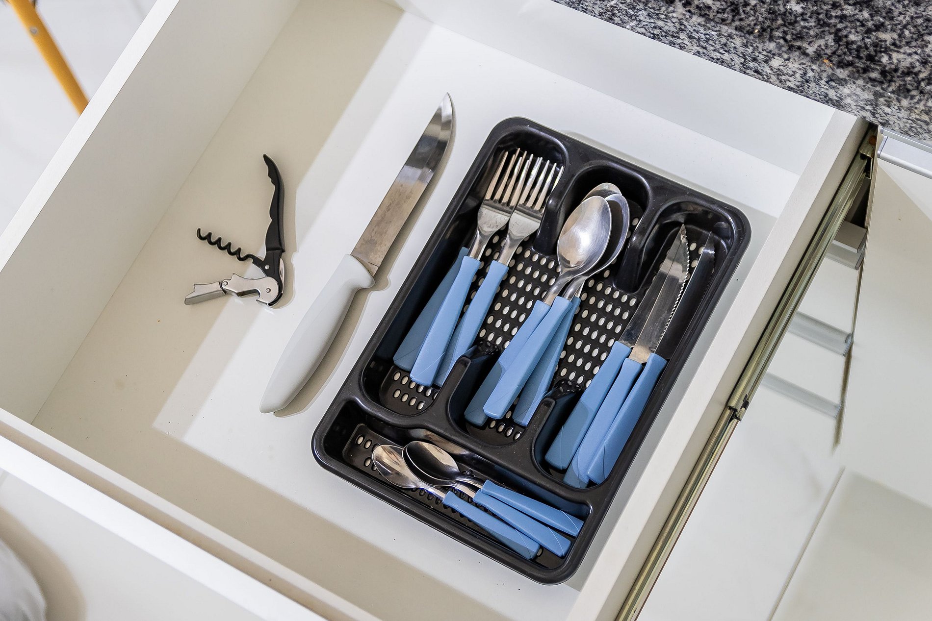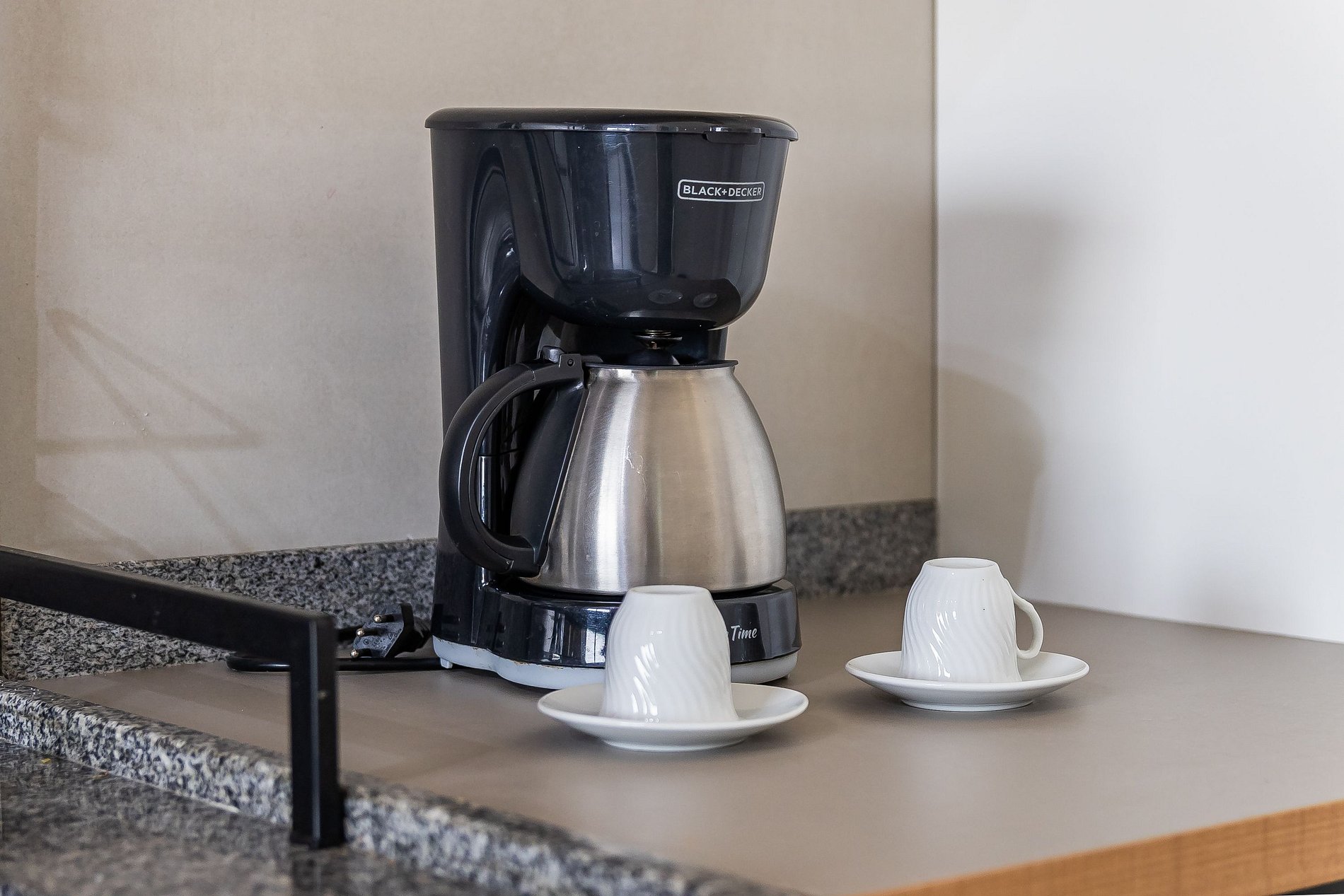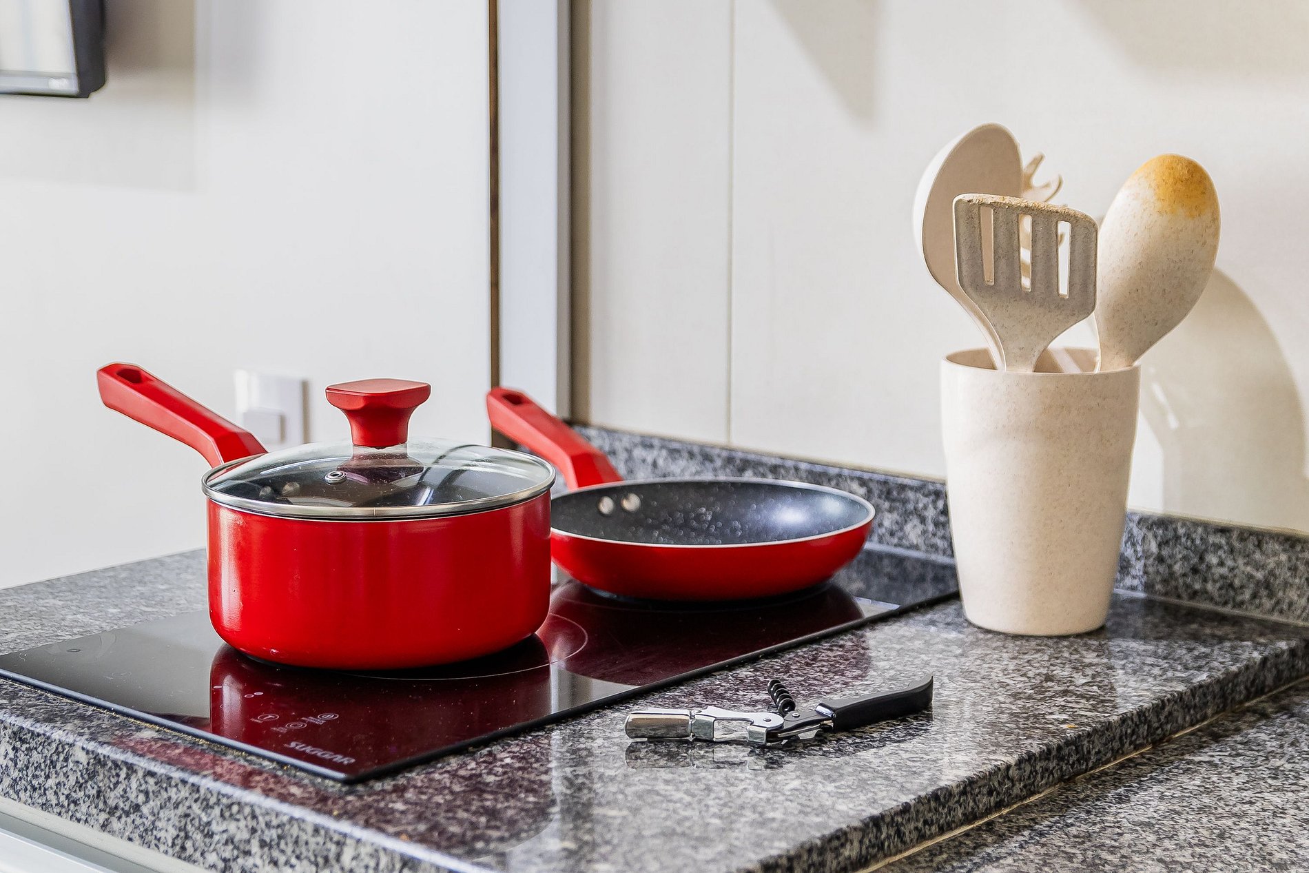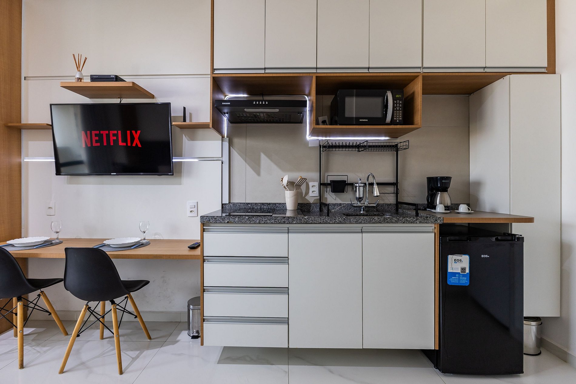 - Cozinha completa, equipada com frigobar, microondas, cafeteira elétrica, panelas, cooktop de indução de duas bocas e demais itens.