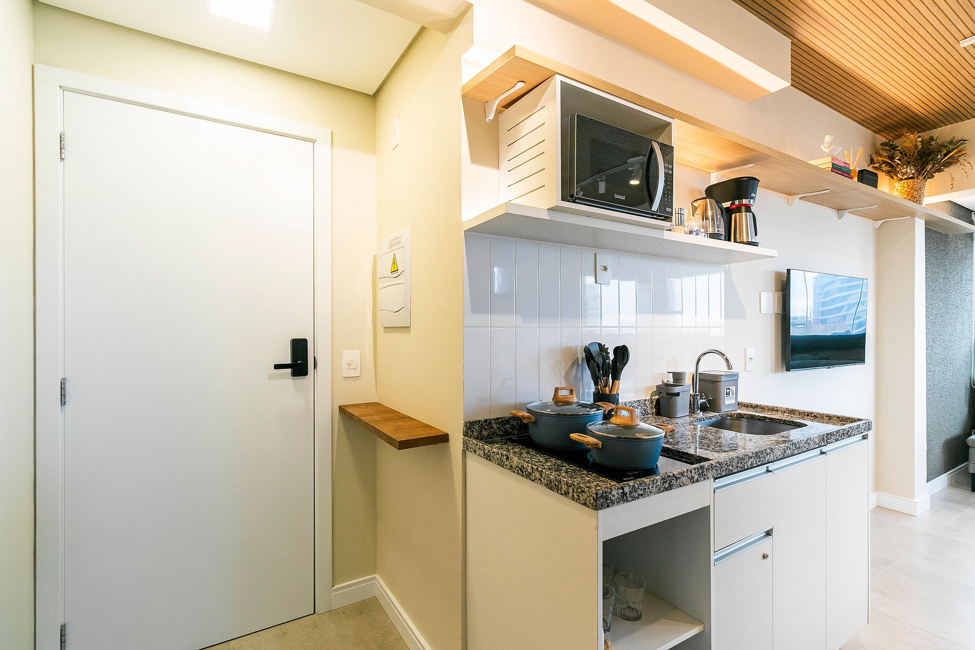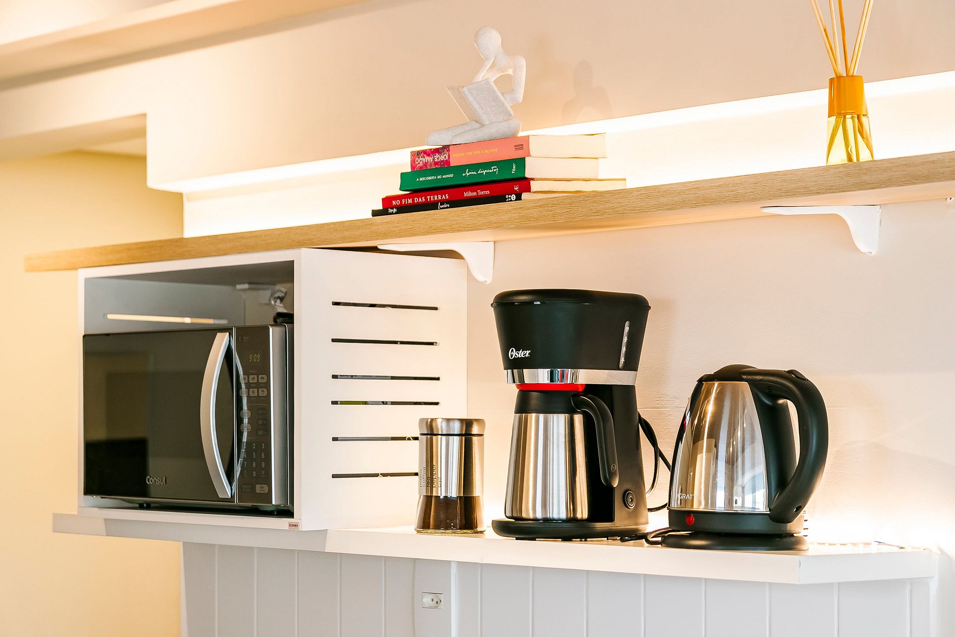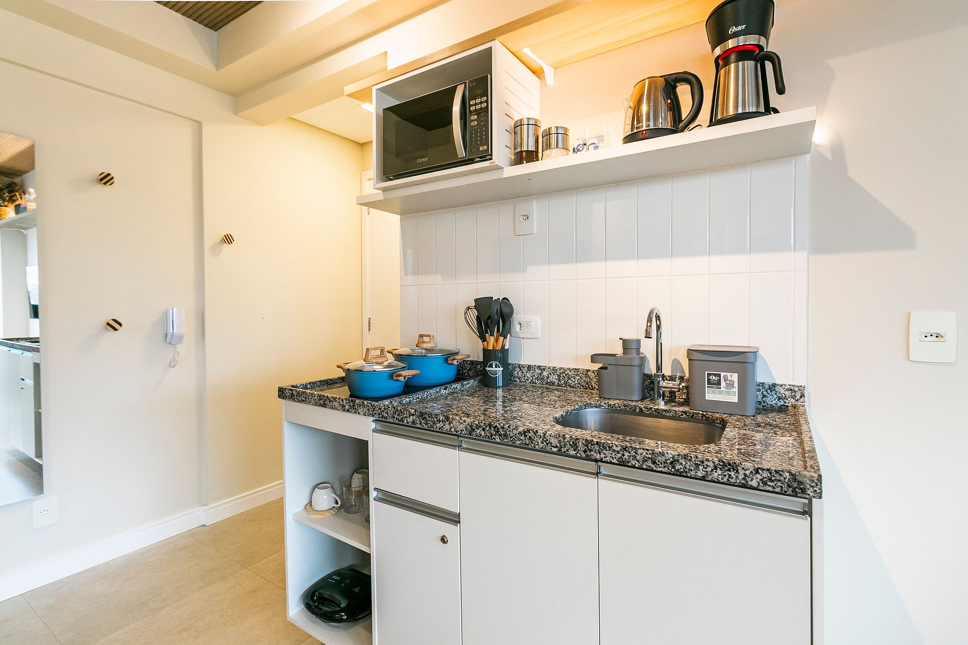 - Cozinha completa, equipada com geladeira, microondas, cooktop de indução de duas bocas e demais utensílios.