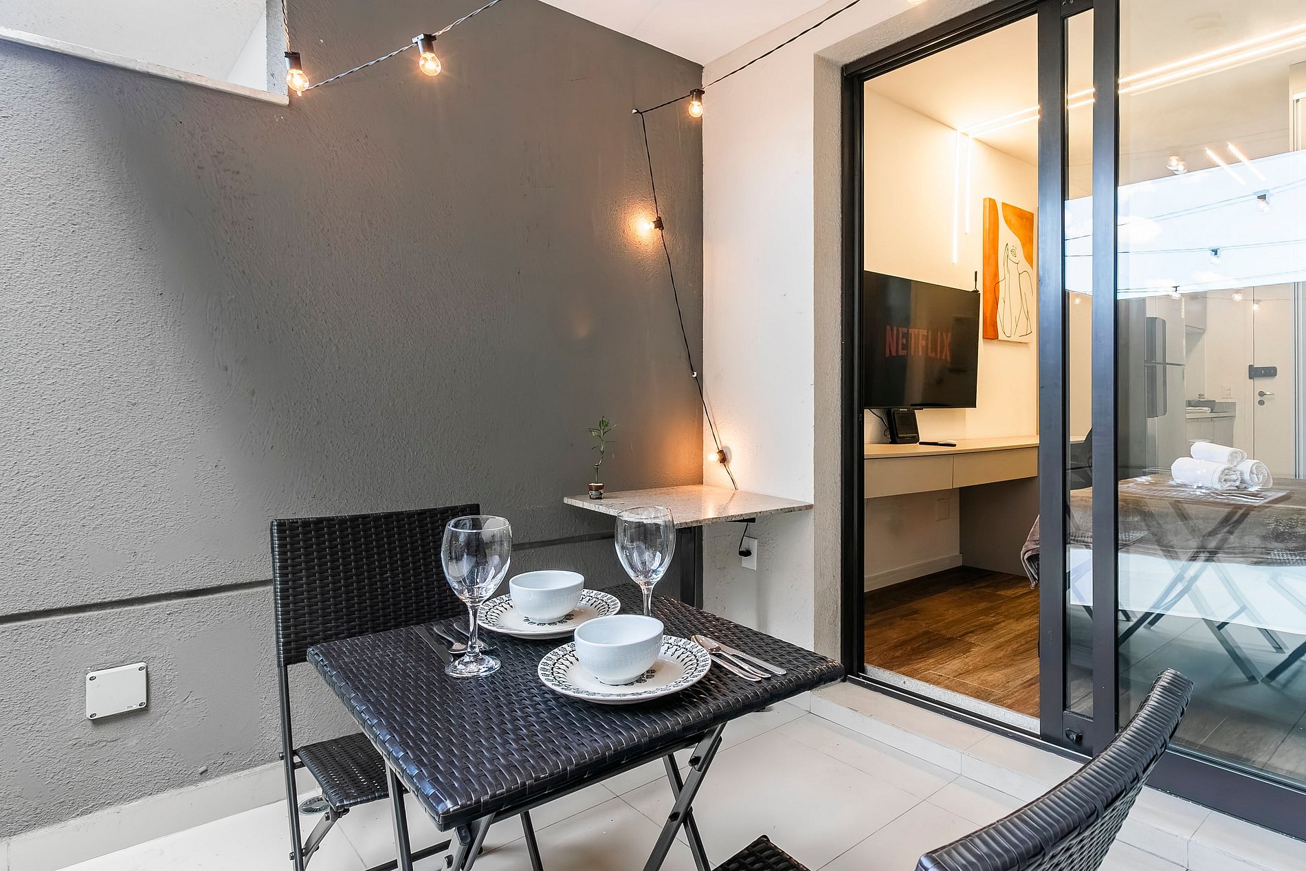 Apartamento charmoso com um quintal no lugar da sacada, oferecendo um espaço ao ar livre perfeito para relaxar. Ideal para quem busca uma experiência única e confortável durante a estadia.