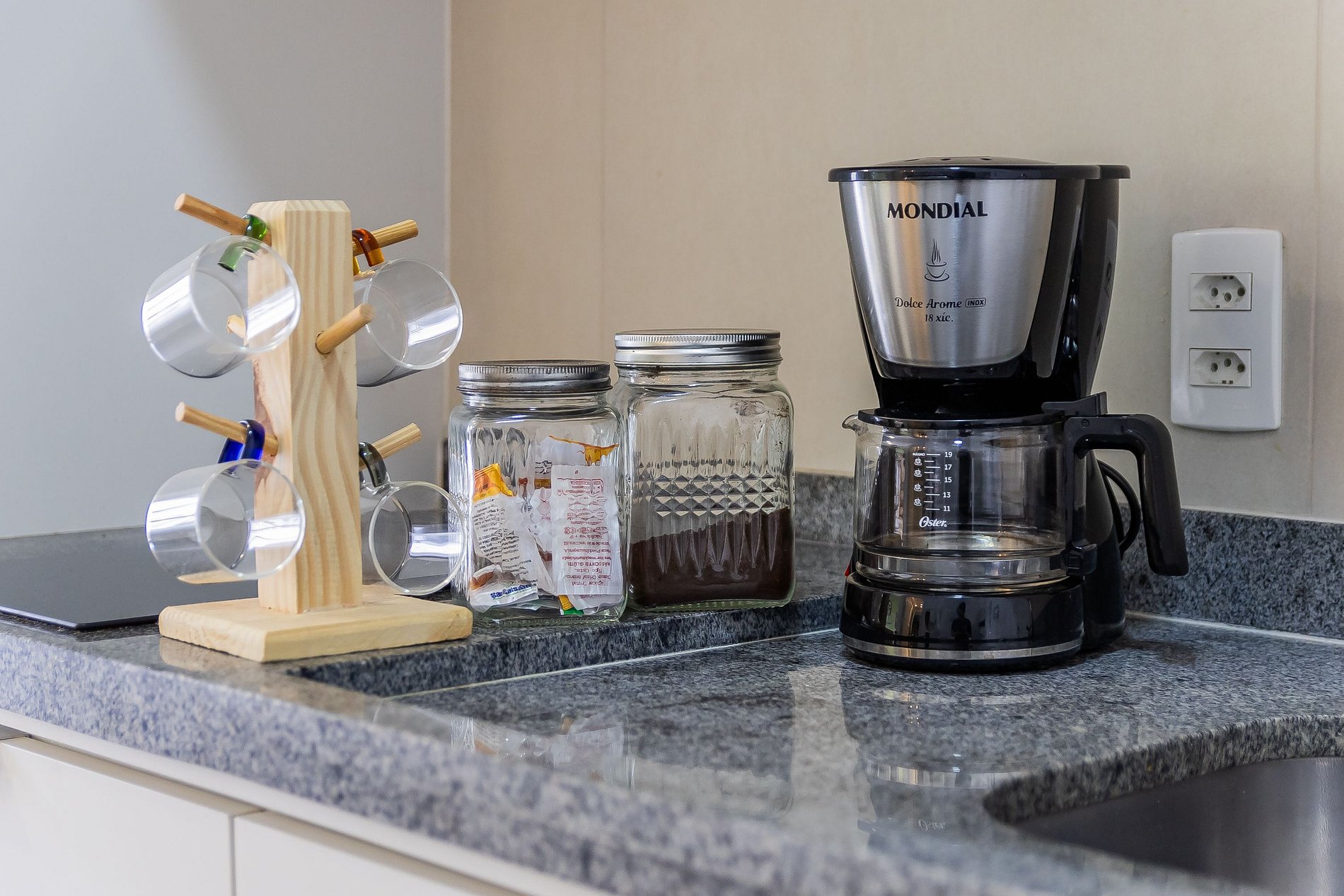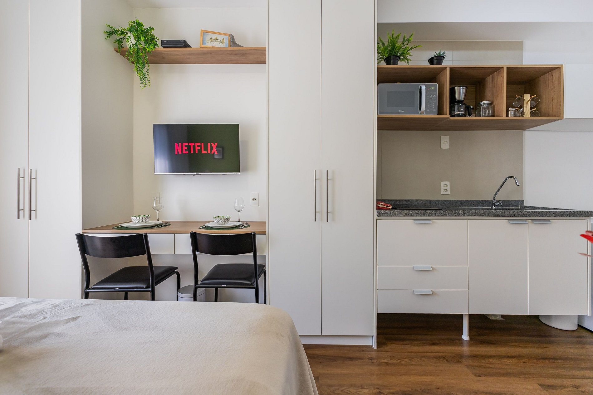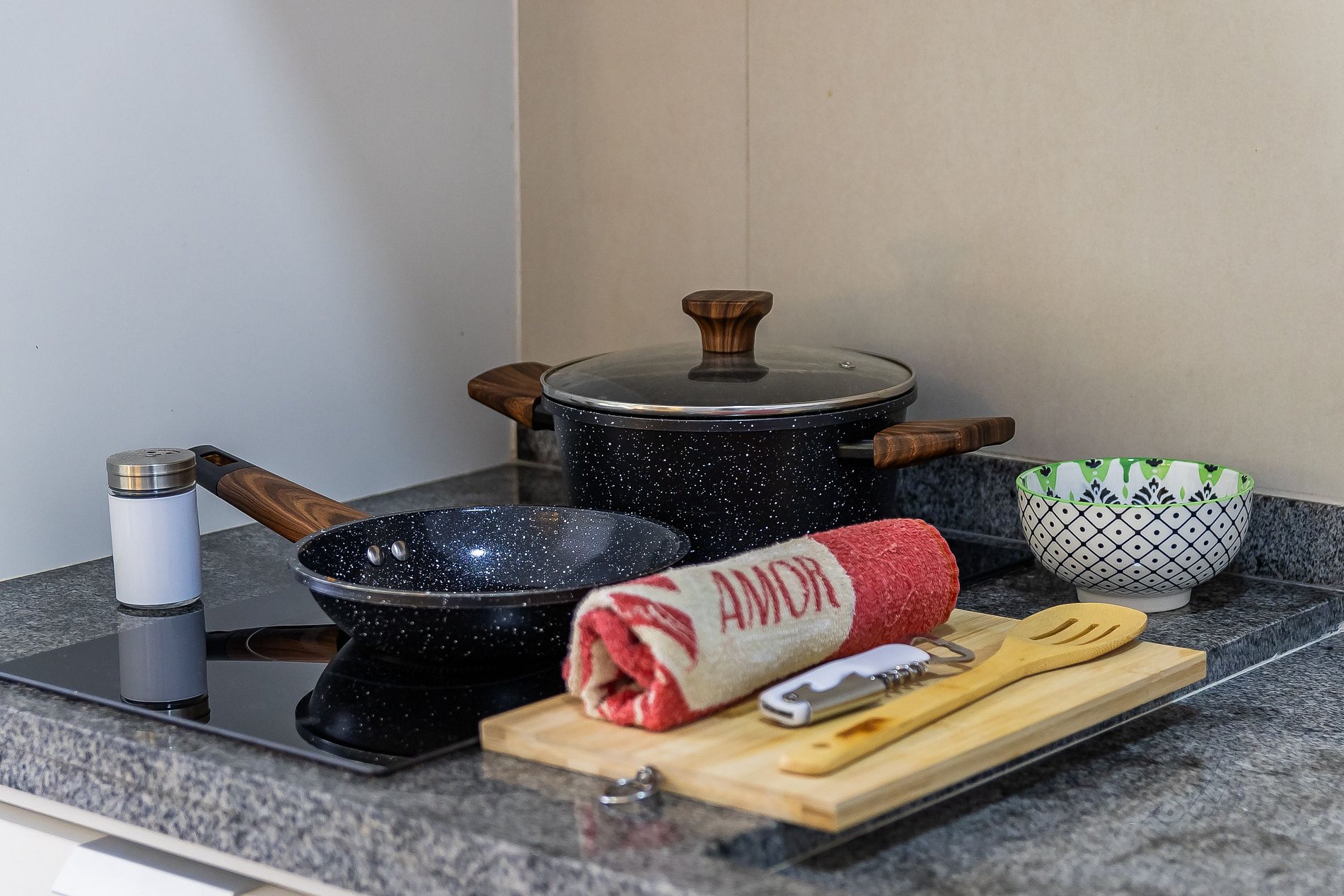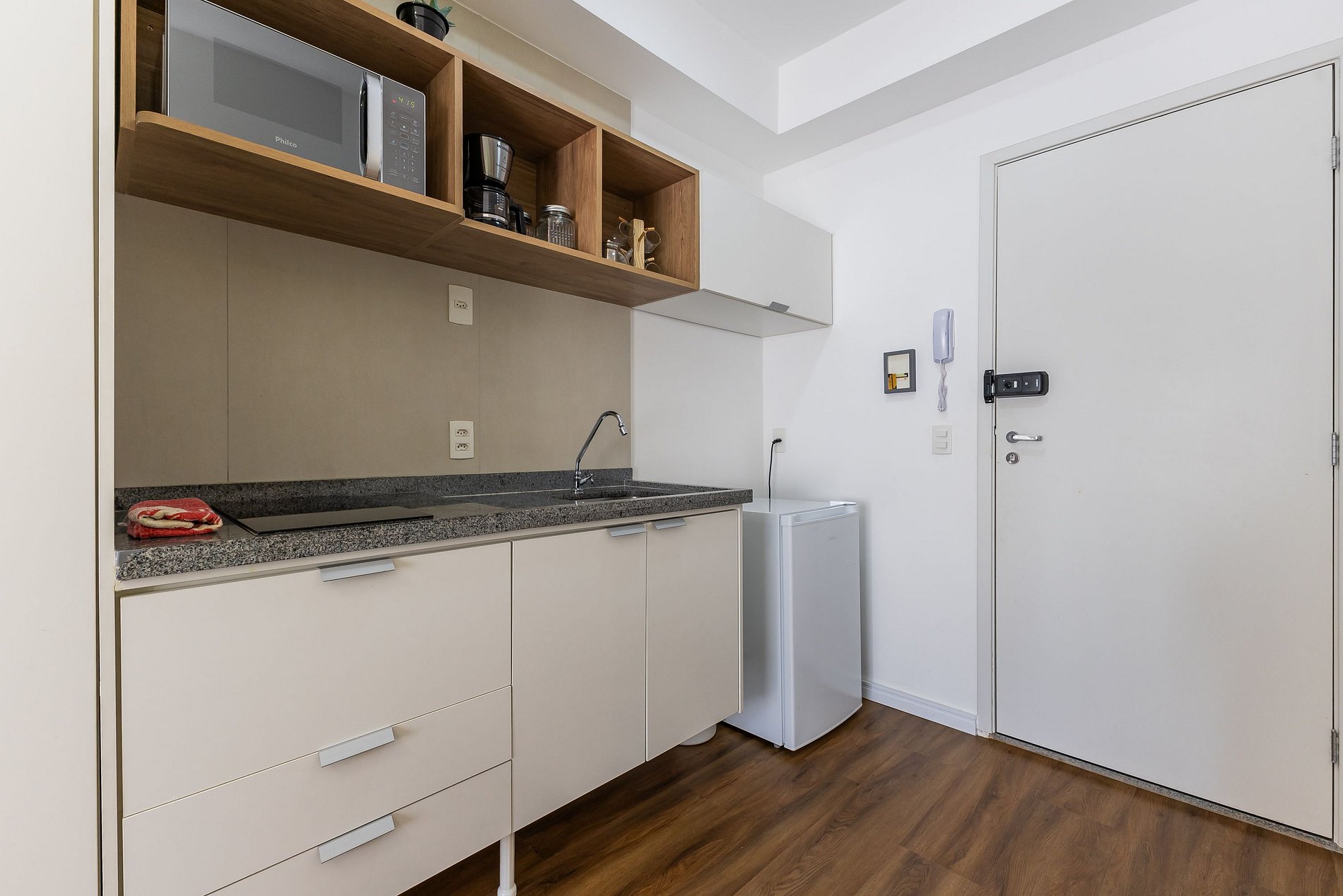 - Cozinha completa, equipada com frigobar grande, microondas e cooktop de indução de duas bocas.