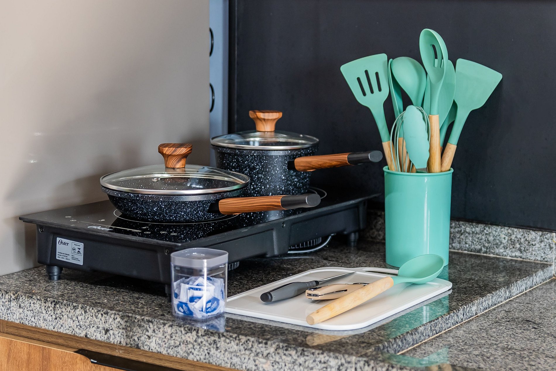 - Cozinha completa, equipada com geladeira, micro-ondas, cooktop de duas bocas e demais utensílios.
