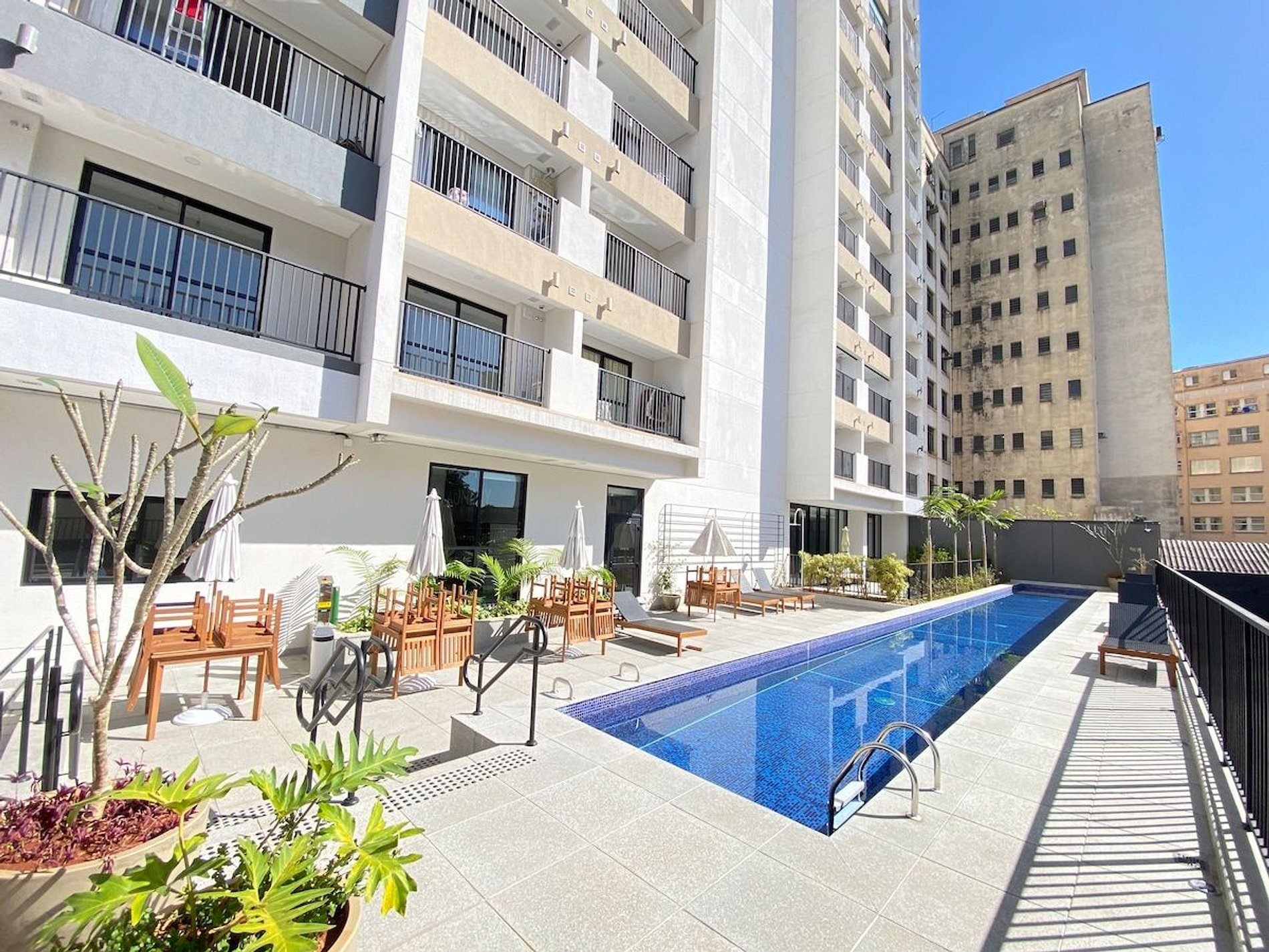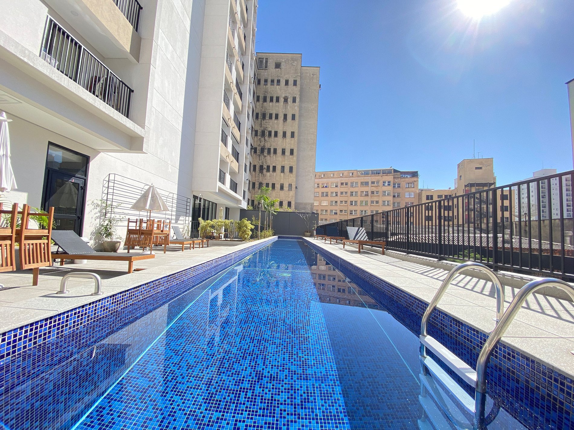 Os hóspedes podem acessar áreas comuns como Piscina, Lavanderia, Coworking e Rooftop.