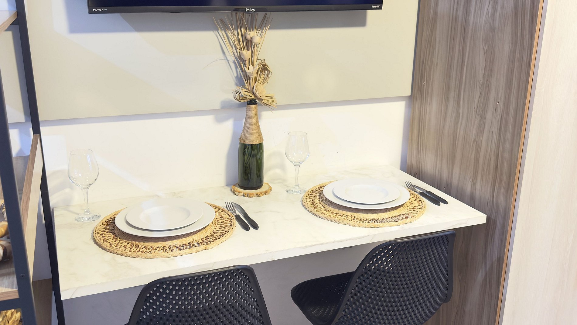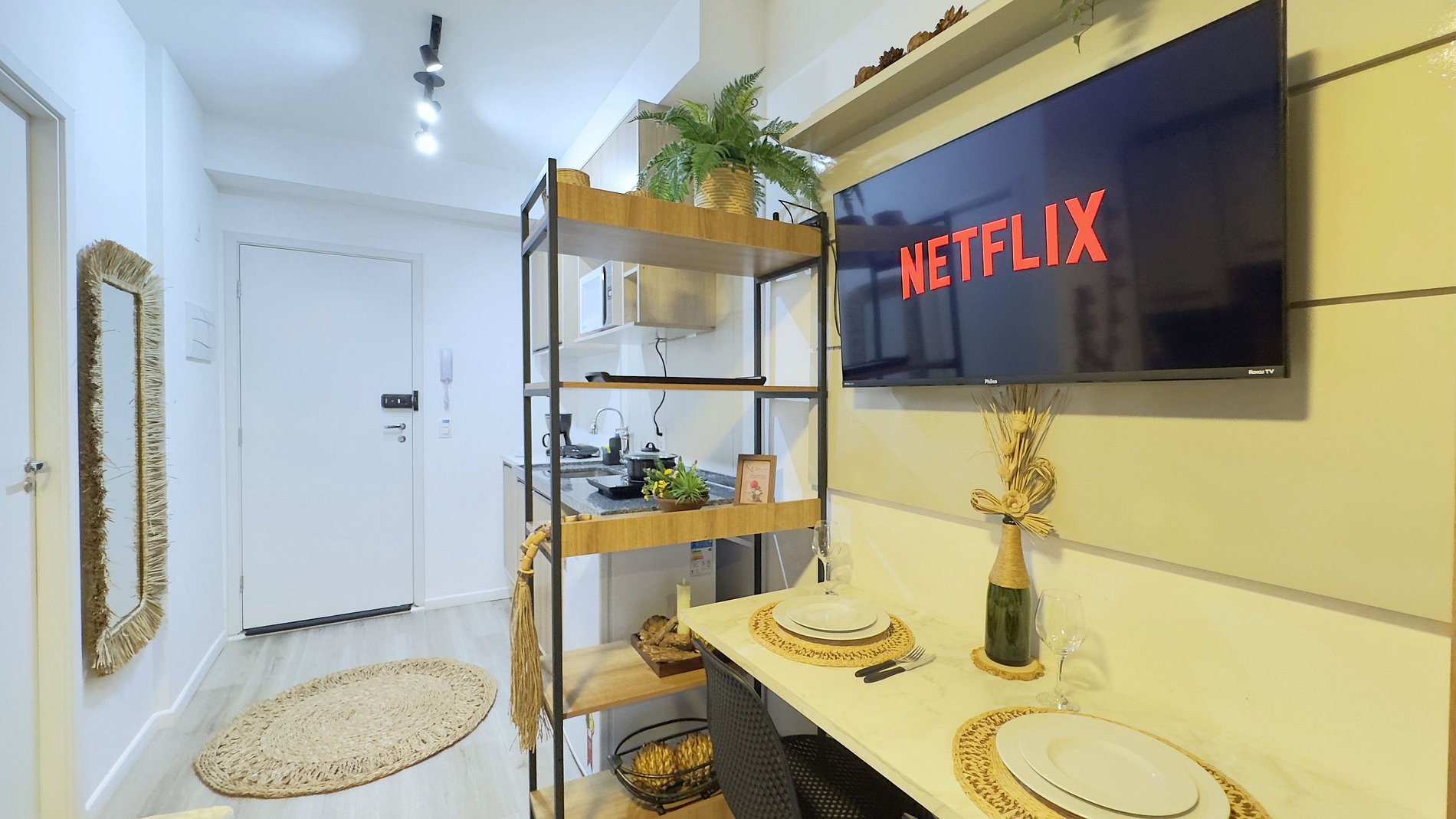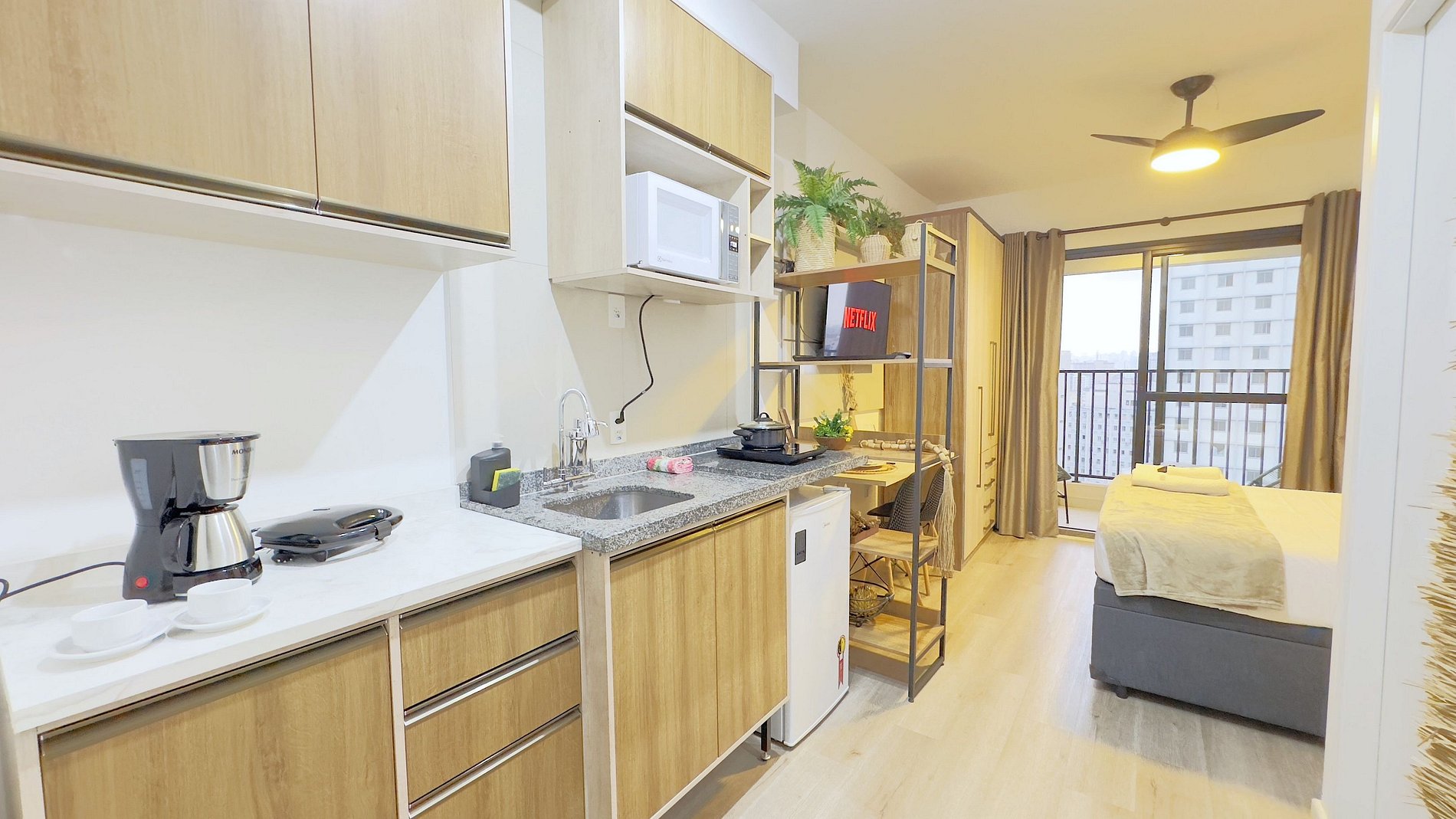 - Cozinha completa, equipada com frigobar grande, microondas e cooktop de indução de uma boca.