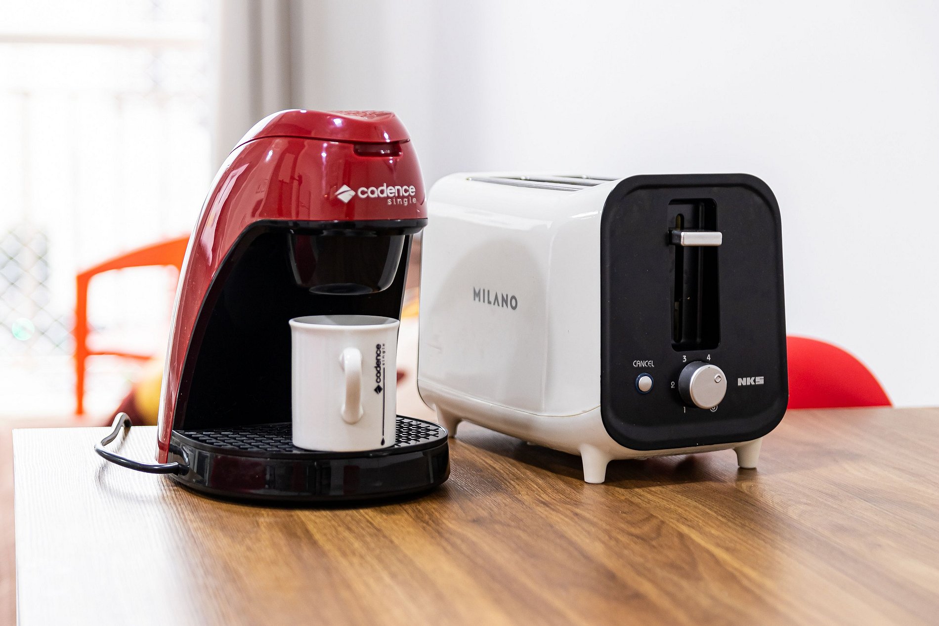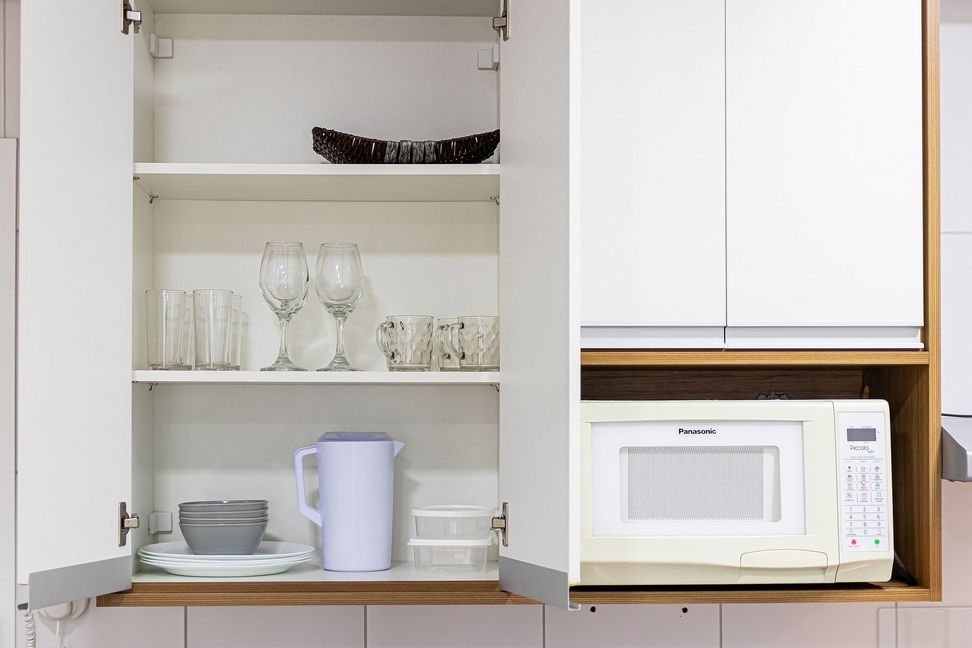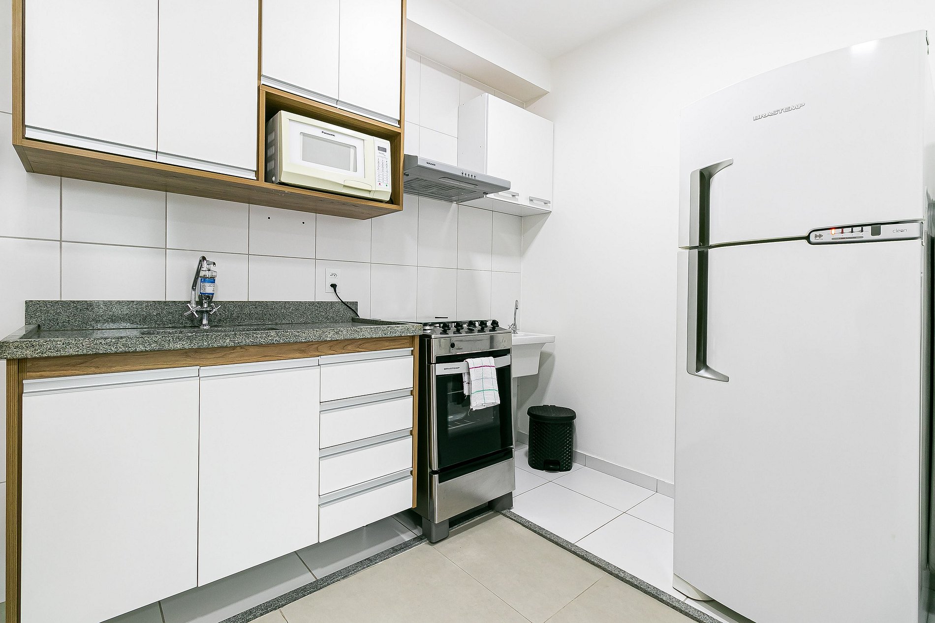 - Cozinha equipada com geladeira, microondas e fogão de quatro bocas e forno.