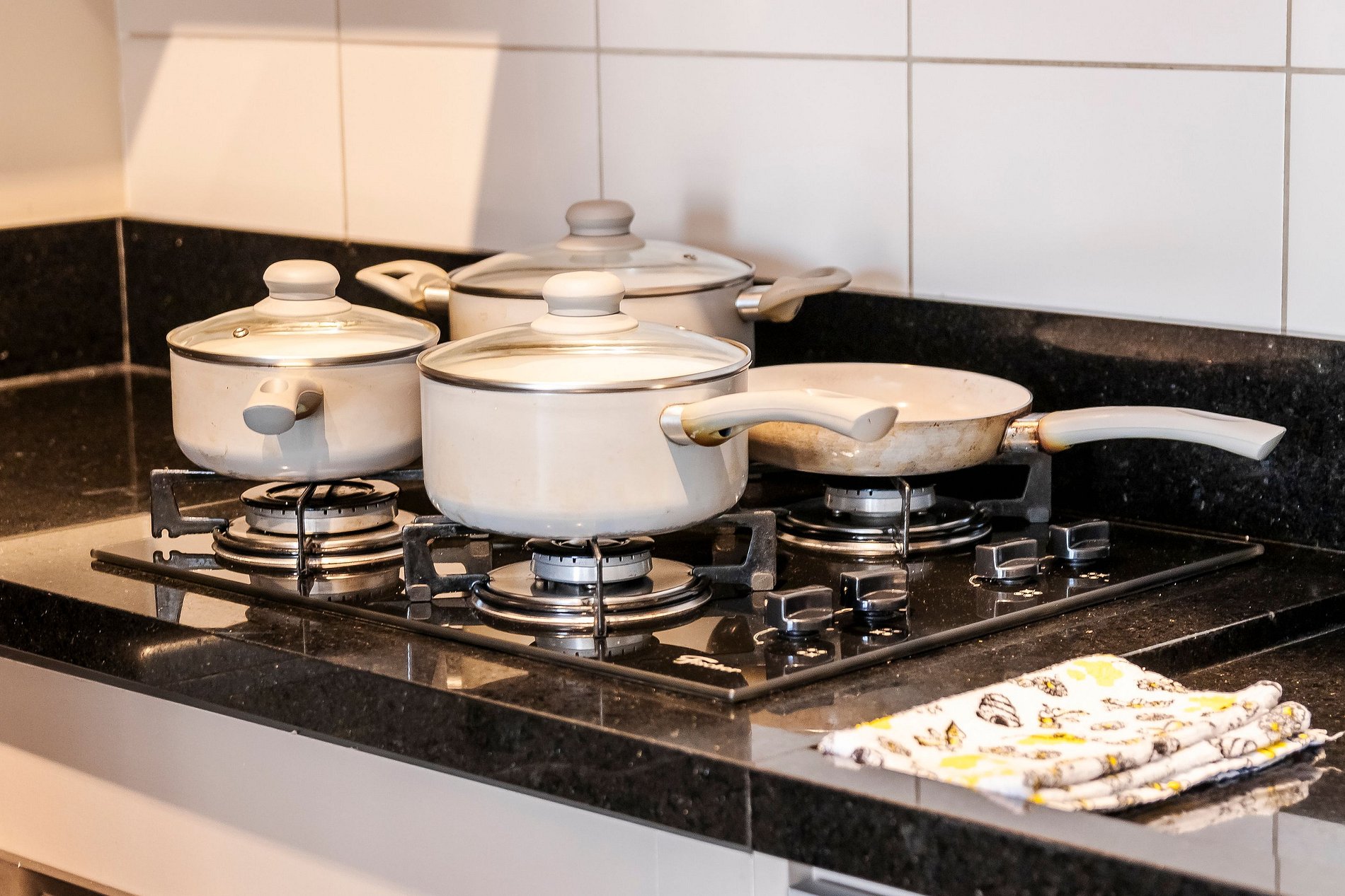 - Cozinha equipada com geladeira, microondas e fogão de quatro bocas e forno.