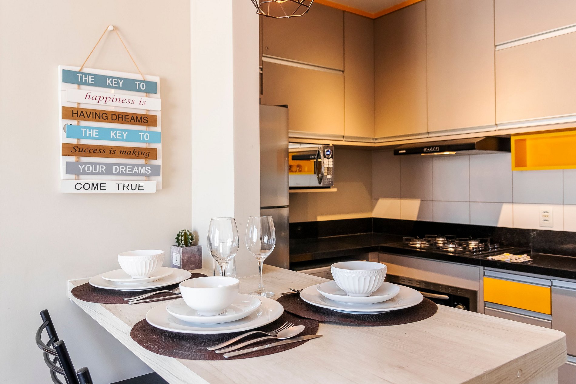 - Cozinha equipada com geladeira, microondas e fogão de quatro bocas e forno.