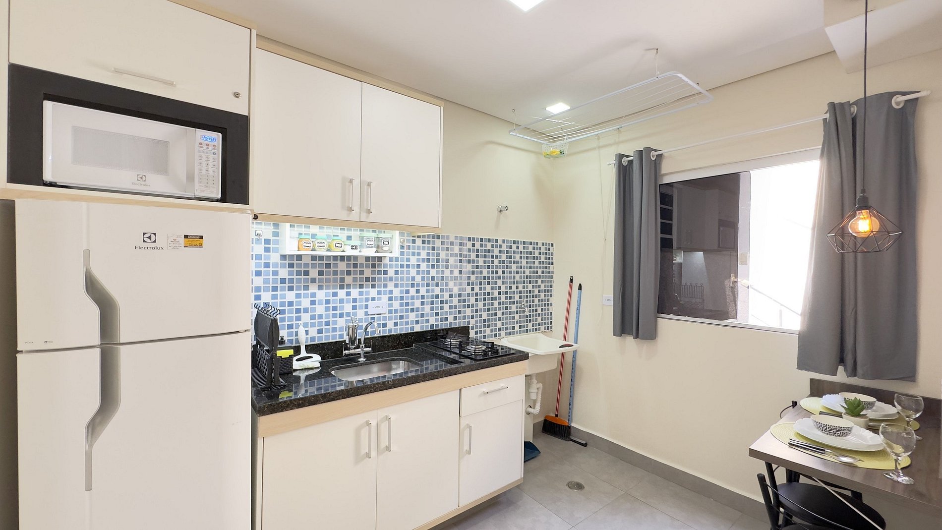 - Cozinha equipada com geladeira, microondas e cooktop de duas bocas.