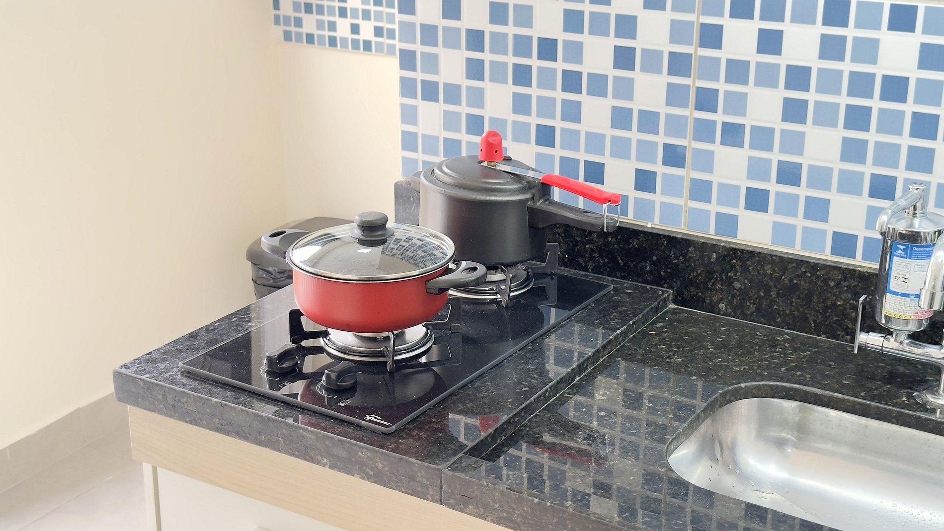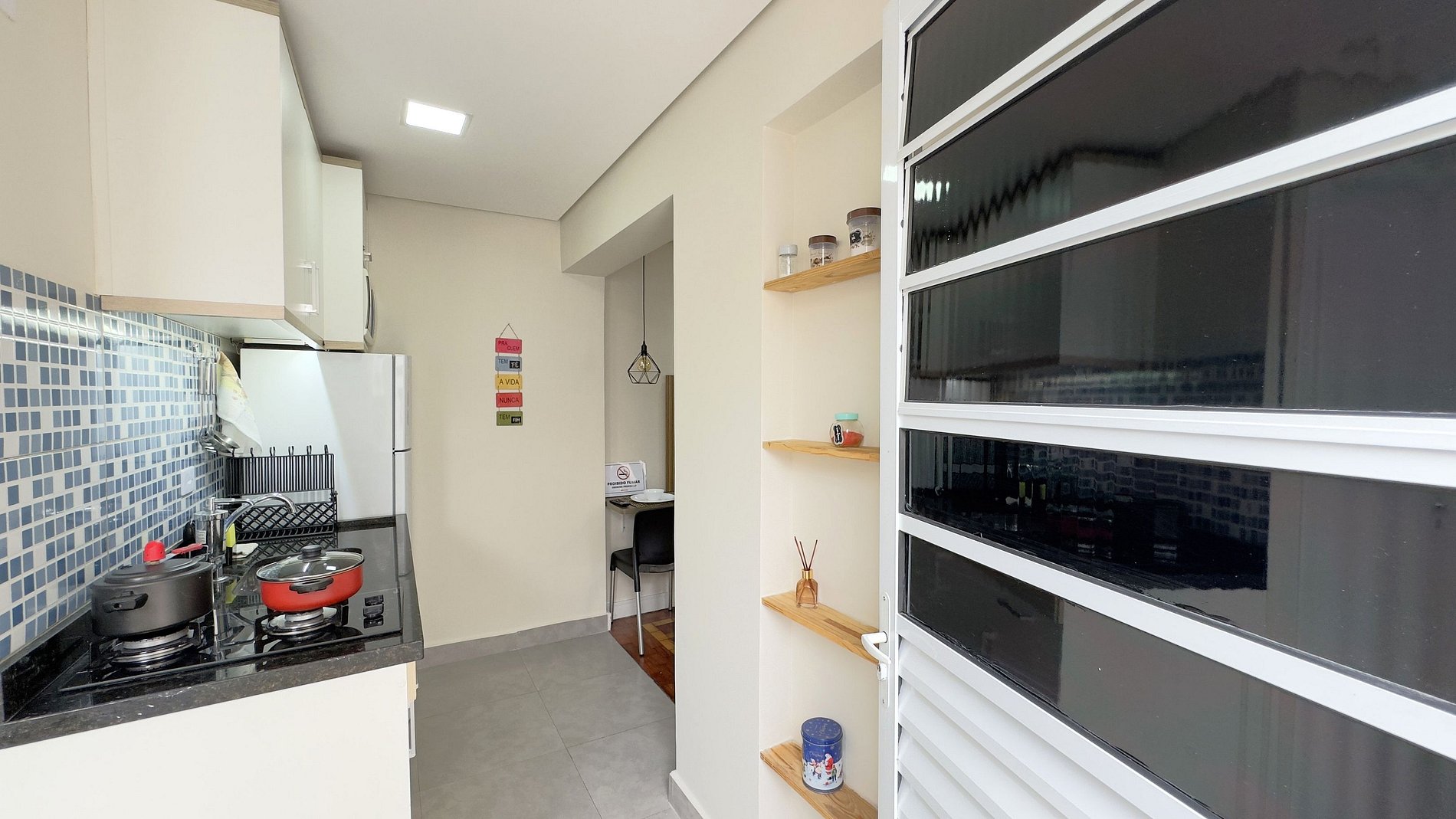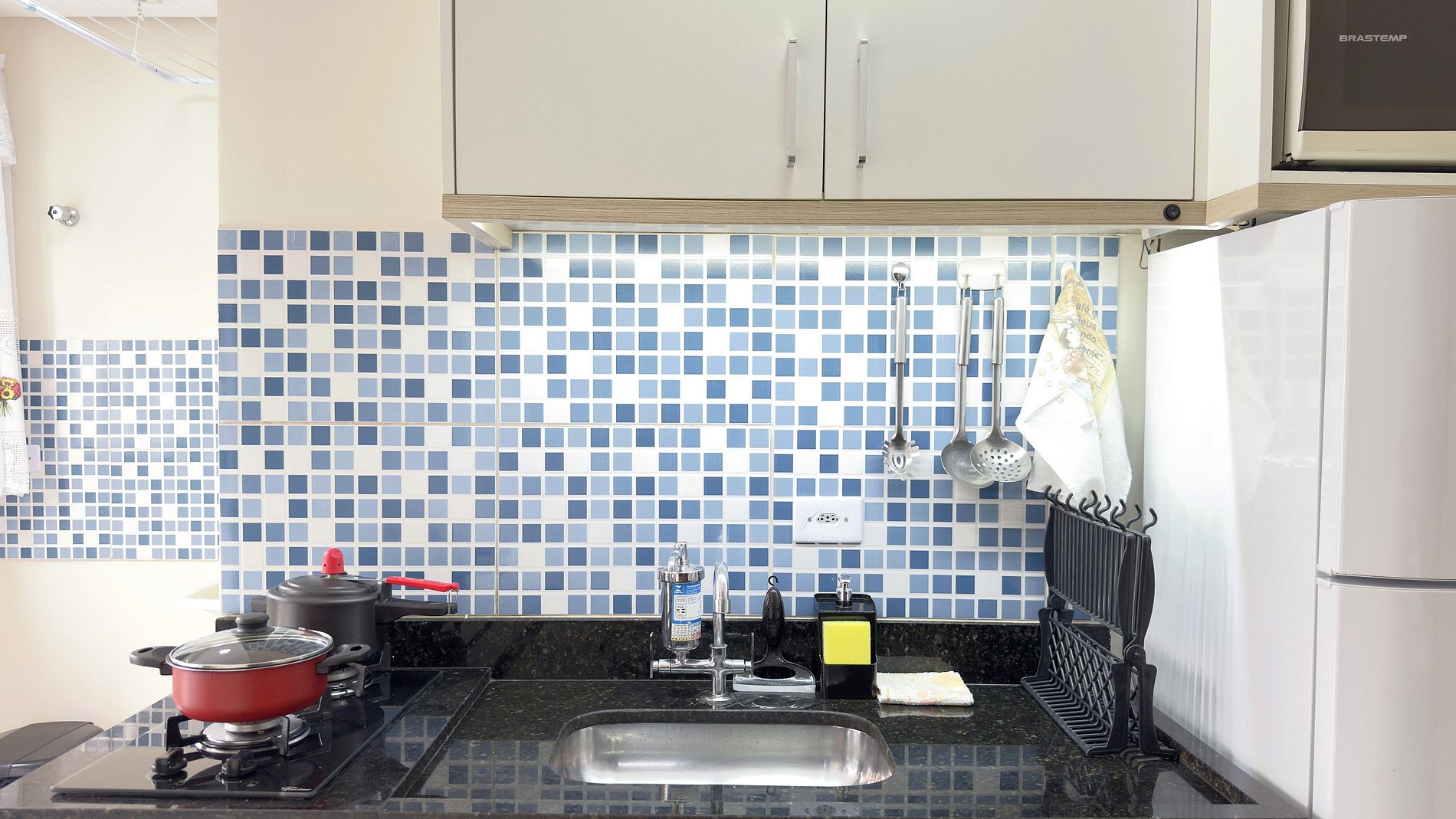 - Cozinha equipada com geladeira, microondas e cooktop de duas bocas.