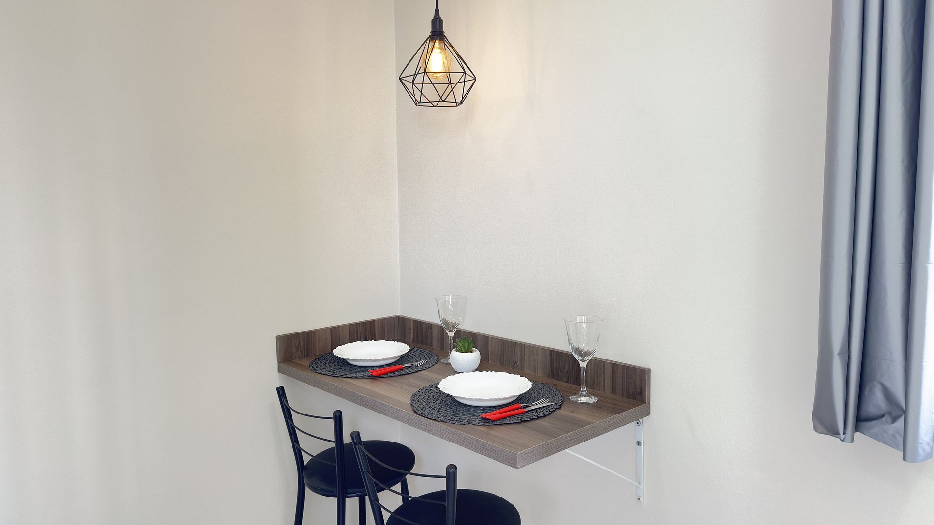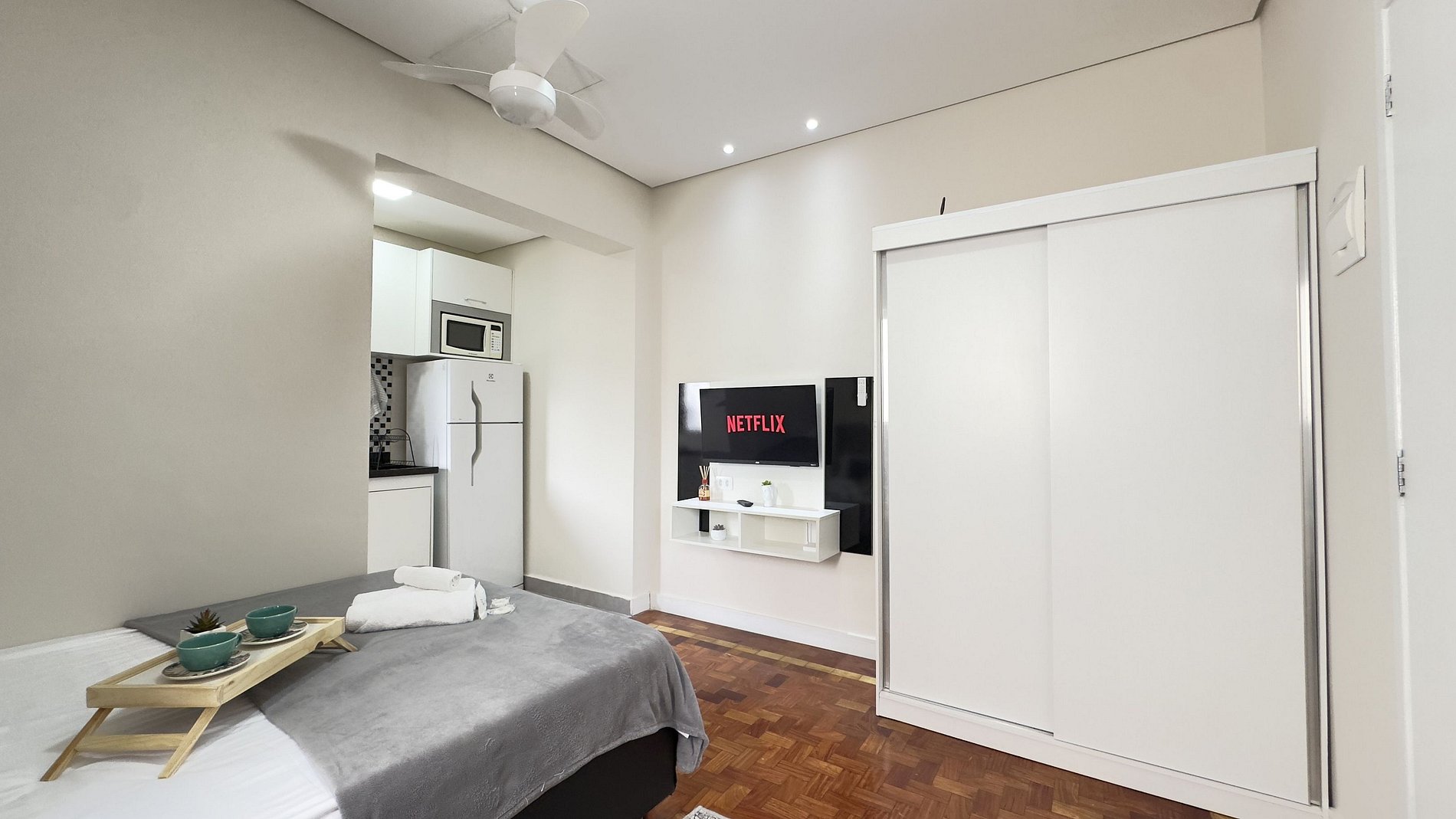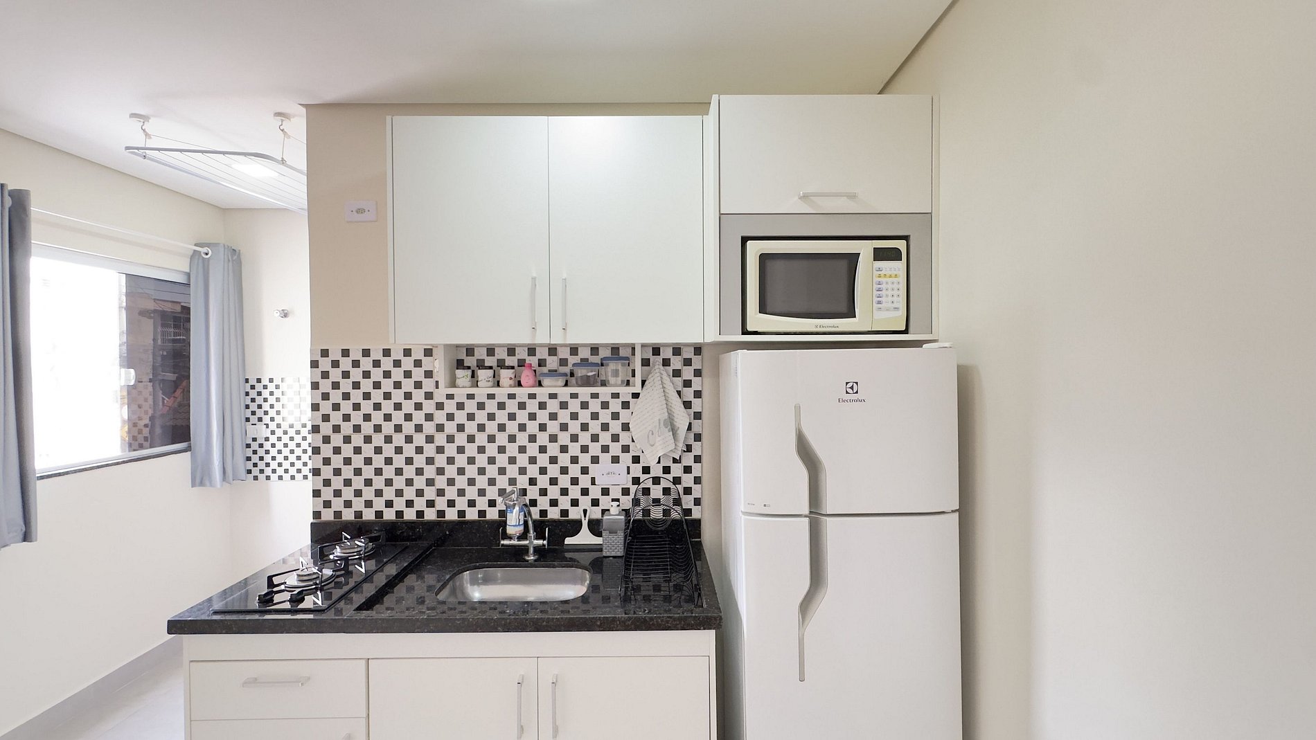 - Cozinha equipada com geladeira, microondas e cooktop de duas bocas.