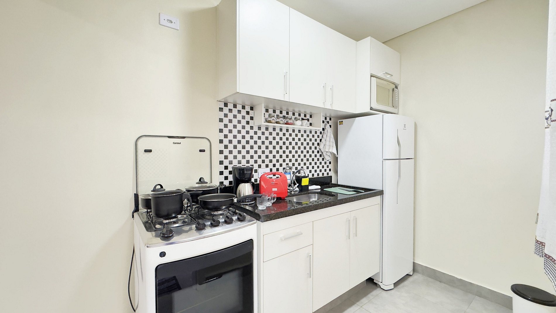 - Cozinha equipada com geladeira, microondas e cooktop de duas bocas.