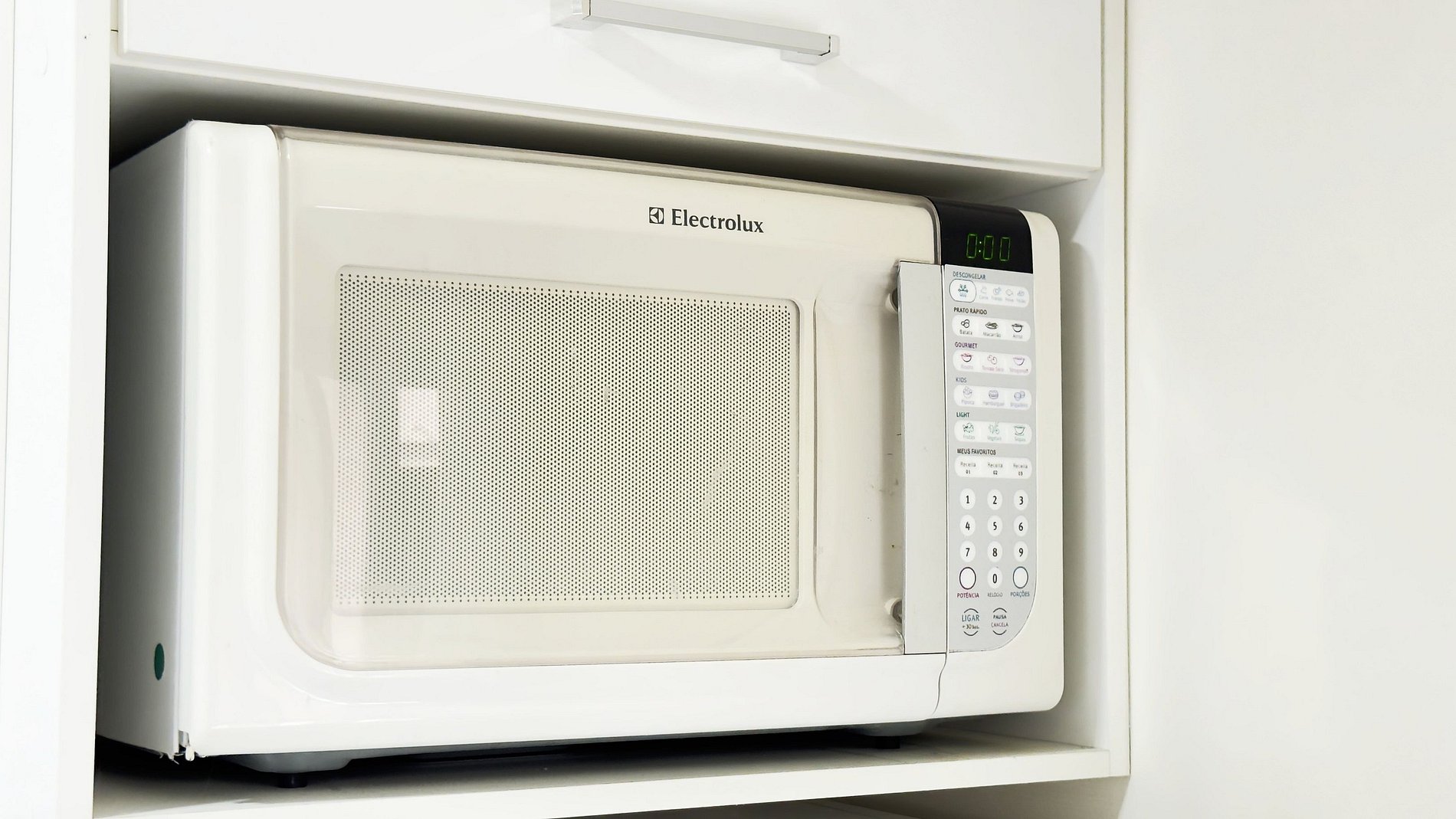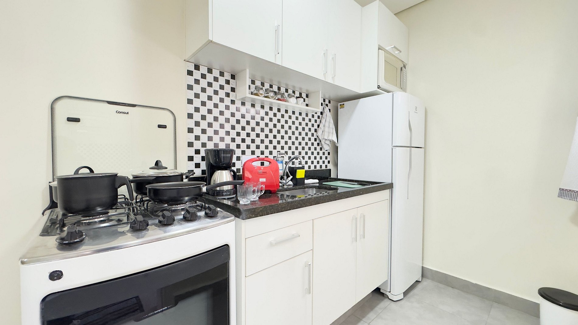 - Cozinha equipada com geladeira, microondas e cooktop de duas bocas.