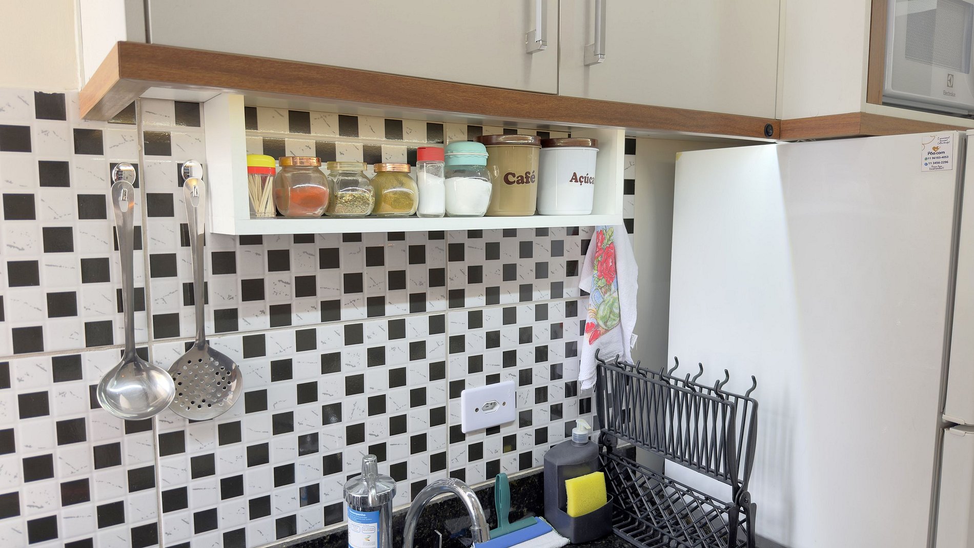 - Cozinha equipada com geladeira, microondas e cooktop de duas bocas.