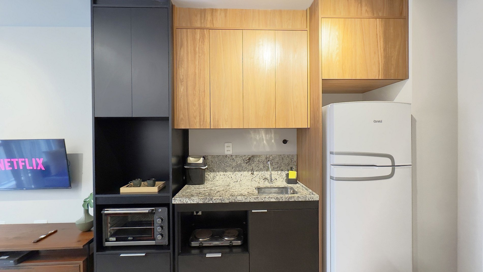- Cozinha completa, equipada com geladeira grande, cooktop de duas bocas e demais utensílios.