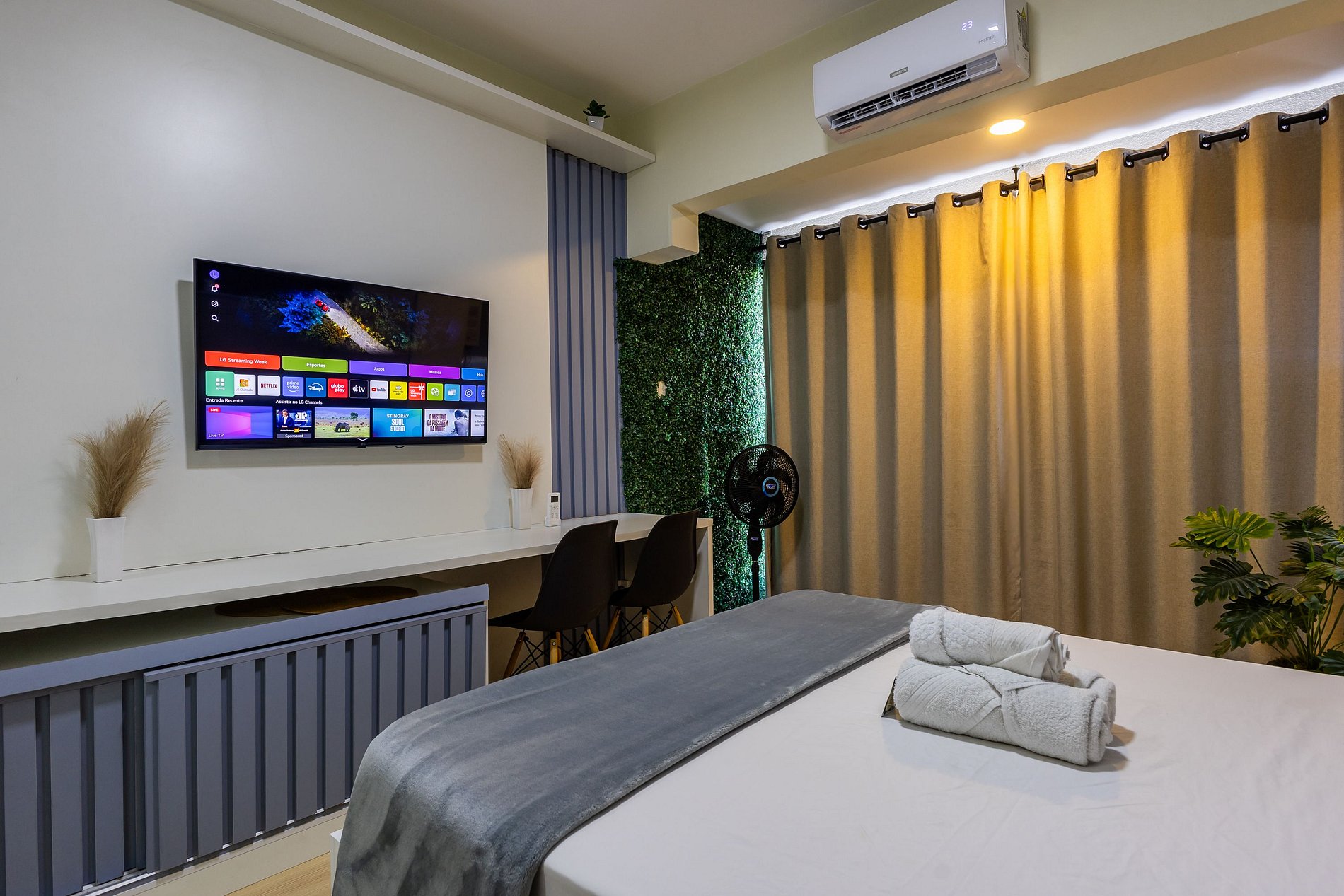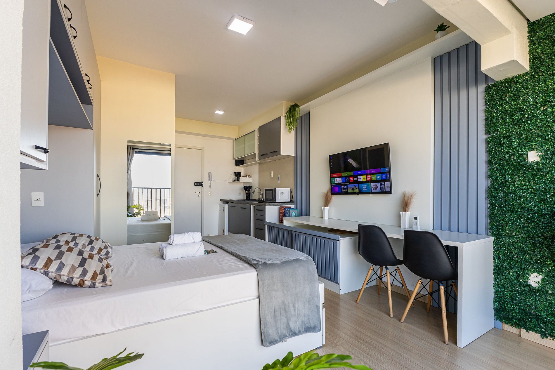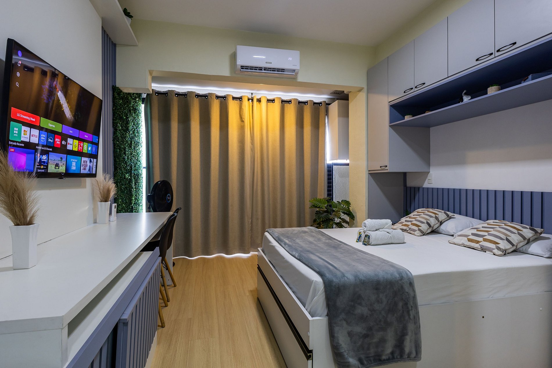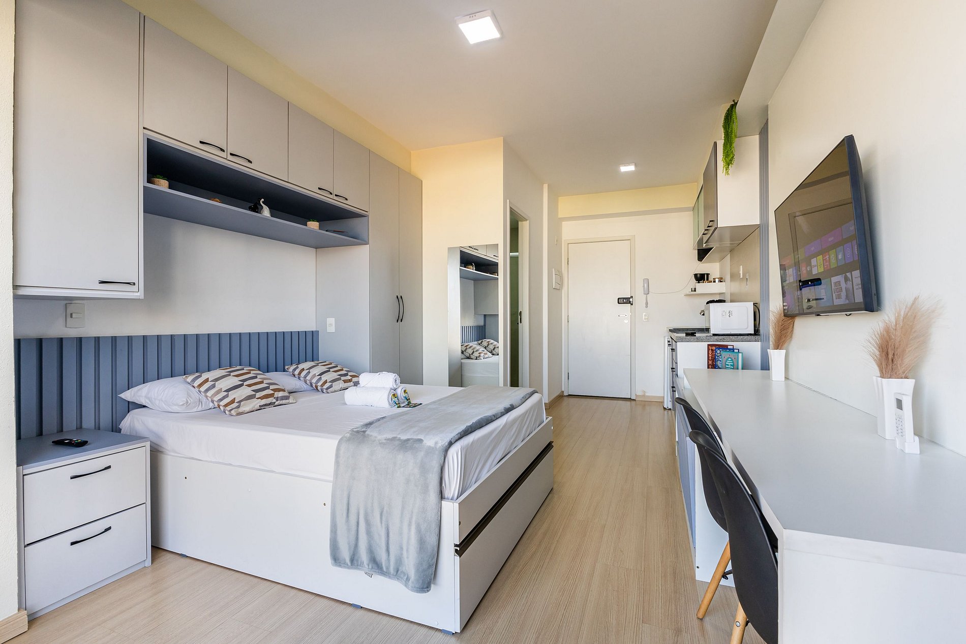 Os hóspedes podem acessar áreas comuns como Piscina, Mini Mercado, Rooftop, Coworking e Lavanderia.