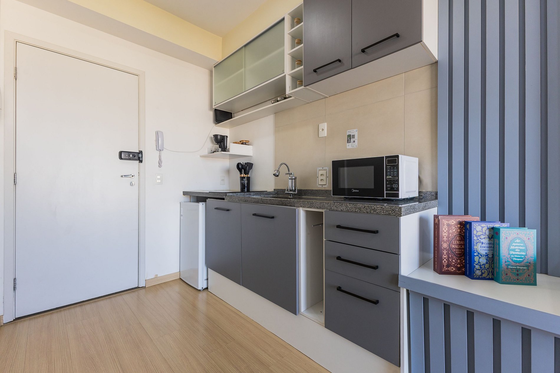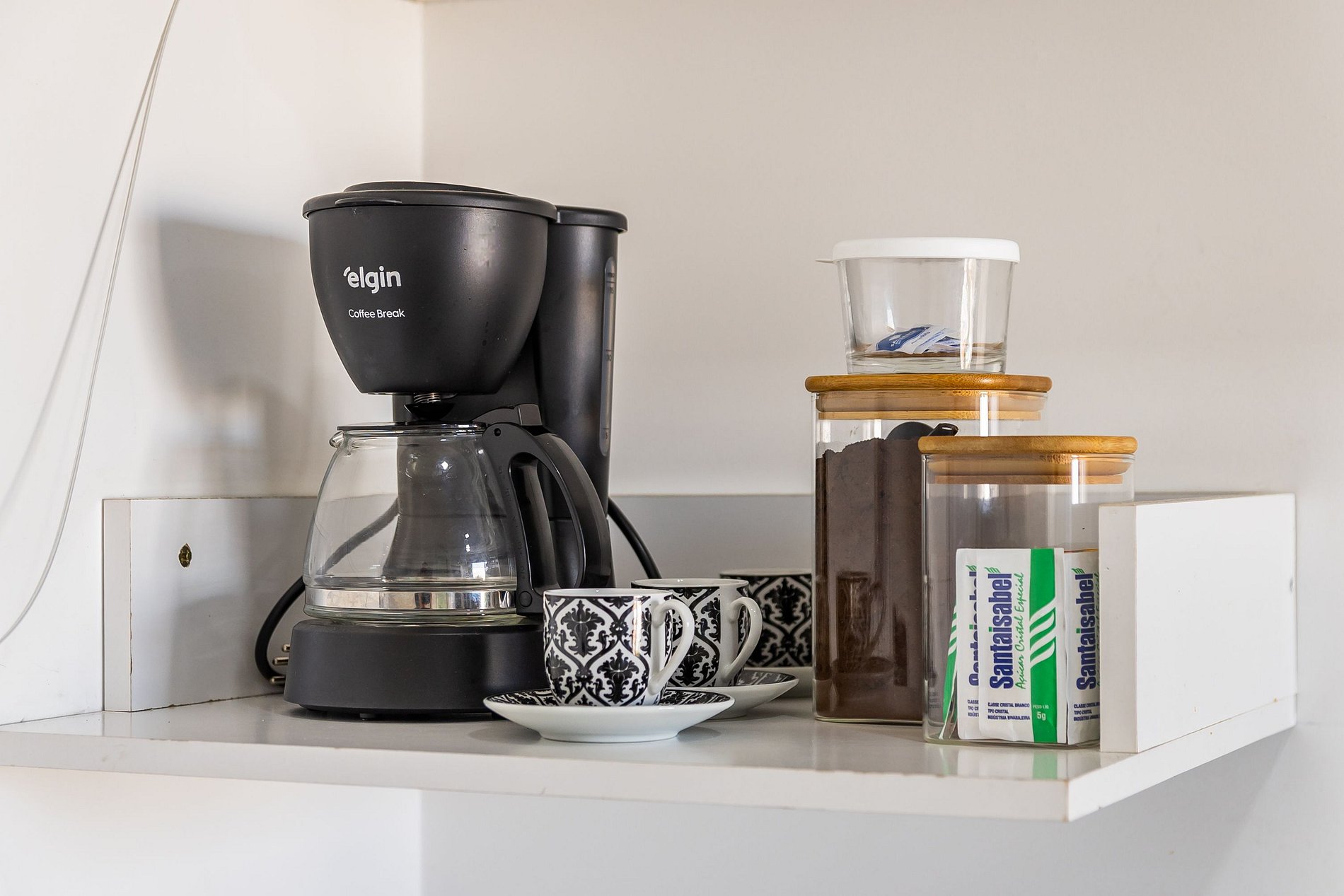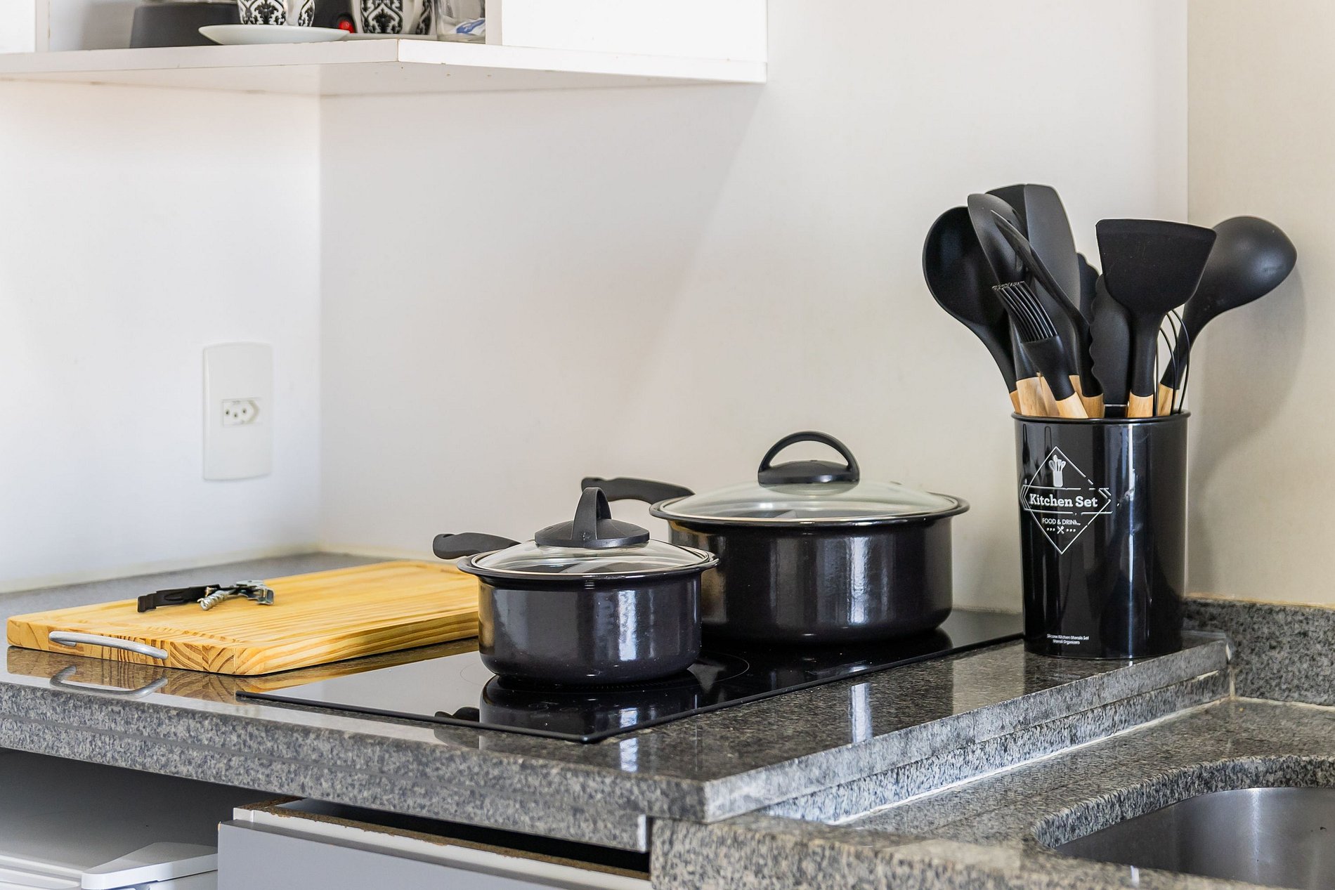 - Cozinha completa, equipada com geladeira, microondas, cafeteira elétrica, panelas, cooktop de indução de uma boca e demais itens
