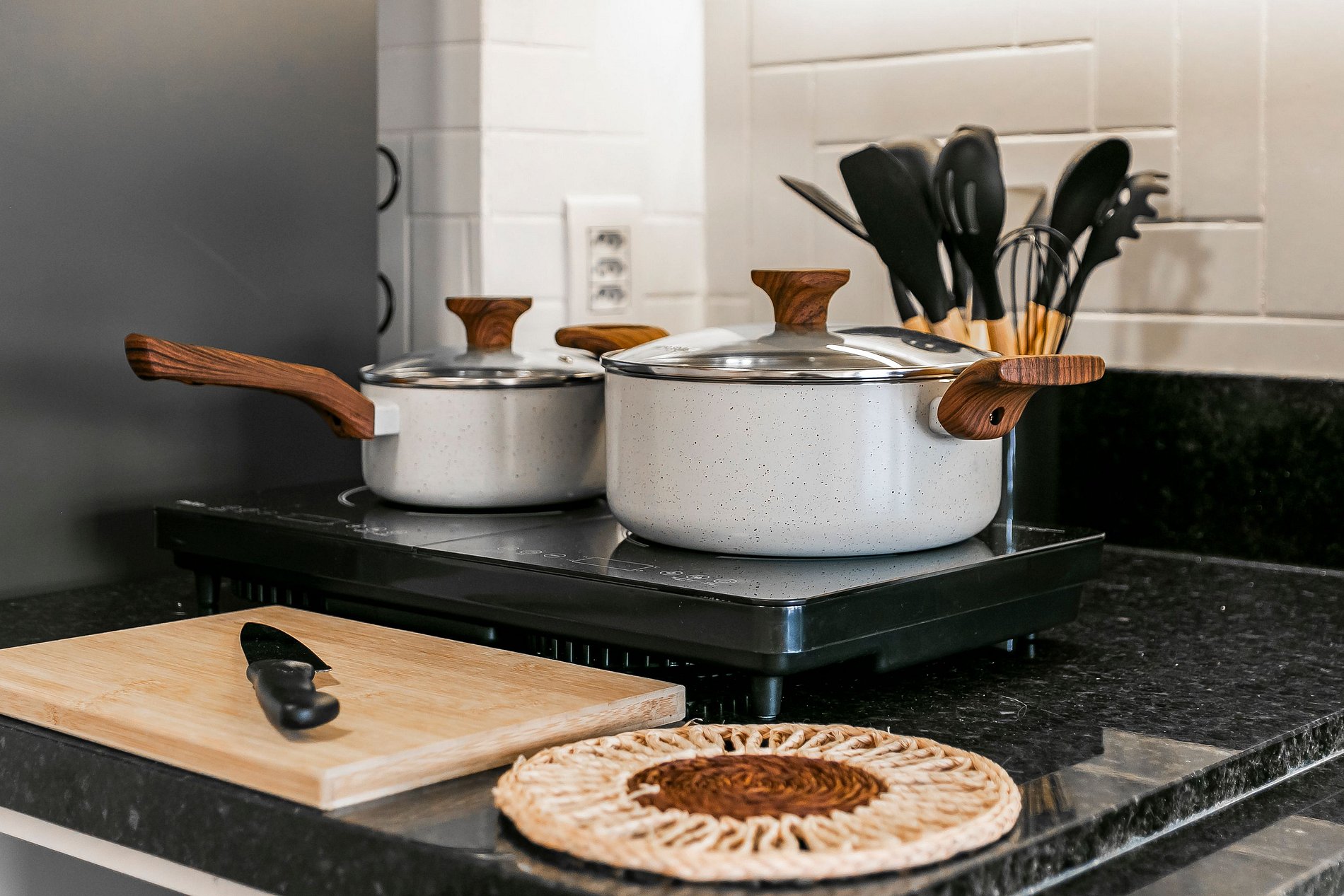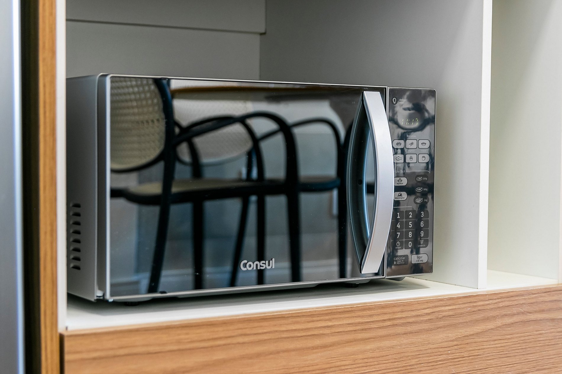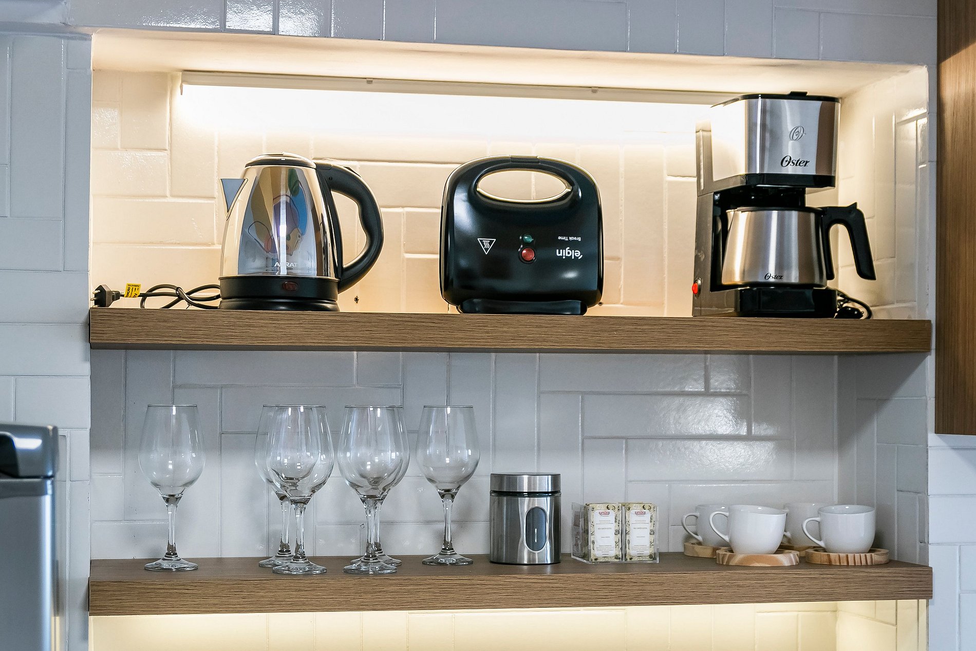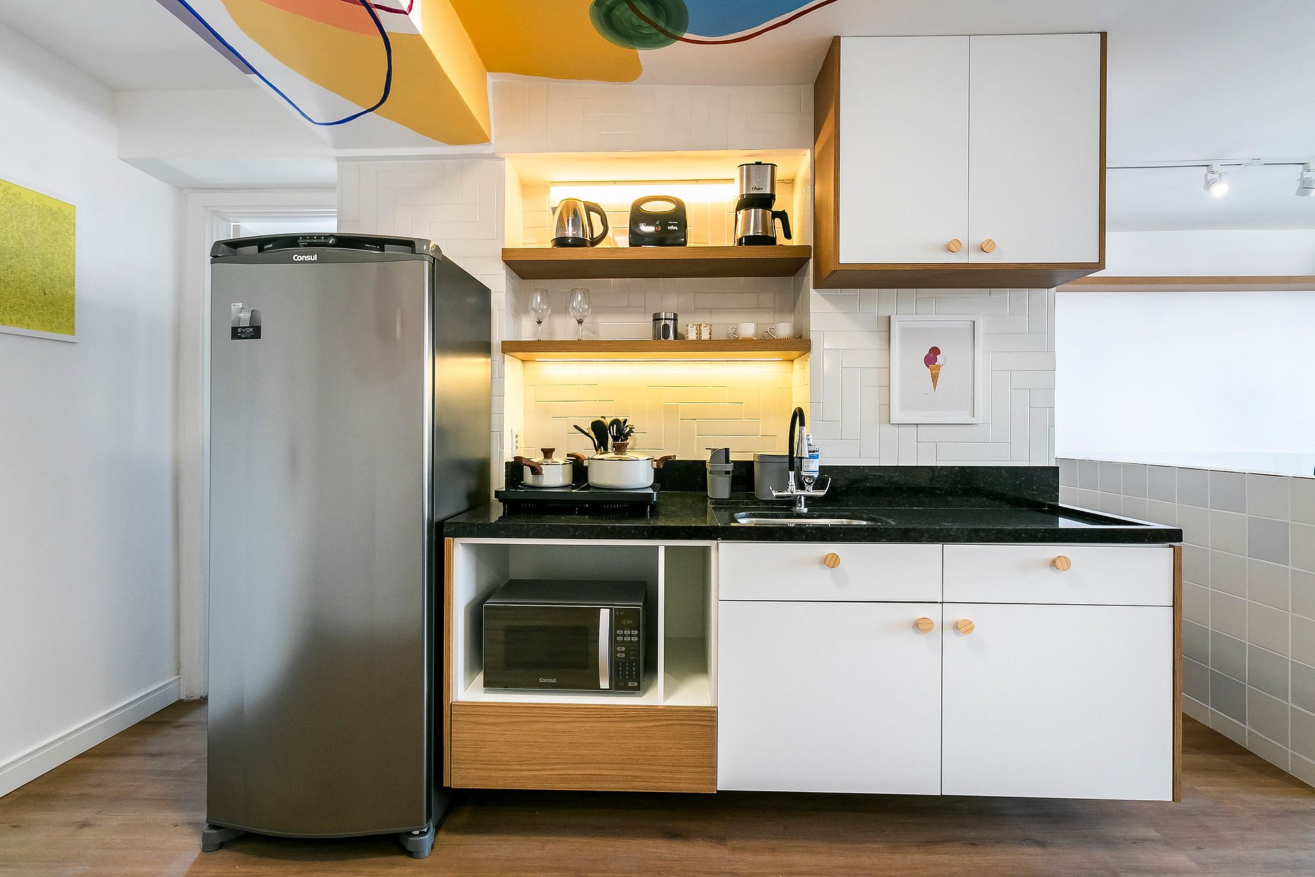 - Cozinha equipada com geladeira, microondas, cooktop de duas bocas e demais utensílios.