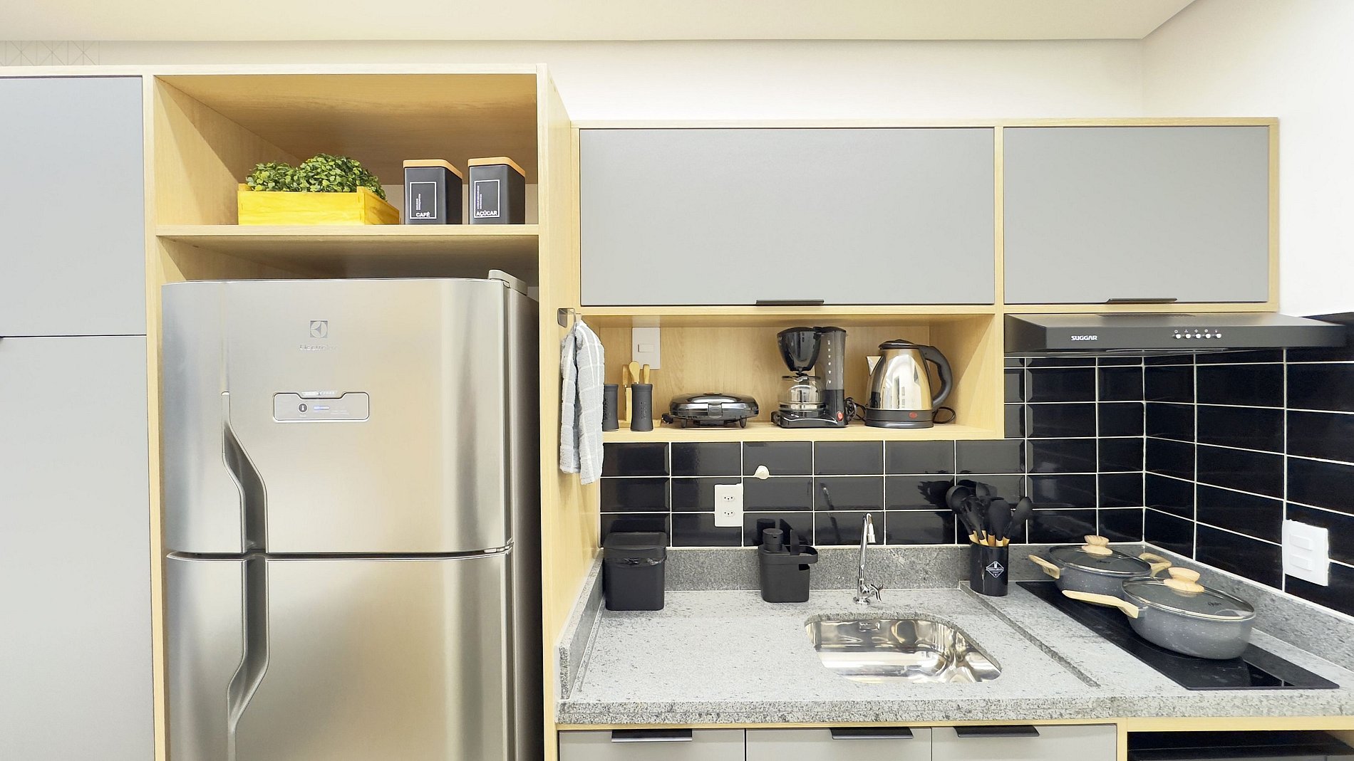 - Cozinha completa, equipada com geladeira, microondas, cafeteira, chaleira, panelas, cooktop de indução de duas bocas e demais itens para poder preparar suas refeições!