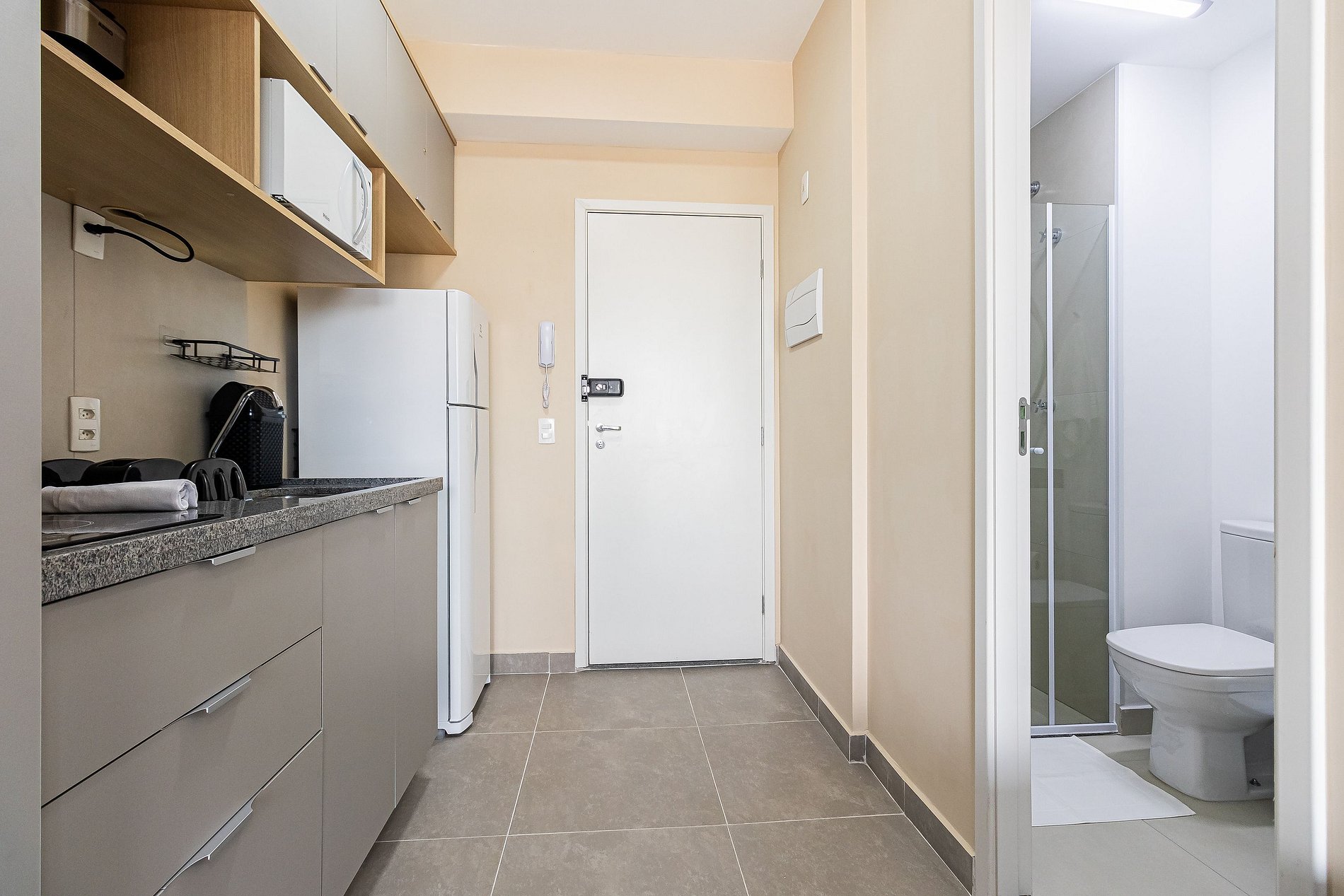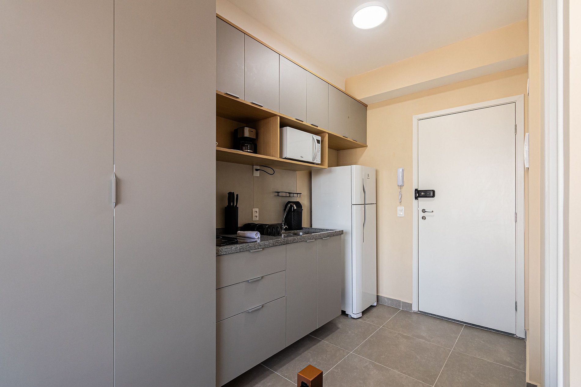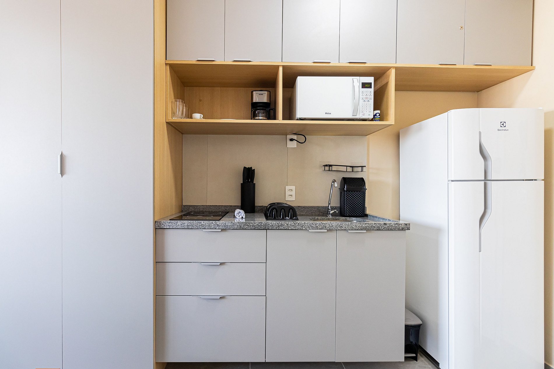 - Cozinha completa, equipada com geladeira, microondas e cooktop de indução de duas bocas