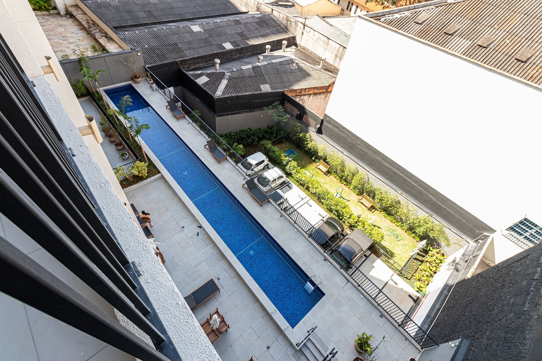 Os hóspedes podem acessar áreas comuns como Piscina, Mini Mercado, Rooftop, Coworking e Lavanderia.